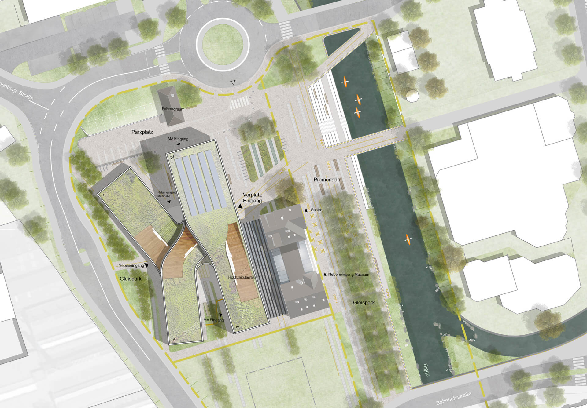 In the southern section of the site the volume nestles against the old station building and rises highest where it traces the Bigge River, which generates both a new urban periphery and creates a new urban centre. The design was submitted to the competition for the realization of the New Build Community Centre (Town Hall with museum) and received a distinction as well as the first prize for the ideas section.