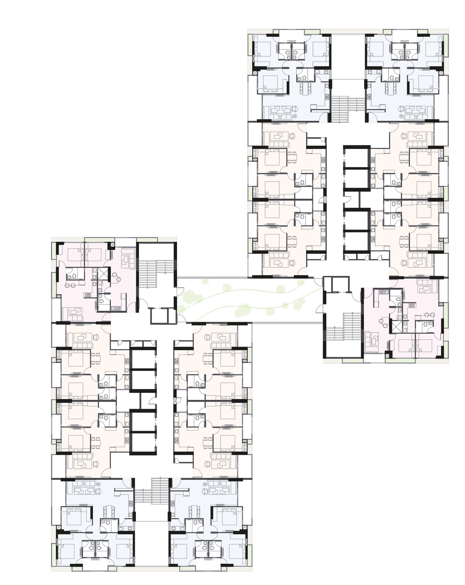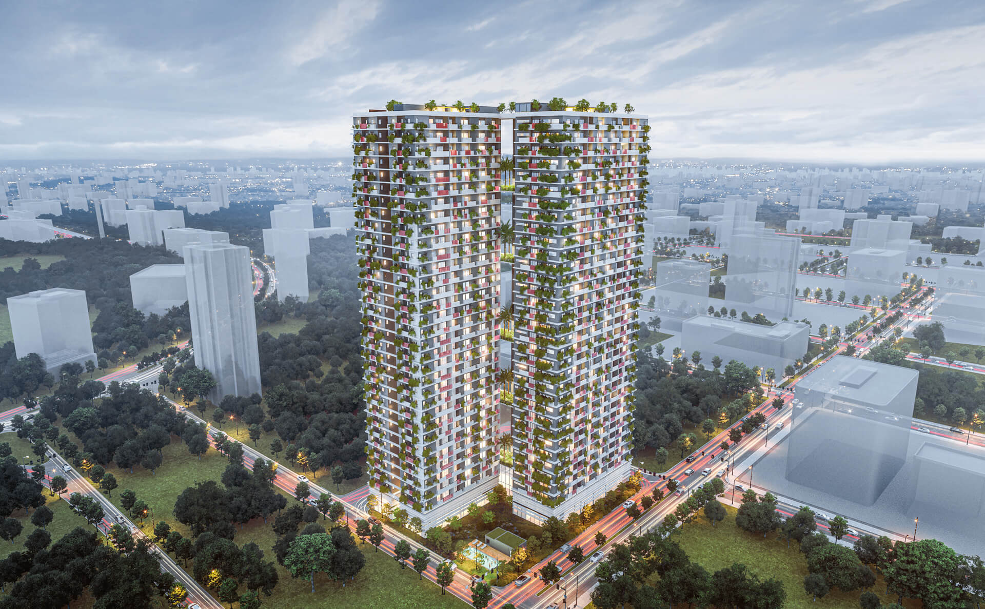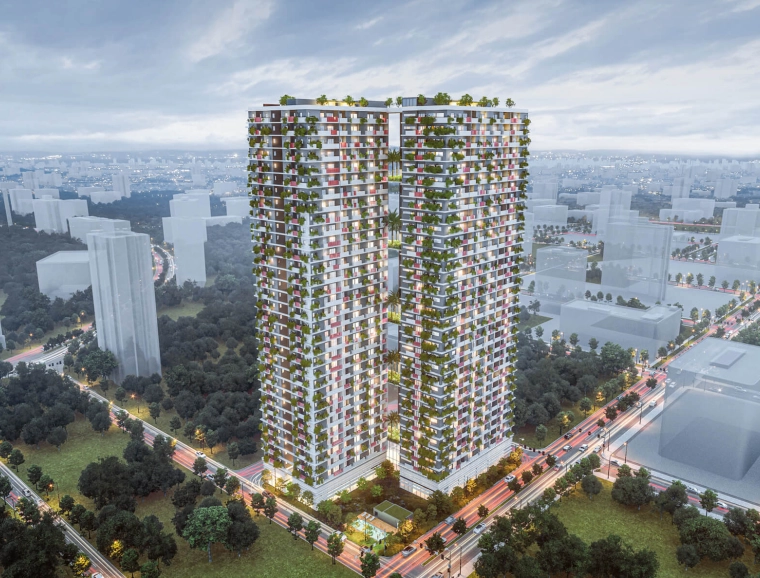 Two 117-meter-high towers linked by six air bridges feature customized, highly functional apartments with a breathtaking view out over the young quarter of town. The façades are in part covered in greenery, lending the building a special aura and providing added value for both the location and the residents.