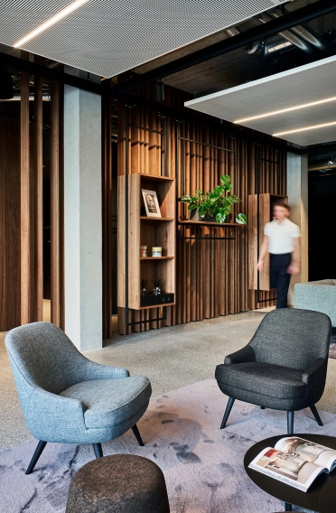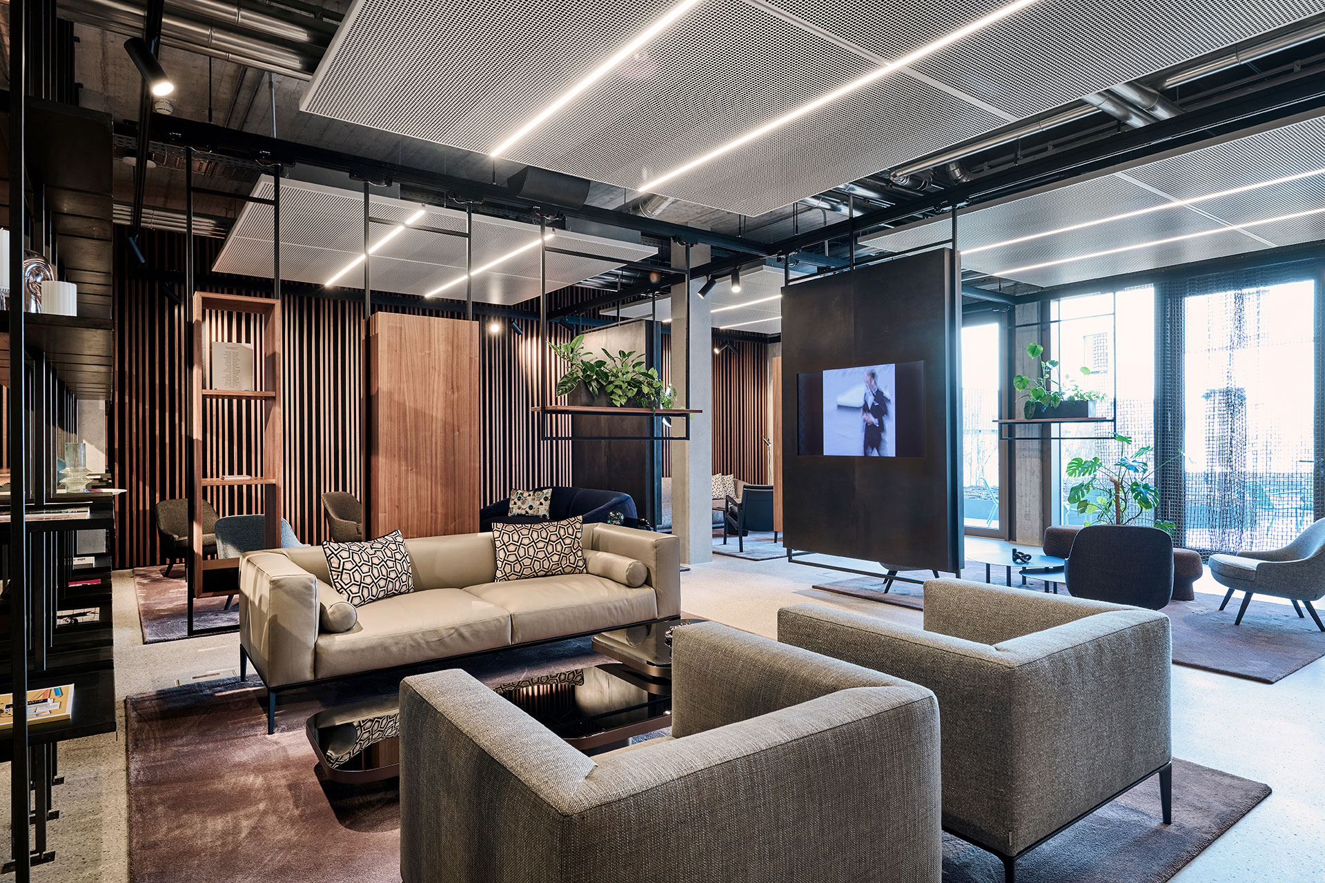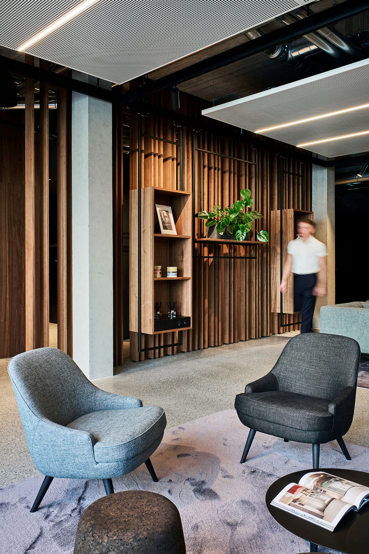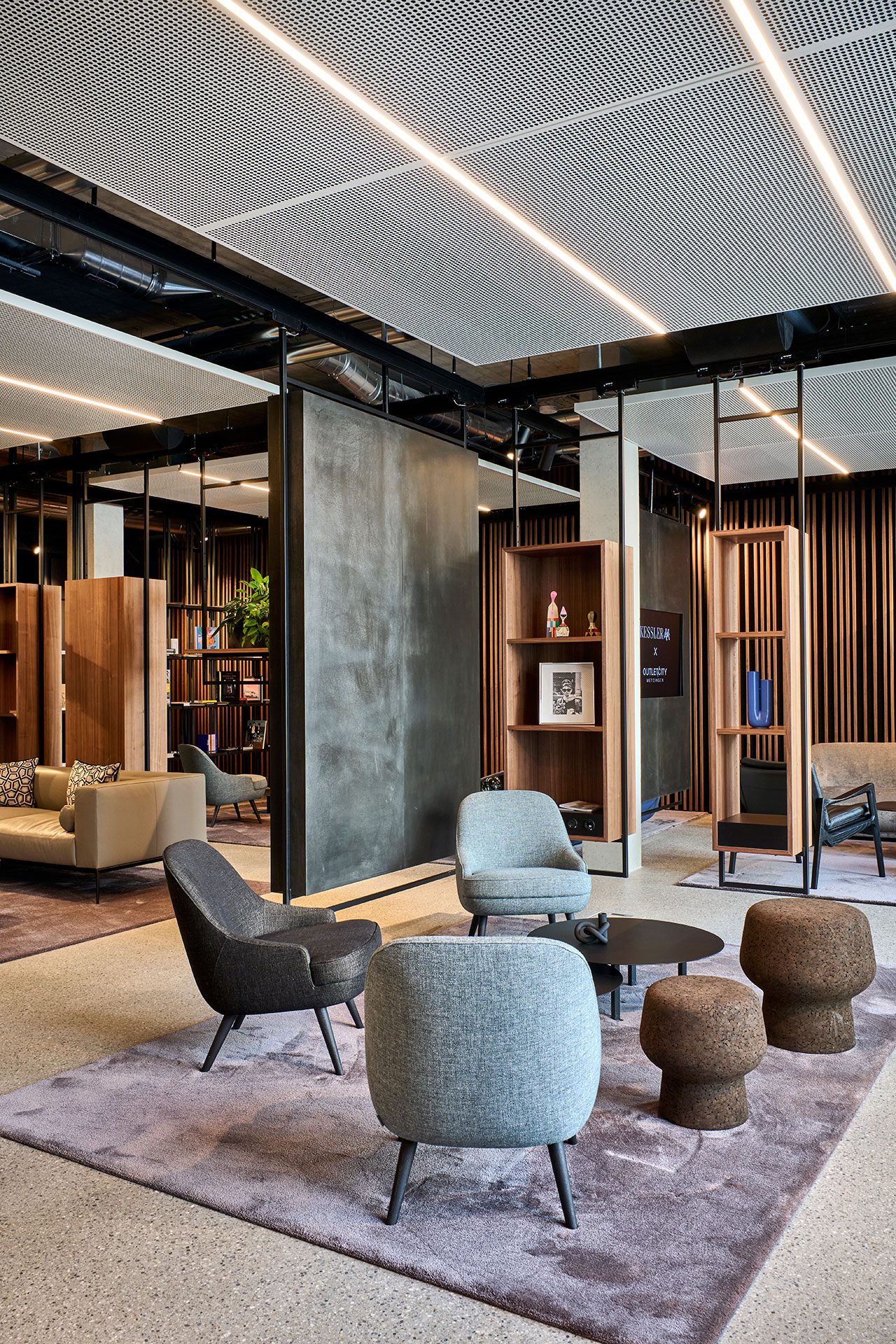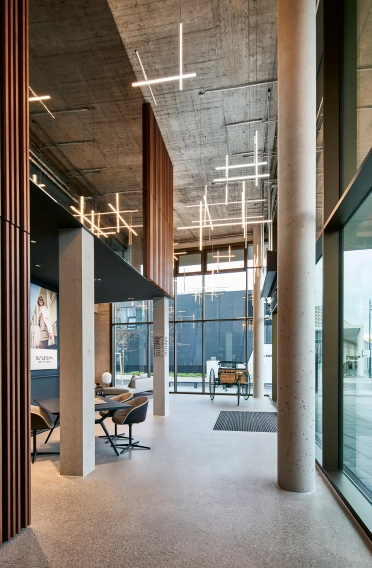 The architecture of the Welcome Centre reflects the exclusivity and quality that are characteristic of Metzingen. This is also reflected in the materials: exposed screed with a terrazzo finish in a grey base colour with varying aggregates and wall panelling made of walnut and brushed stainless steel set elegant accents. The exclusive furnishings from ClassiCon and Walter Knoll underline the outstanding quality of the Welcome Centre.