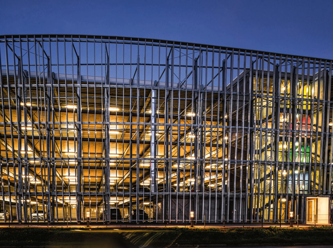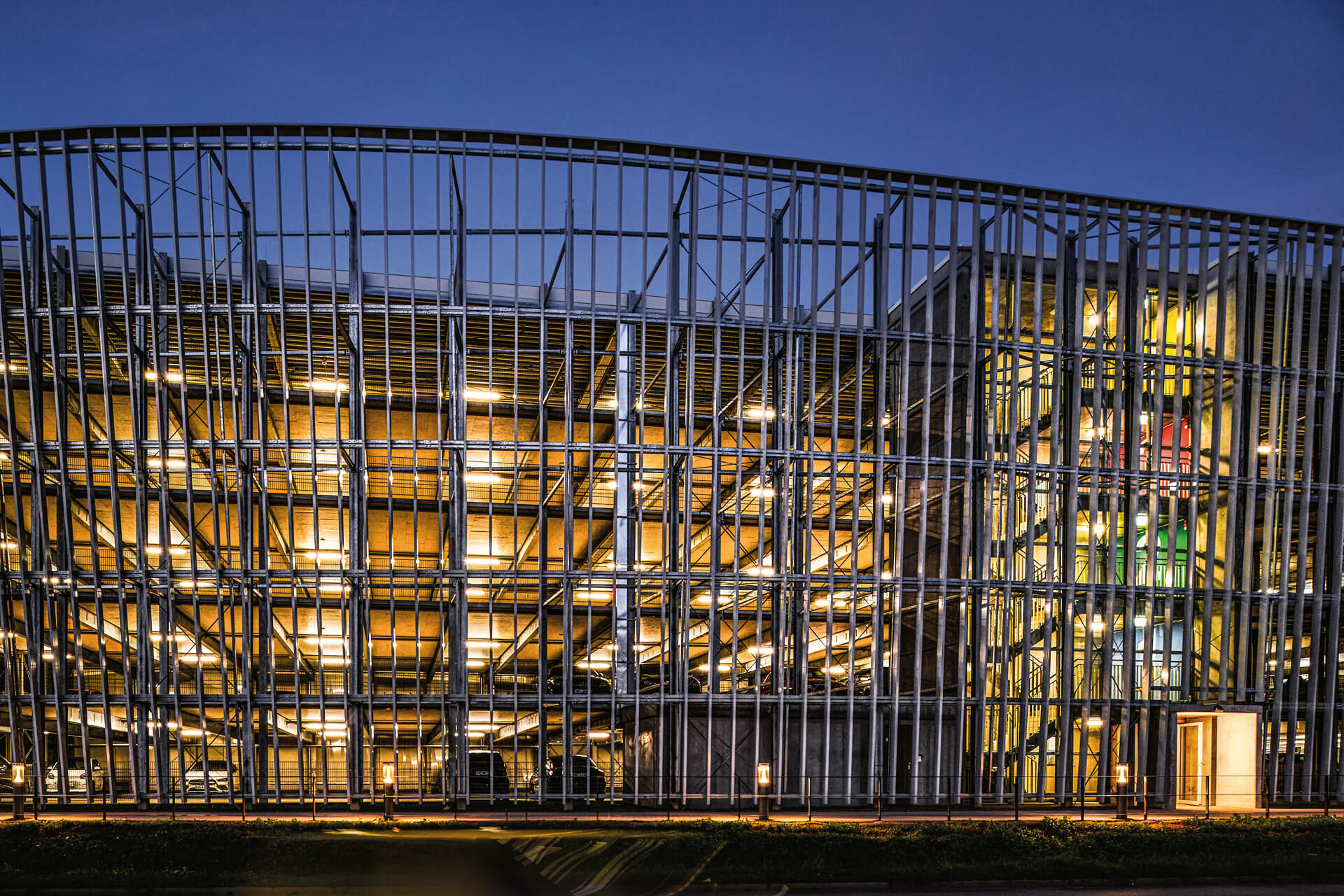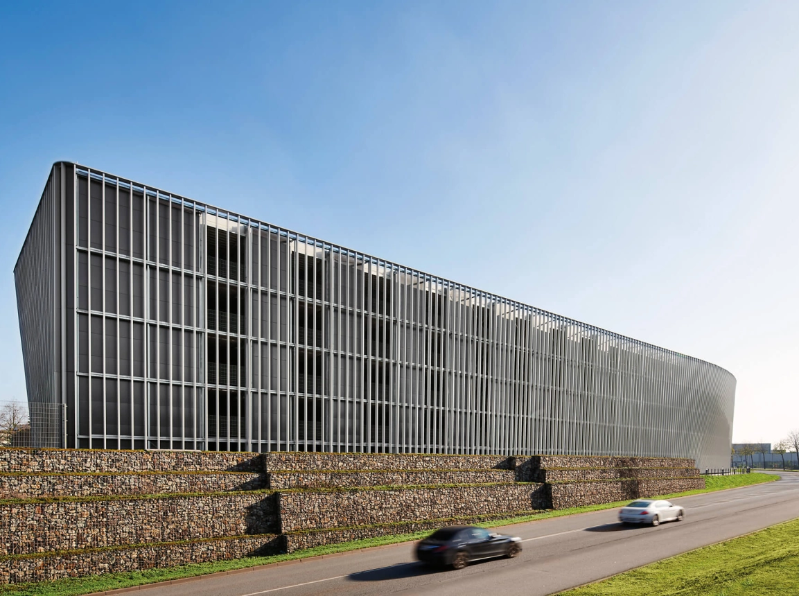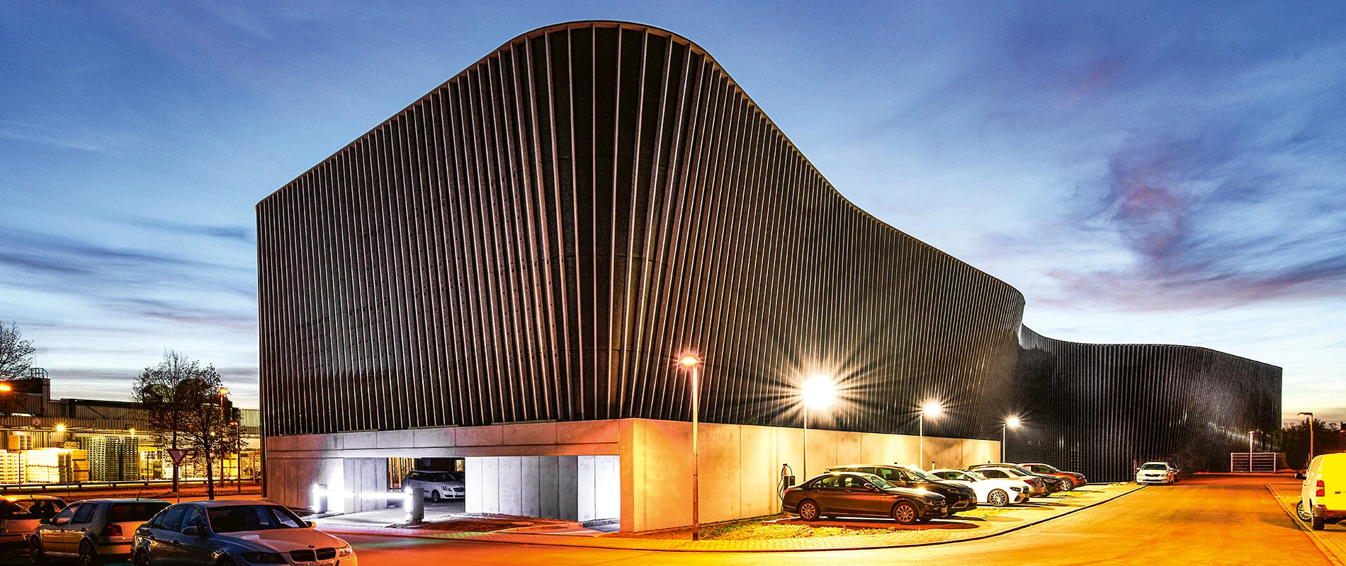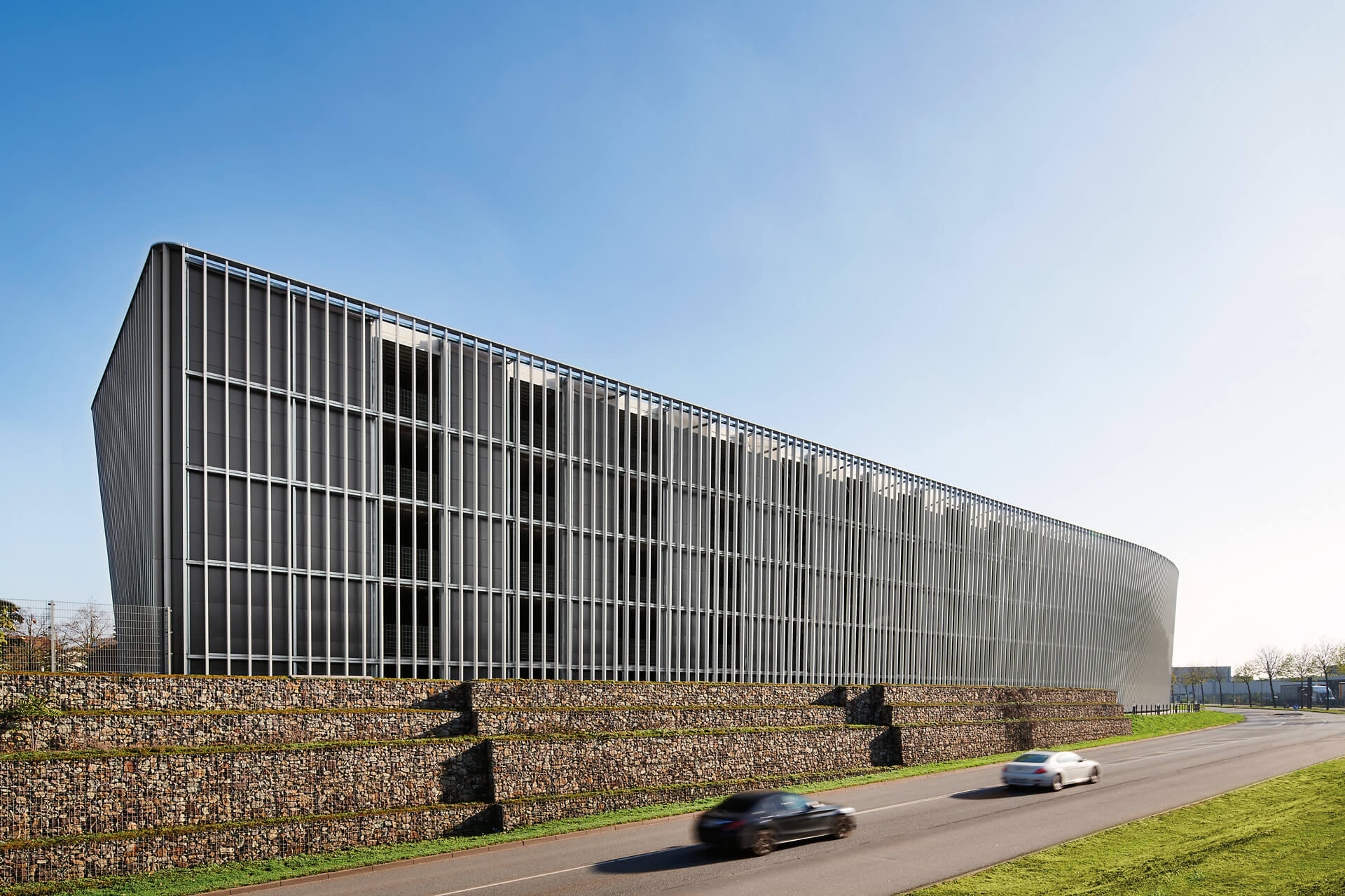 Winning 1st Prize in the competition for designs for the new build of a multi-storey carpark, the proposal stands out for its curved outer shape and interfaces in the urban fabric between the Mercedes-Benz works and local housing. A metal louvre structure is giving the façade its structure. It generates a flowing construct which opens upwards to support noise insulation and has slits for light and ventilation. By virtue of the perforation on the sides the louvres can function as a substructure on which plants can be placed, creating a favourable micro-climate.