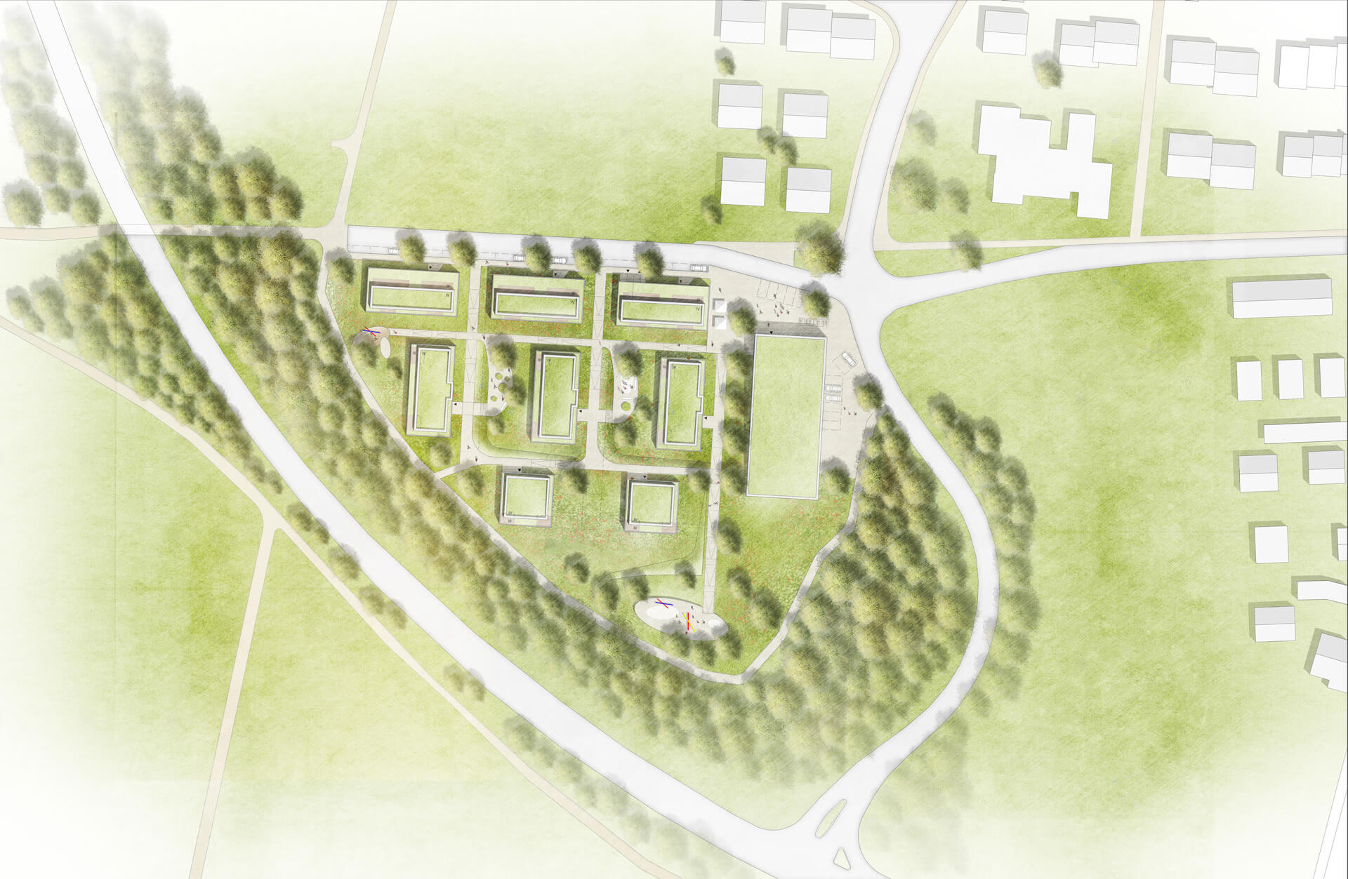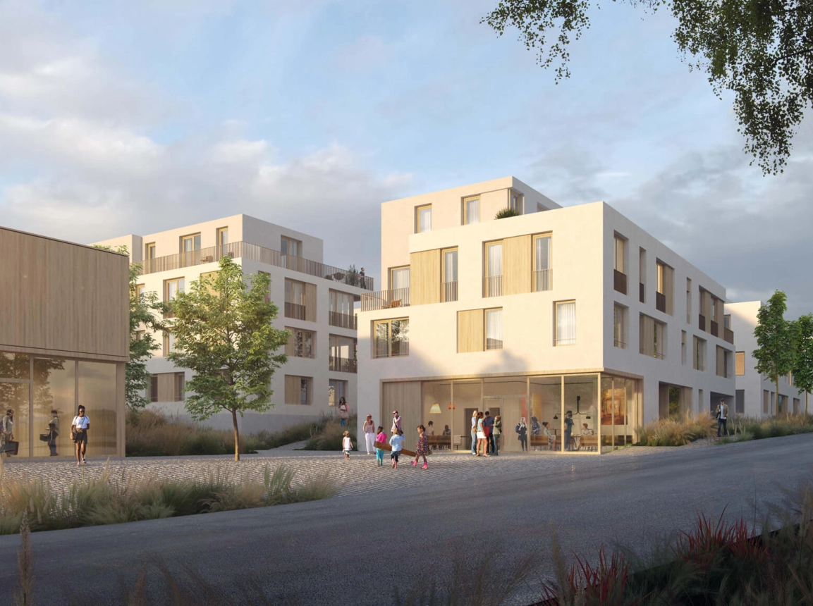 The new district with 75 residential units is destined to function as the outer limit of Remseck’s Aldingen district while also linking existing and future neighbourhoods. Characteristic features include a densely planted noise barrier, which encloses the quarter on three sides, and site access from north to south. Inclusion of three different housing typologies – terrace housing in north-south and east-west directions, as well as two standalone blocks – means several green courtyards are created, while spatial quality and natural lighting are exploited to the full. And thanks to a shared underground car park, the district itself remains free of cars.