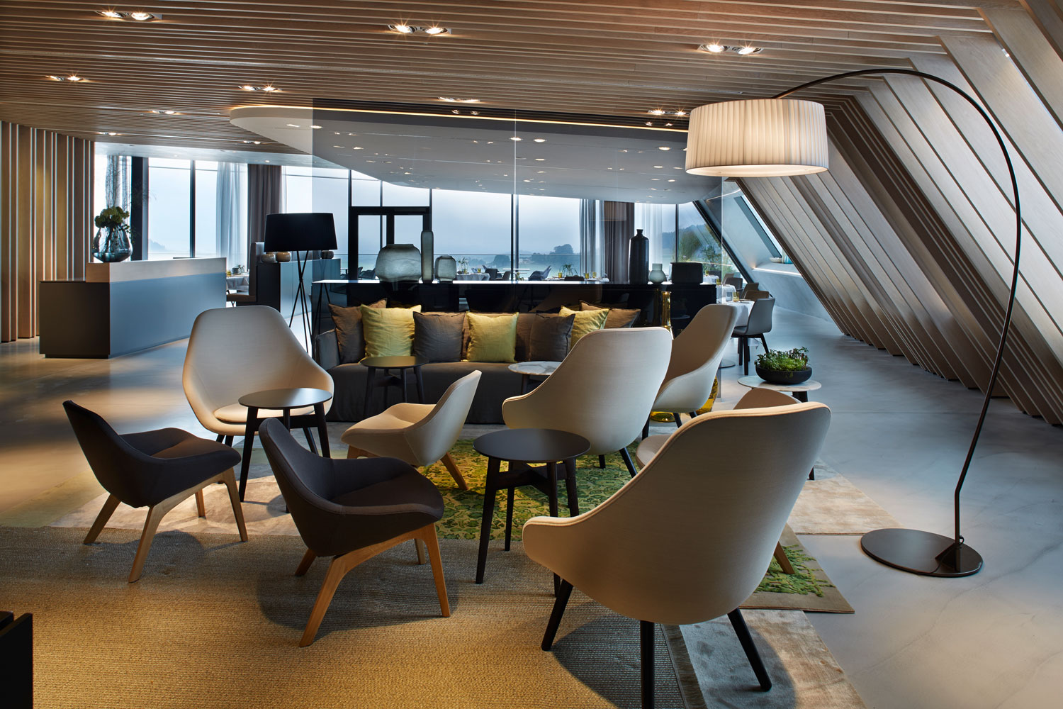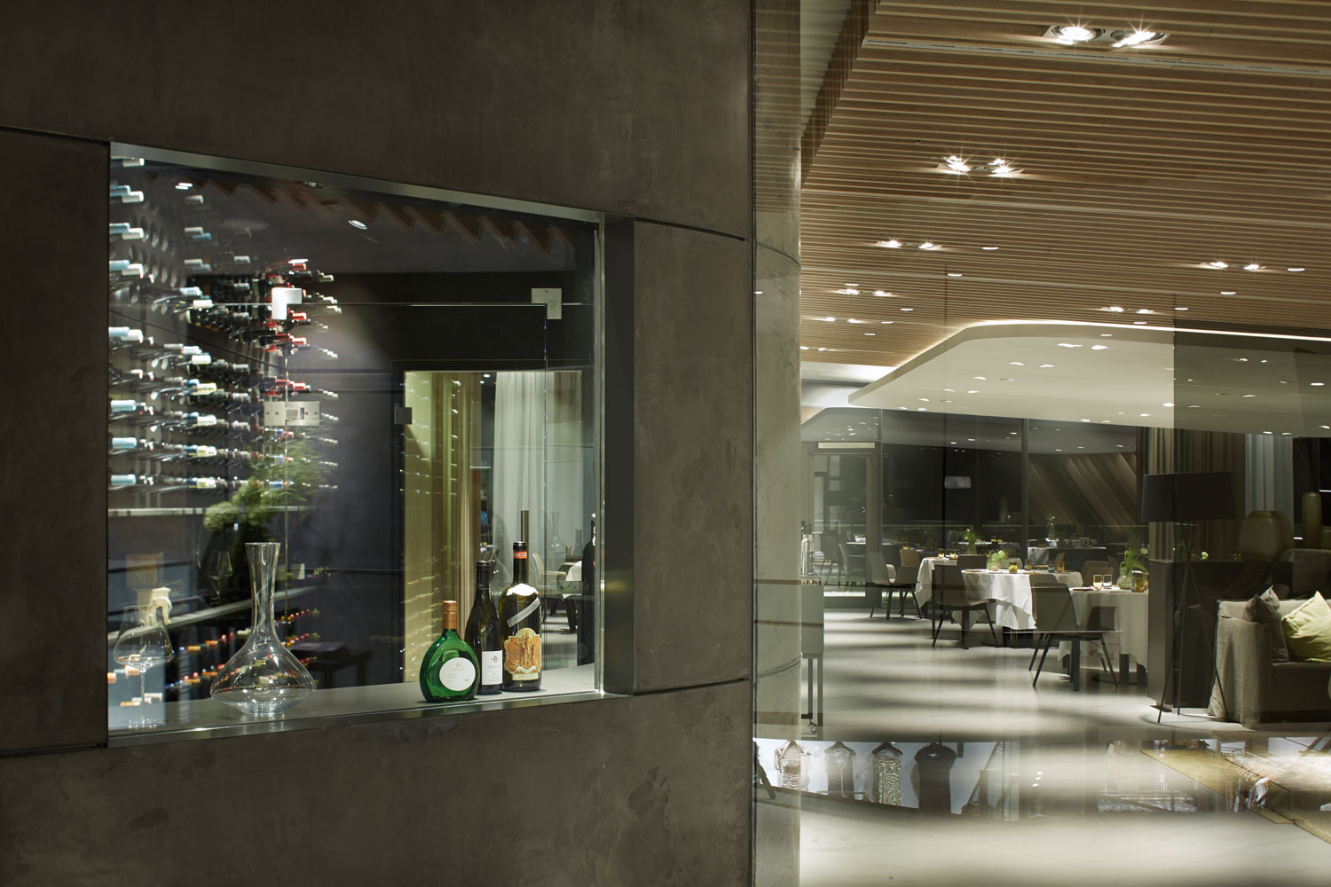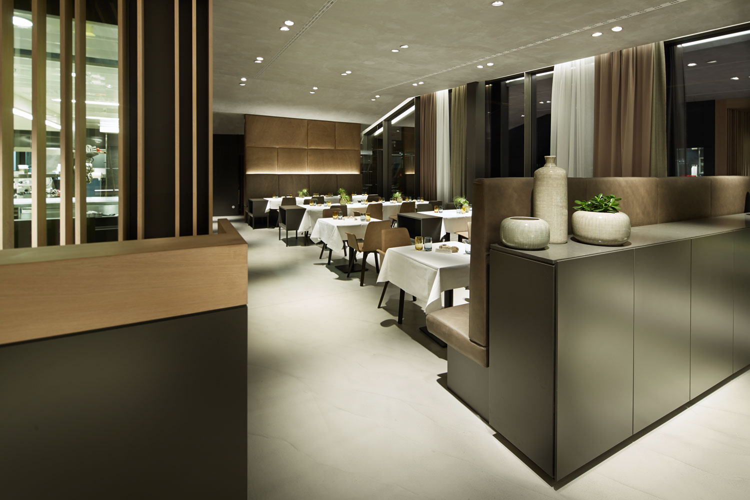 At the entrance, a glazed wine vault with around 1,500 bottles welcomes the guests. The restaurant presents itself with two ambiances. The anterior dining area adjoins the lounge, stylistically connected by a style-defining ceiling panel consisting of wooden lamellas. Above the chairs and tables: A back-lit white sail as an eyecatcher which also works as a sound-absorber.