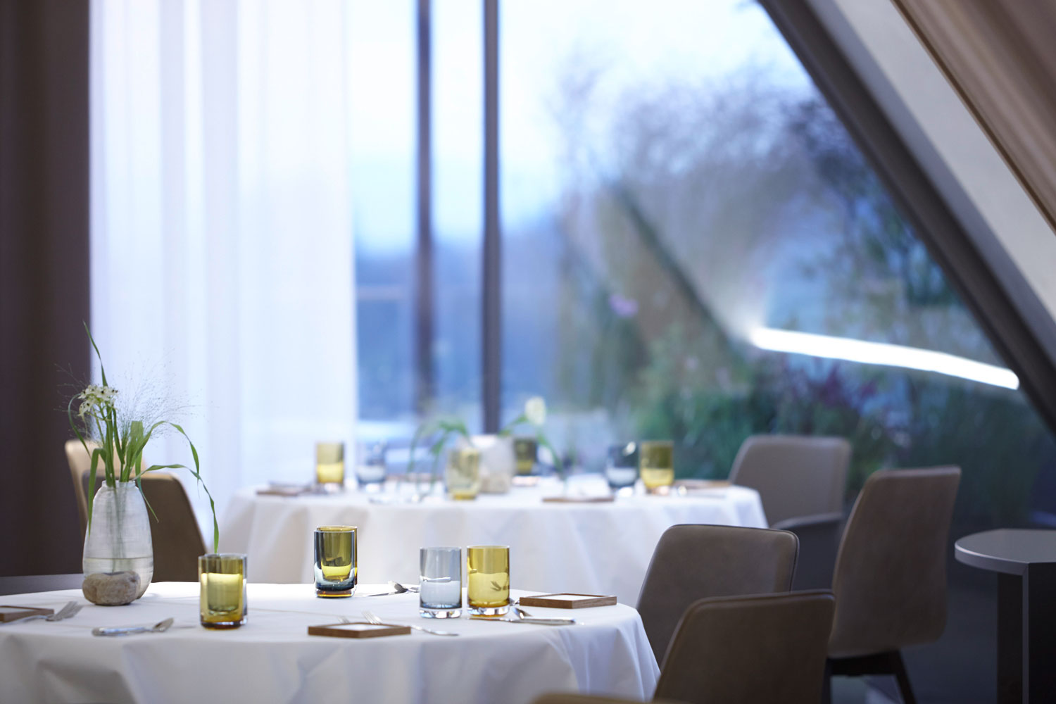 The fabric curtains and hidden installations also add to the discreet acoustics. A further dining area is framed by an illuminated leather wall and an anthrazite-coloured service desk. Due to the disposition of the lights, all tables can be flexibly arranged at any time. But no matter where you sit, the view is superb. On the one side the look over the lower Bavarian surroundings, on the other side straight into the heart of the restaurant: The kitchen. Culinary-wise the cook doesn't need to hide anything; however, the comfort installations are skilfully integrated into the design. Like the grazing lights at the windows which create a comfortable sense of space.