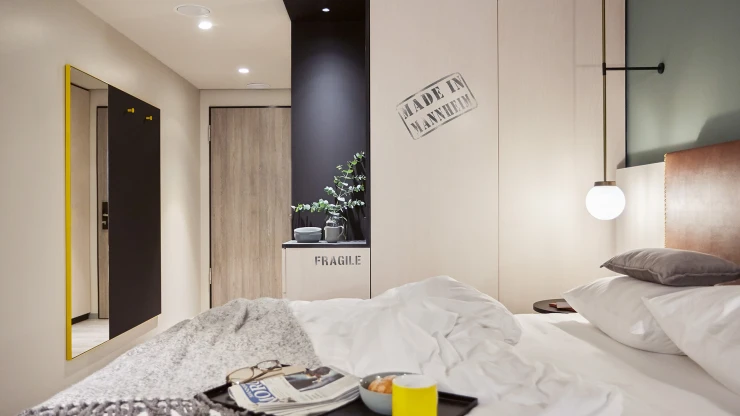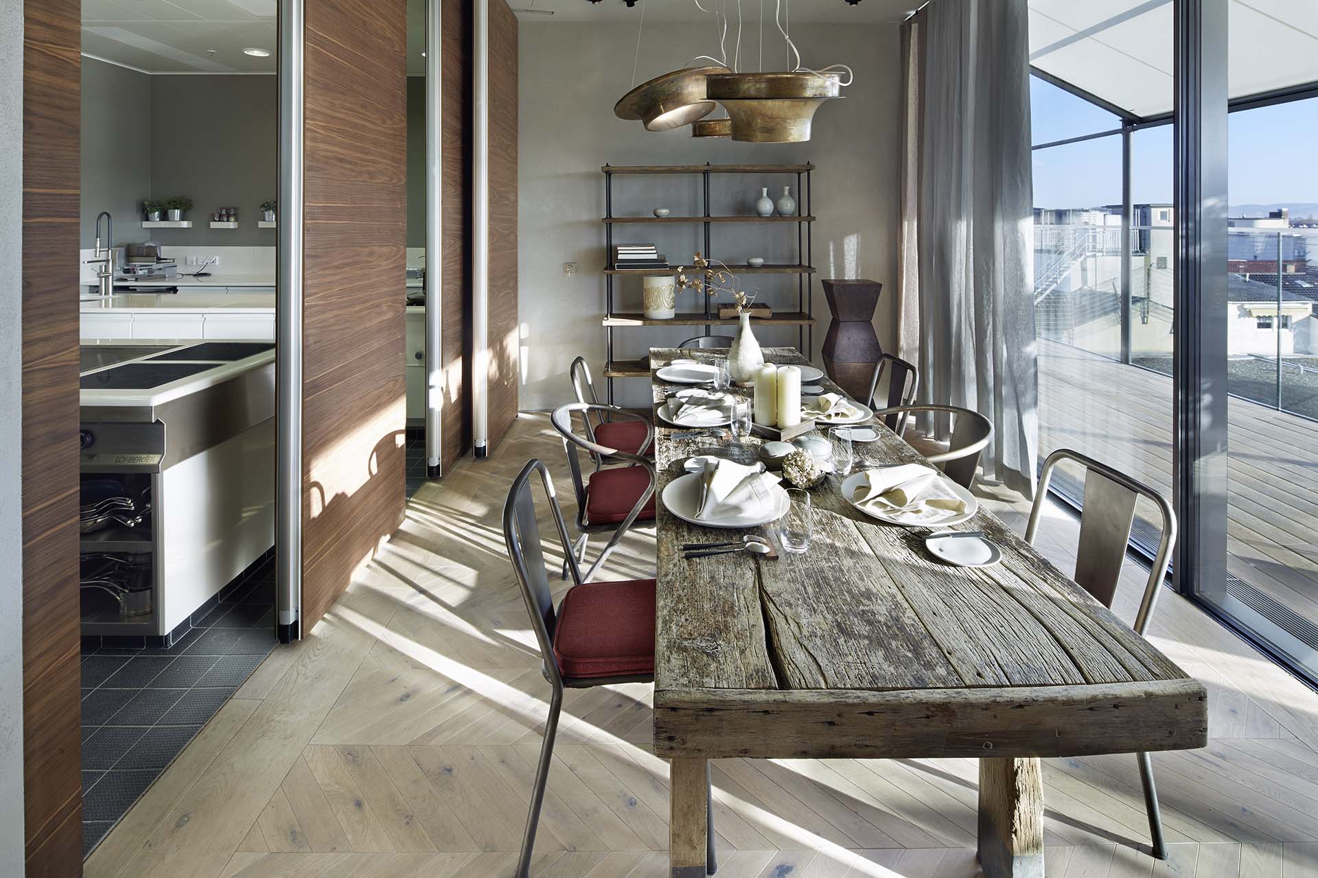 The Nordic-looking atmosphere above the city rooftops is otherwise open, simple and minimal: Natural materials, lots of wood and open space create an unusual and relaxed environment. To achieve a pleasing room height it was necessary to demolish storerooms way up in the sixth storey of the main engelhorn building and remodel the space's outer envelope. The designers covered the facade with glass-fibre reinforced concrete, so it would blend with the rest of the engelhorn acc/es building. Refrigerators and other technical equipment were moved to the basement to make room for the entrance. A special challenge was the statics. Today, the space – refitted for a restaurant – rests securely on a completely new substructure of steel beams.