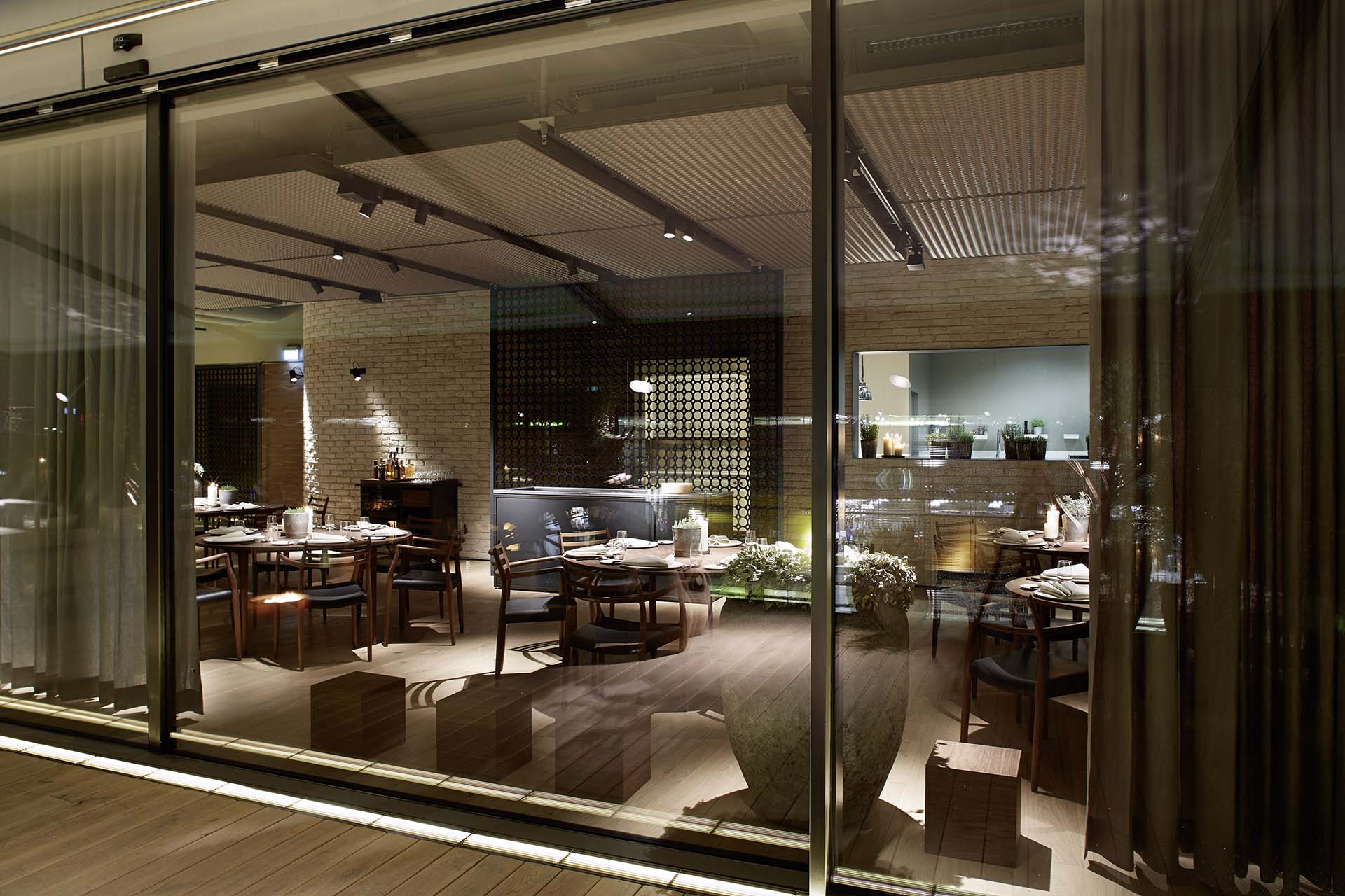 The harmonious interior with its parquet floors, cherry wood furniture and brick walls immediately sets the tone for the enjoyment of culinary delights. Tables are arranged parallel to the panoramic windows and are complemented by ceiling panels of expanded metal in warm brown tones. The continuous parquet flooring and sliding glass elements open out to a six-meter wide passage, ensuring a smooth transition to the veranda. With room for another 50 guests, the inviting terrace – with its array of plants and herbs – is a green oasis in the middle of the city. On sunny days guests can take a seat and enjoy a wonderful view over the city squares of Mannheim and beyond.