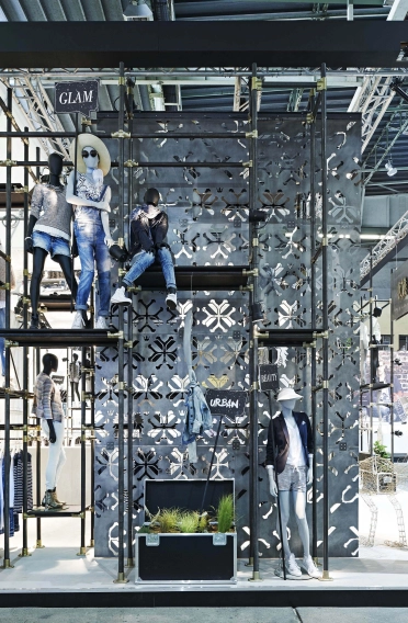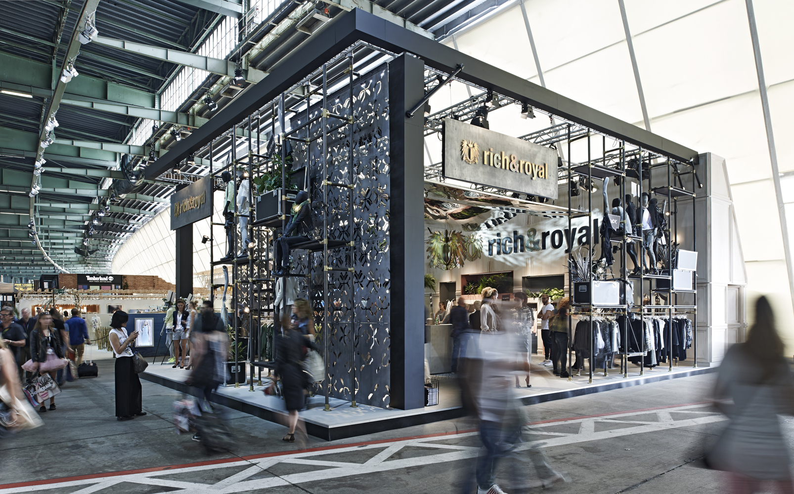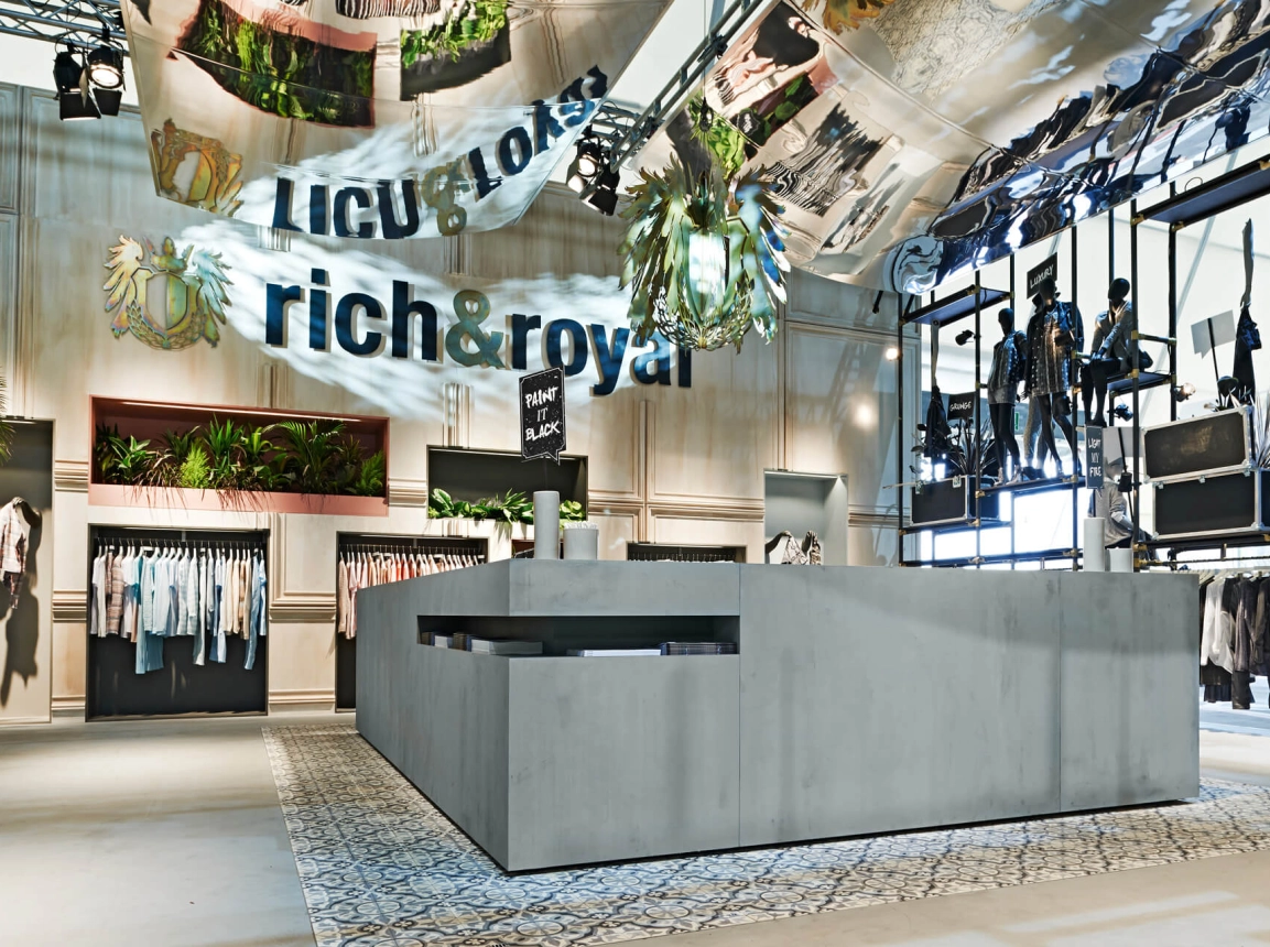 Rich & Royal belongs to the most trendy fashion labels for cosmopolitan women. For their appearance at the Bread & Butter,blocher partners developed an outstanding exhibition design – following the motto Glamour meets Rock. A for and against between individuality and style – in black, grey and gold. The essence of the brand on 150 square metres. In the middle: a monolithic bar in a concrete look as meeting point for the industry – and, at the same time, a stylistically confident echo of the concrete floor, accentuated by ornamental tiles. Above: the unfolded brand logo as a three-dimensional art object. At the ceiling, two bended mirrors reflect the urban scenery.
