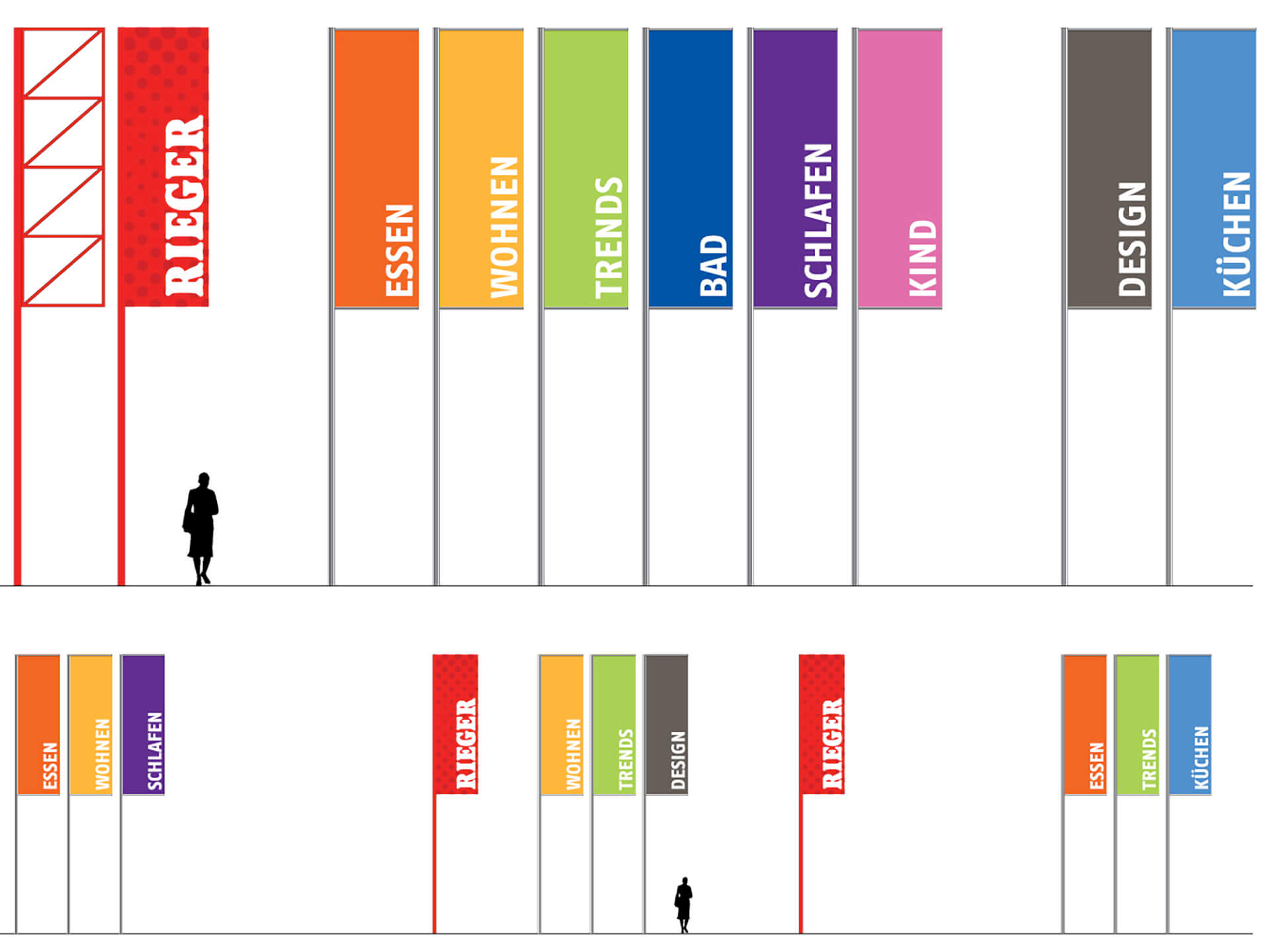 Large format banners in each department are visible from a distance. The "key visual" is the Rieger name in big letters standing out against the external grid façade, as well as on the lifts – in the form of "Anna Maria" which is part of the adorned plate. It was created for Rieger Welt, where a charming sales advisor picks up the visitor at the entrance and attends to his every needs. Since 2007, blocher partners has been collaborating with Rieger. Its accomplishments include the construction of a new furniture store in Heilbronn.