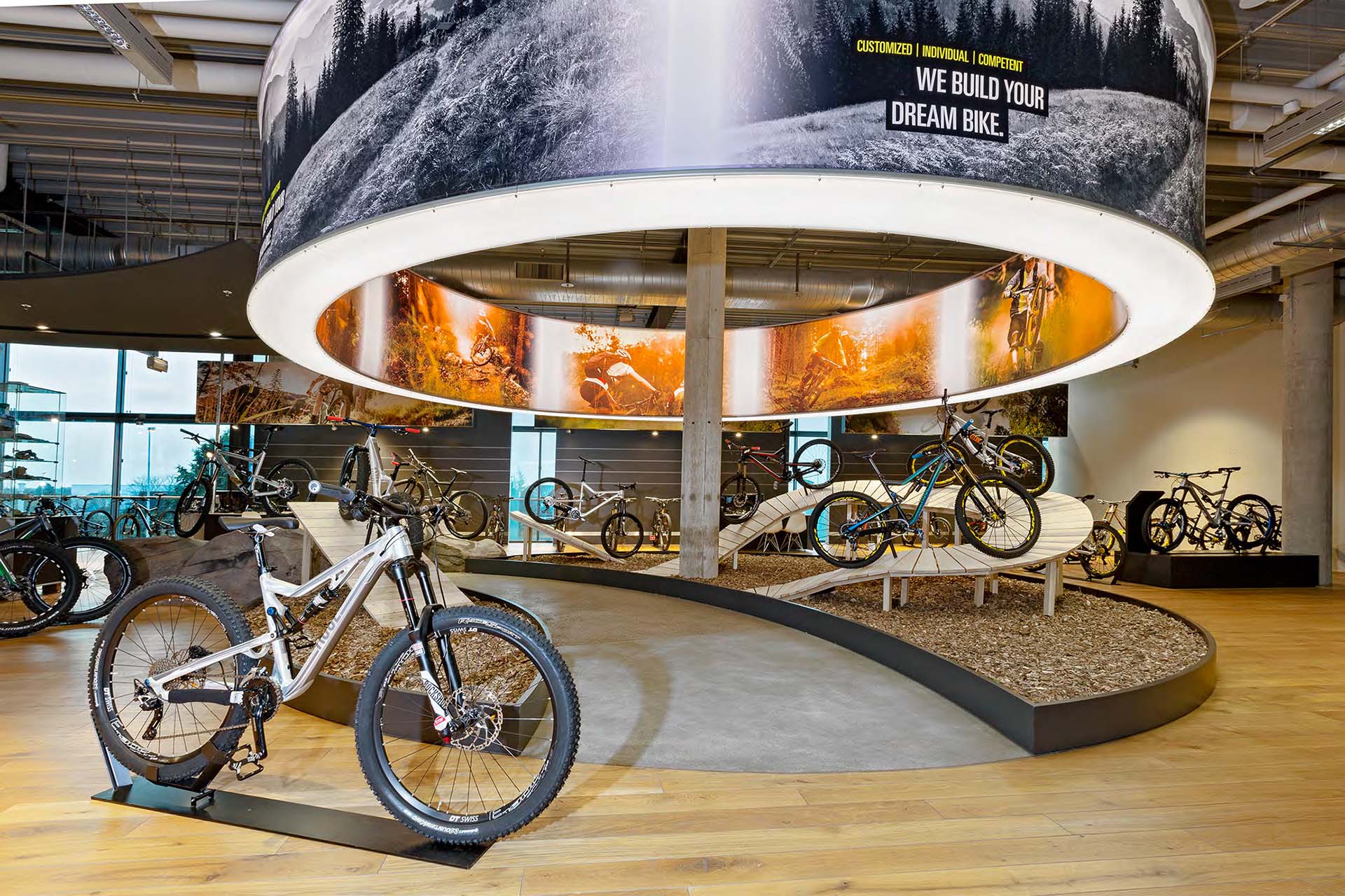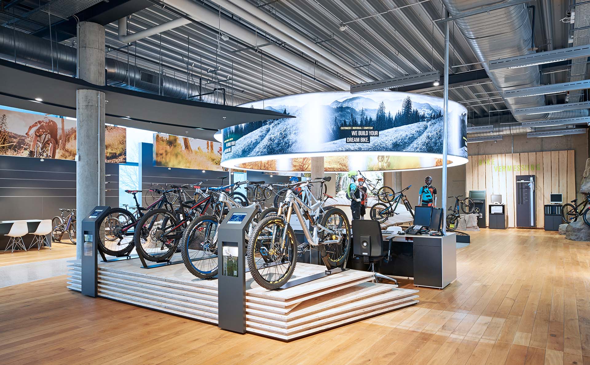 Under the motto "more emotions and experience" customers can not only buy a bike but also test every-thing that goes with it: at a pump station they can test all air pumps; a GPS stations helps to find the right navigation system; perfectly fitting bike glasses can be chosen by using a wind simulator and a dark room allows for light tests under realistic conditions.