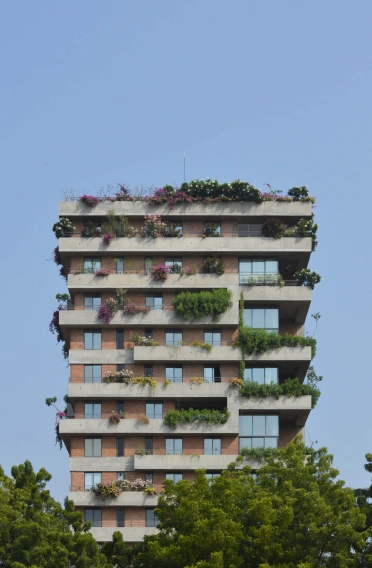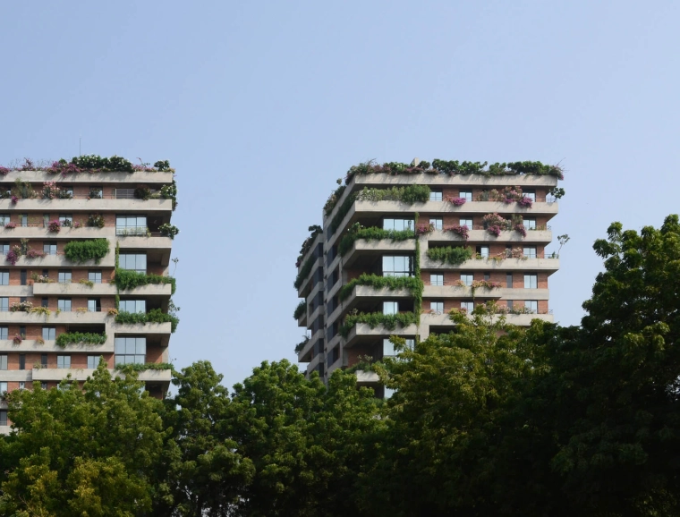Between them there are third apartment units forming bridges between the two wings of the tower. At the same time, the 225-square-metre apartments are so arranged that all 48 of them are superbly ventilated at all times from every side. The balconies around them are highly effective in providing shade. The generous length and luxuriant greenery of those balconies makes every dwelling look like a standalone unit. For residents, this creates the illusion of a free-standing detached house, yet at a lofty height in many cases.