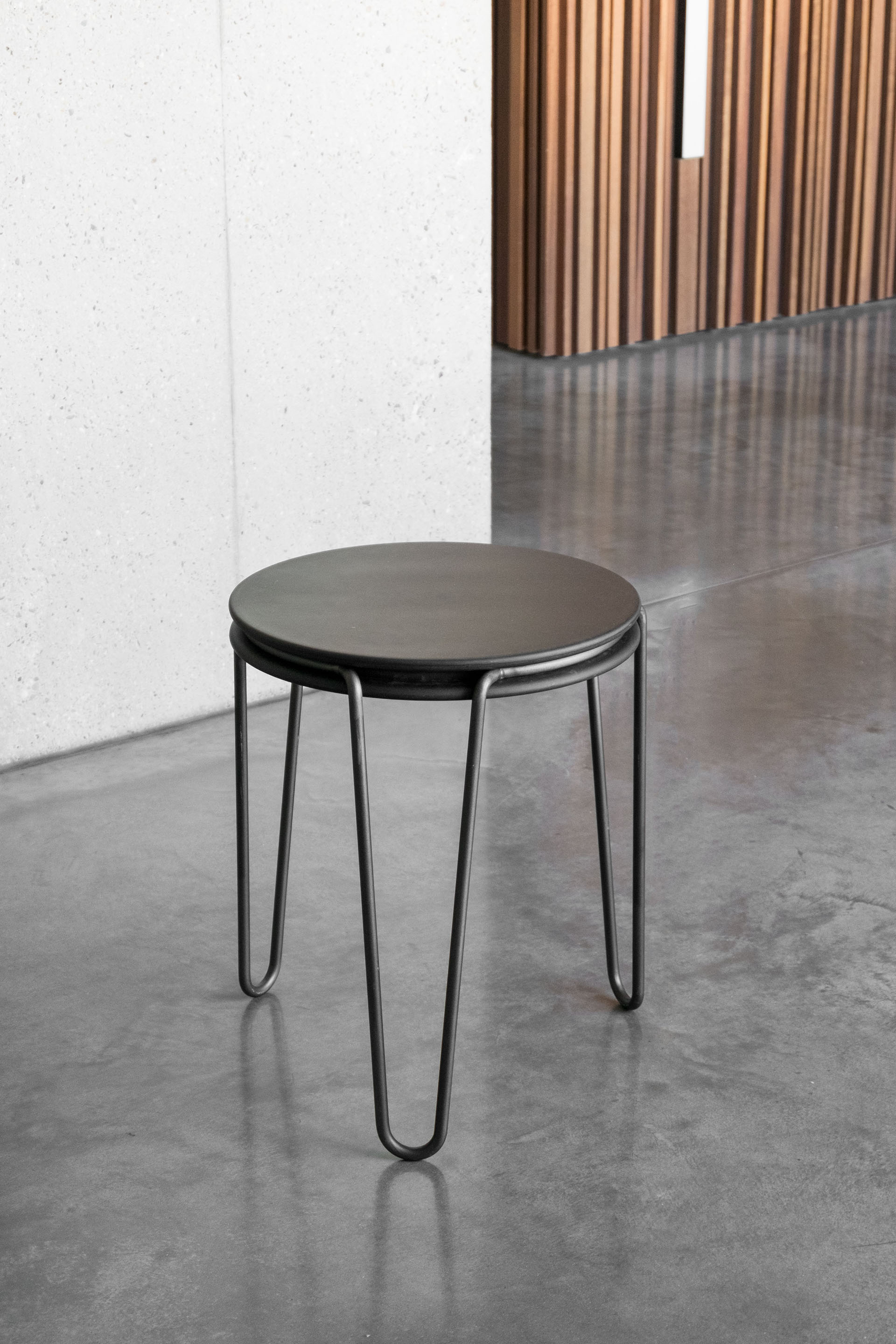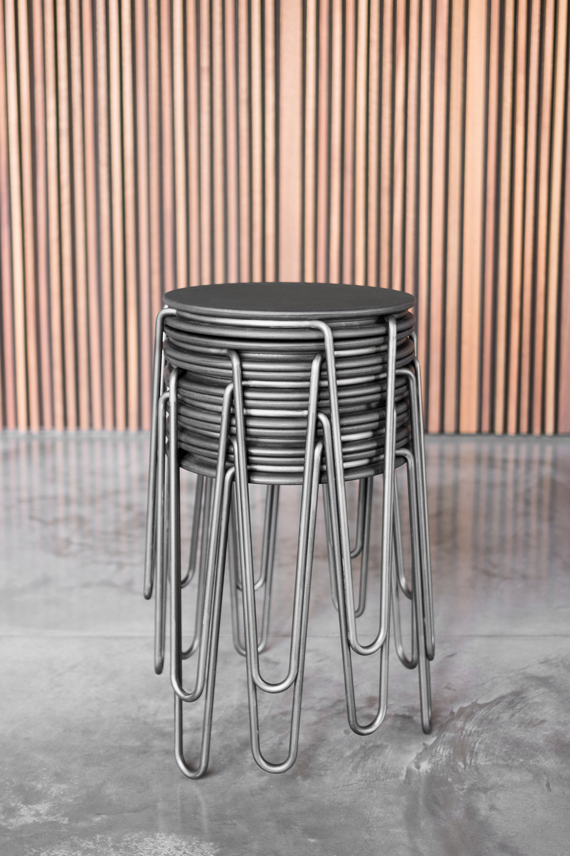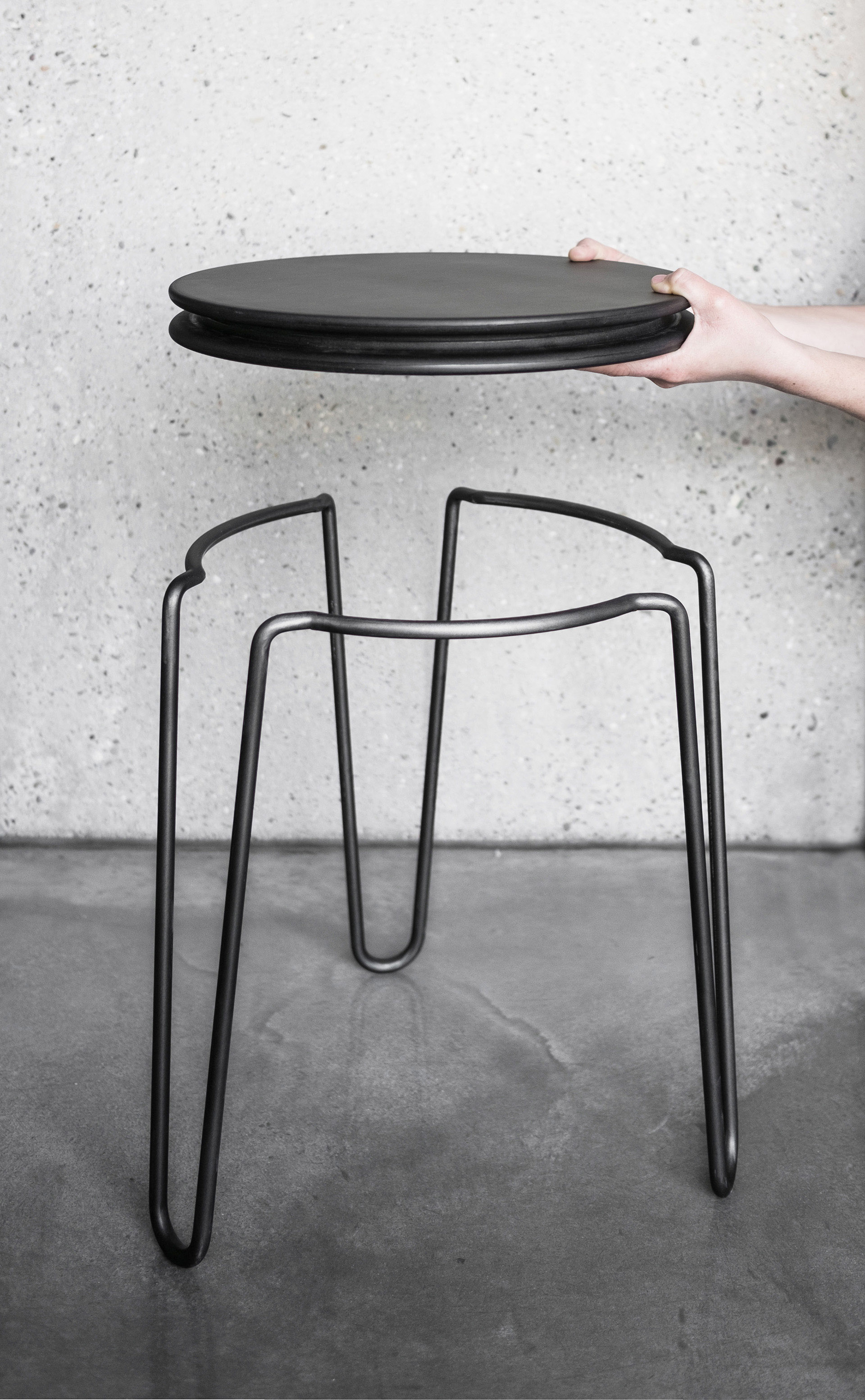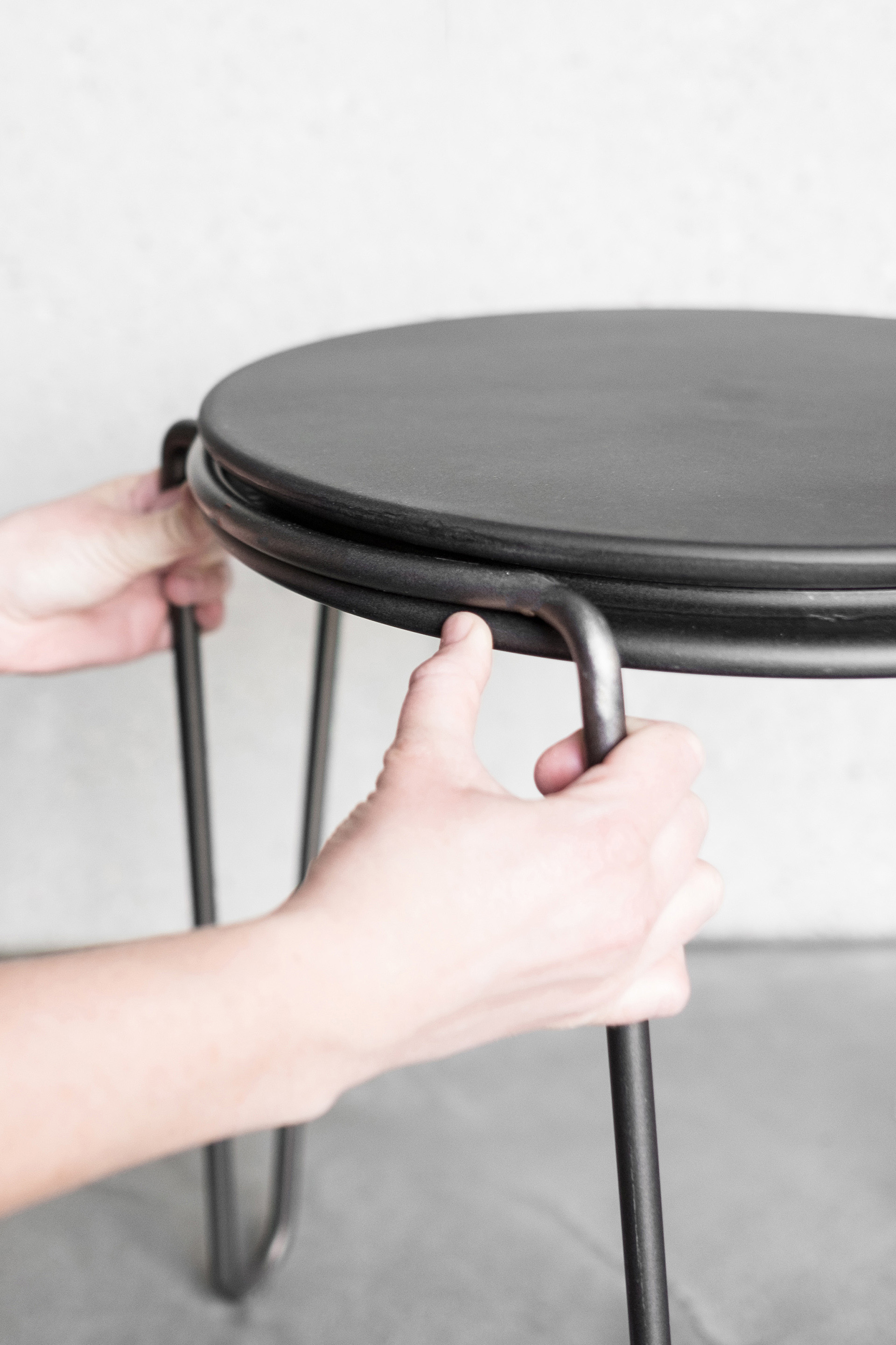 The stackable stool consists of two elements: The seating surface is put into the bent metal frame without any screw connection, being held only by the internal stress. The designers were inspired by the closure of a champagne cork, this means that the assembly of the stool can be done without needing any tools. The material: A 12 millimeter round bar made of steel, seating surface e.g in Mdf. Designed for the booth of blocher partners on the Euroshop 2017.