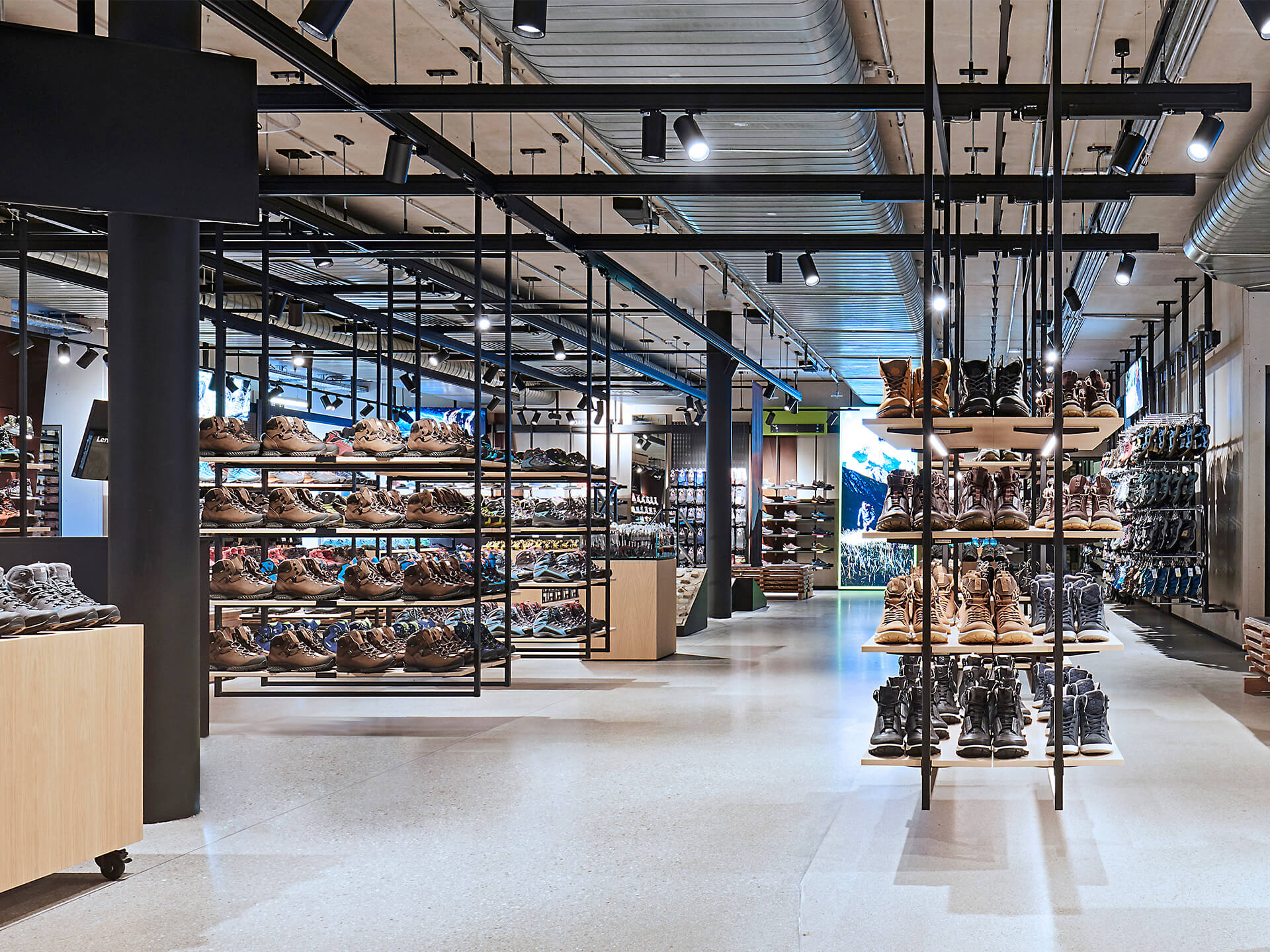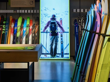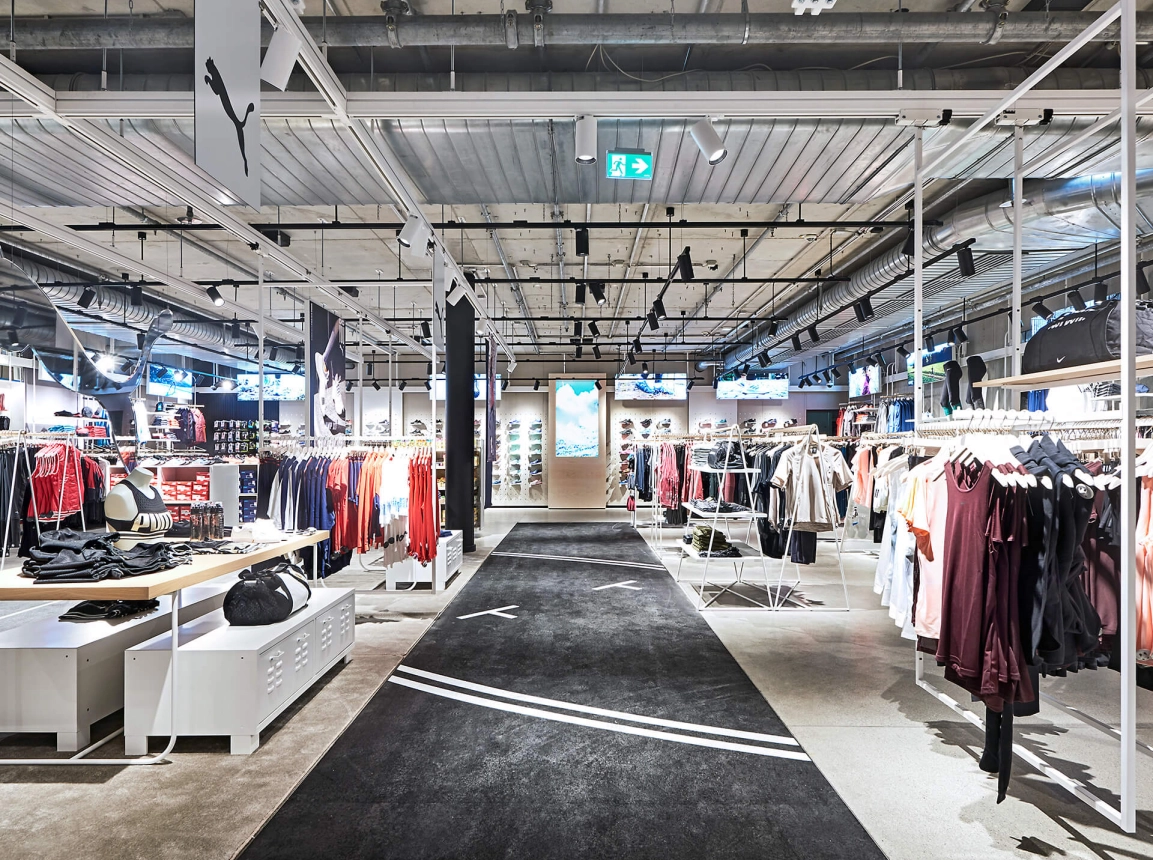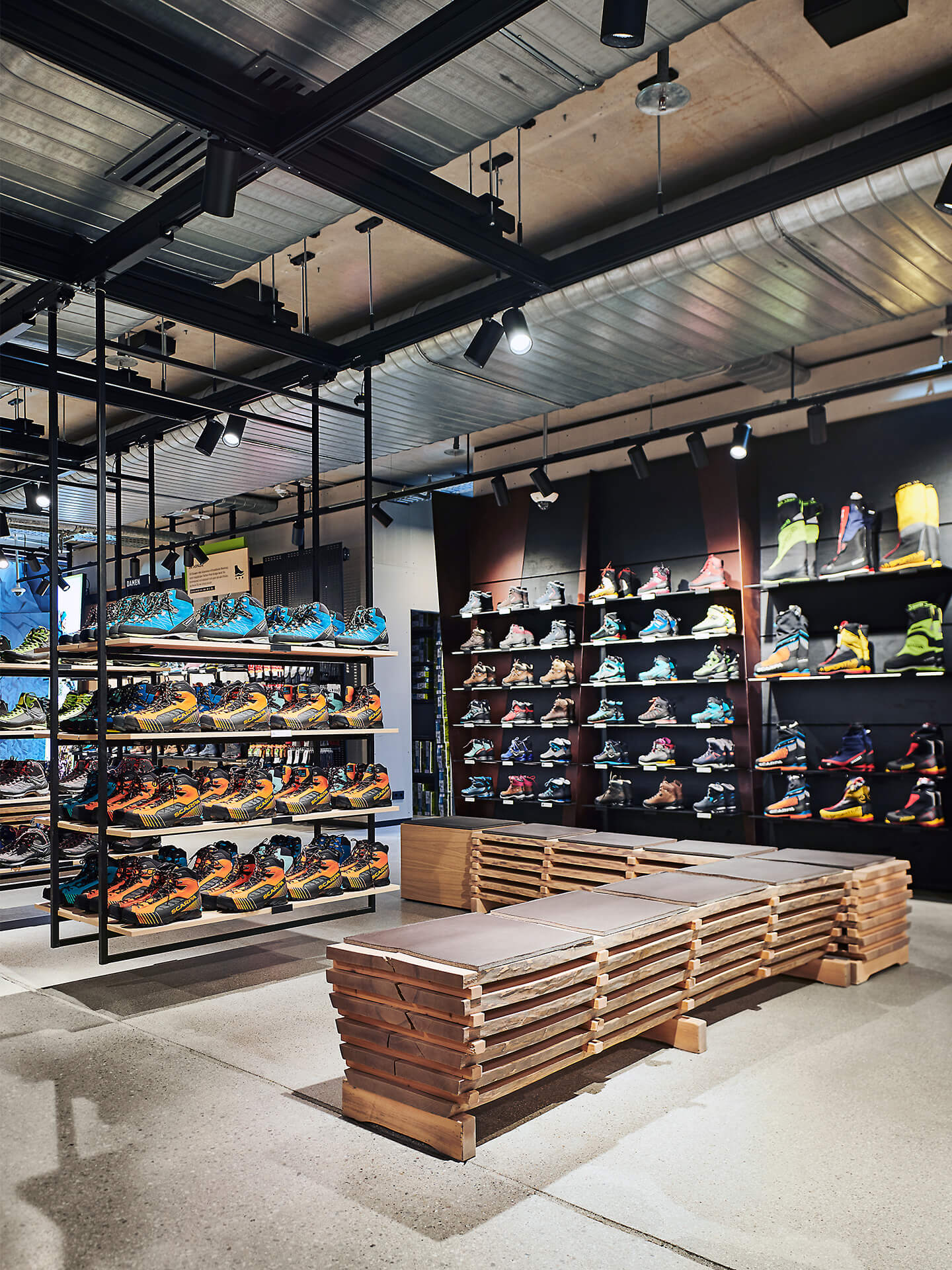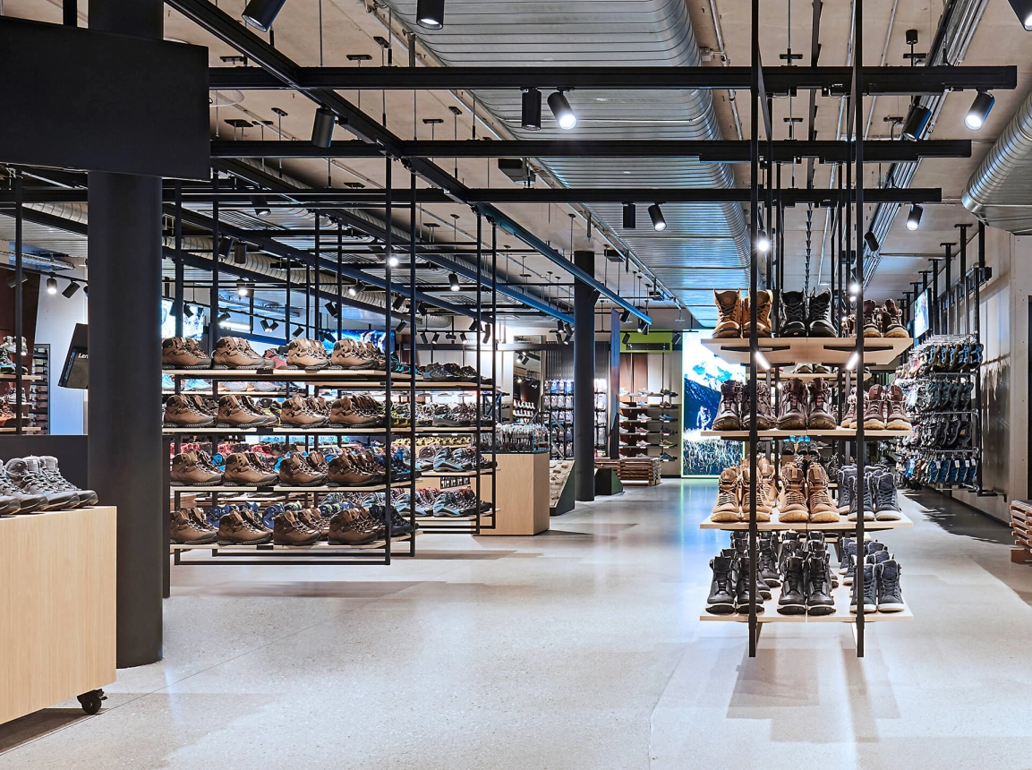 The concept is based on umbrella brand communication from the basement to the 5th floor: Polished concrete screed, open ceilings and walls of exposed concrete and gypsum fibreboard in an exposed concrete look form the urban framework within which the various theme worlds unfold. The minimalist look not only allows the merchandise to stand out, but also makes the sports store highly flexible in terms of display options and seasonal exchange of products.