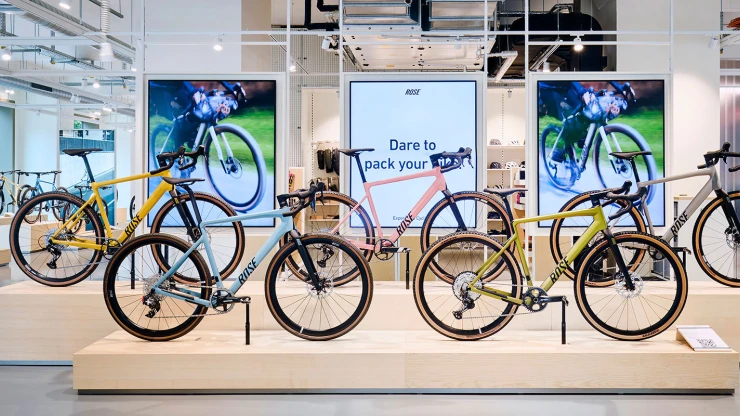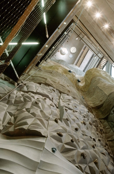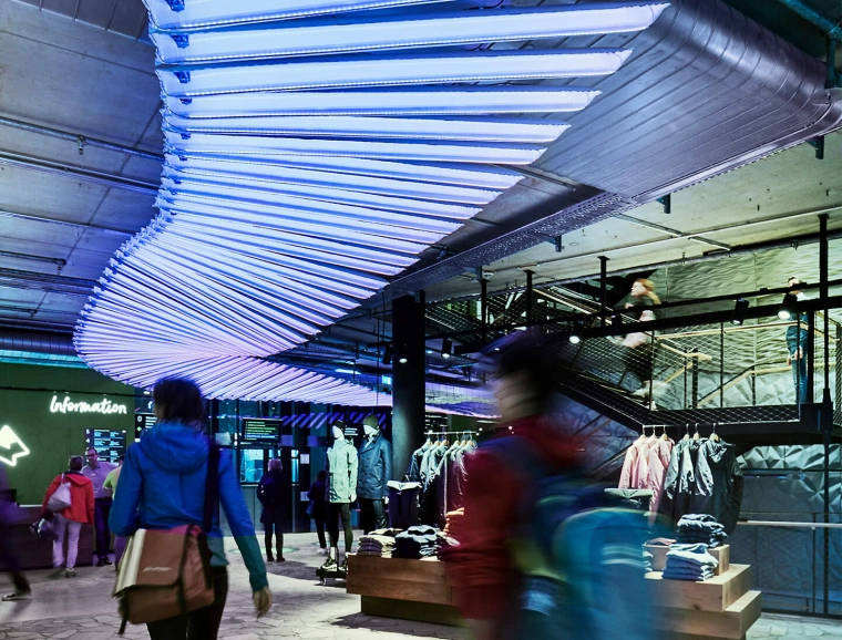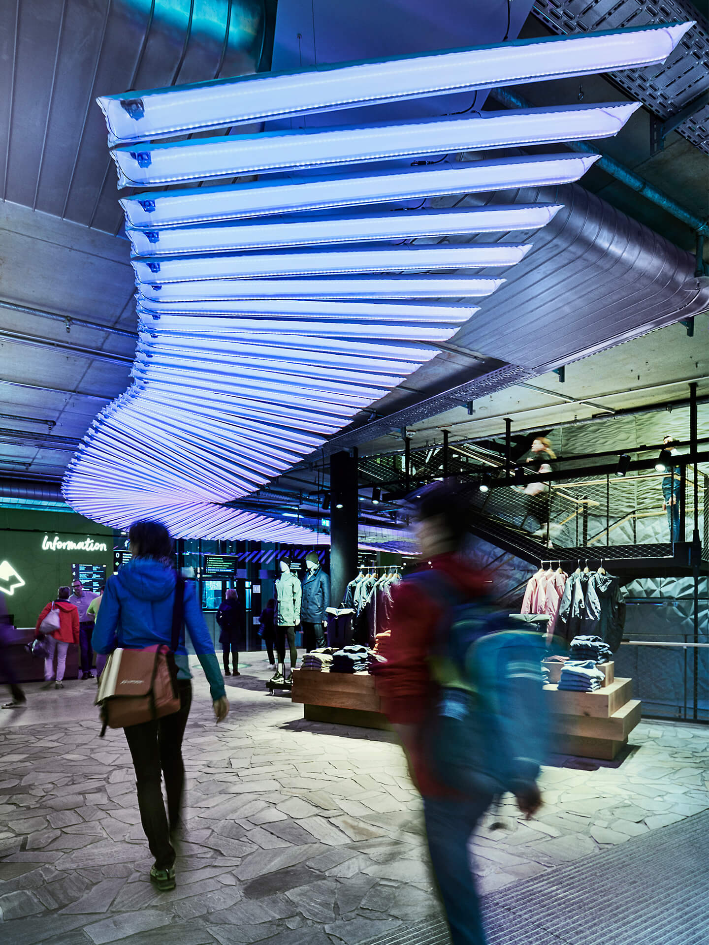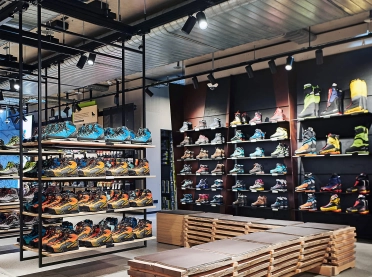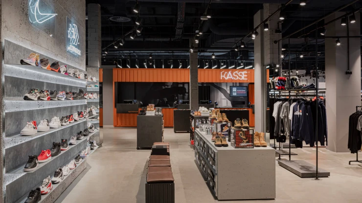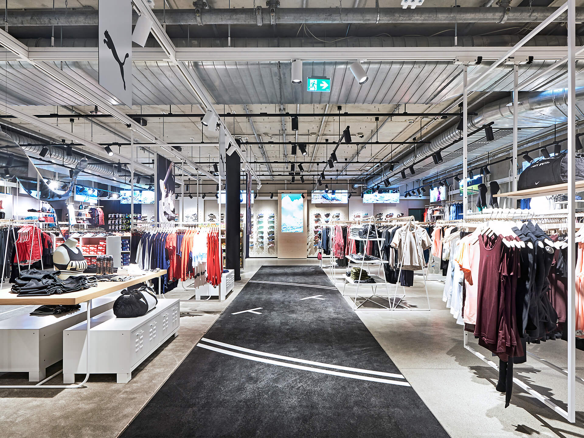 The concept is based on umbrella brand communication from the basement to the 5th floor: Polished concrete screed, open ceilings and walls of exposed concrete and gypsum fibreboard in an exposed concrete look form the urban framework within which the various theme worlds unfold. The minimalist look not only allows the merchandise to stand out, but also makes the sports store highly flexible in terms of display options and seasonal exchange of products.