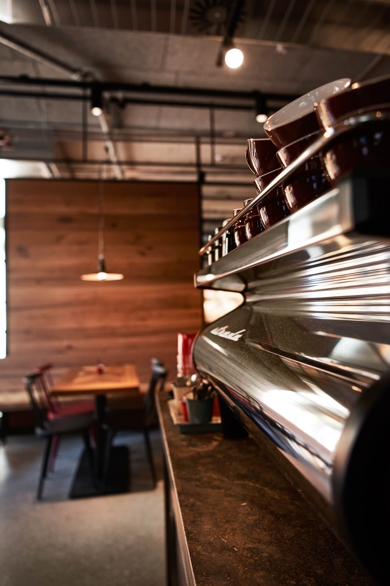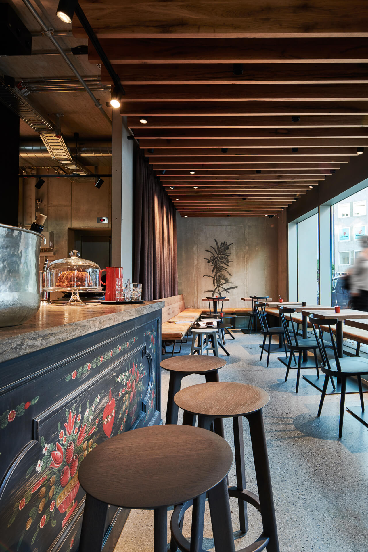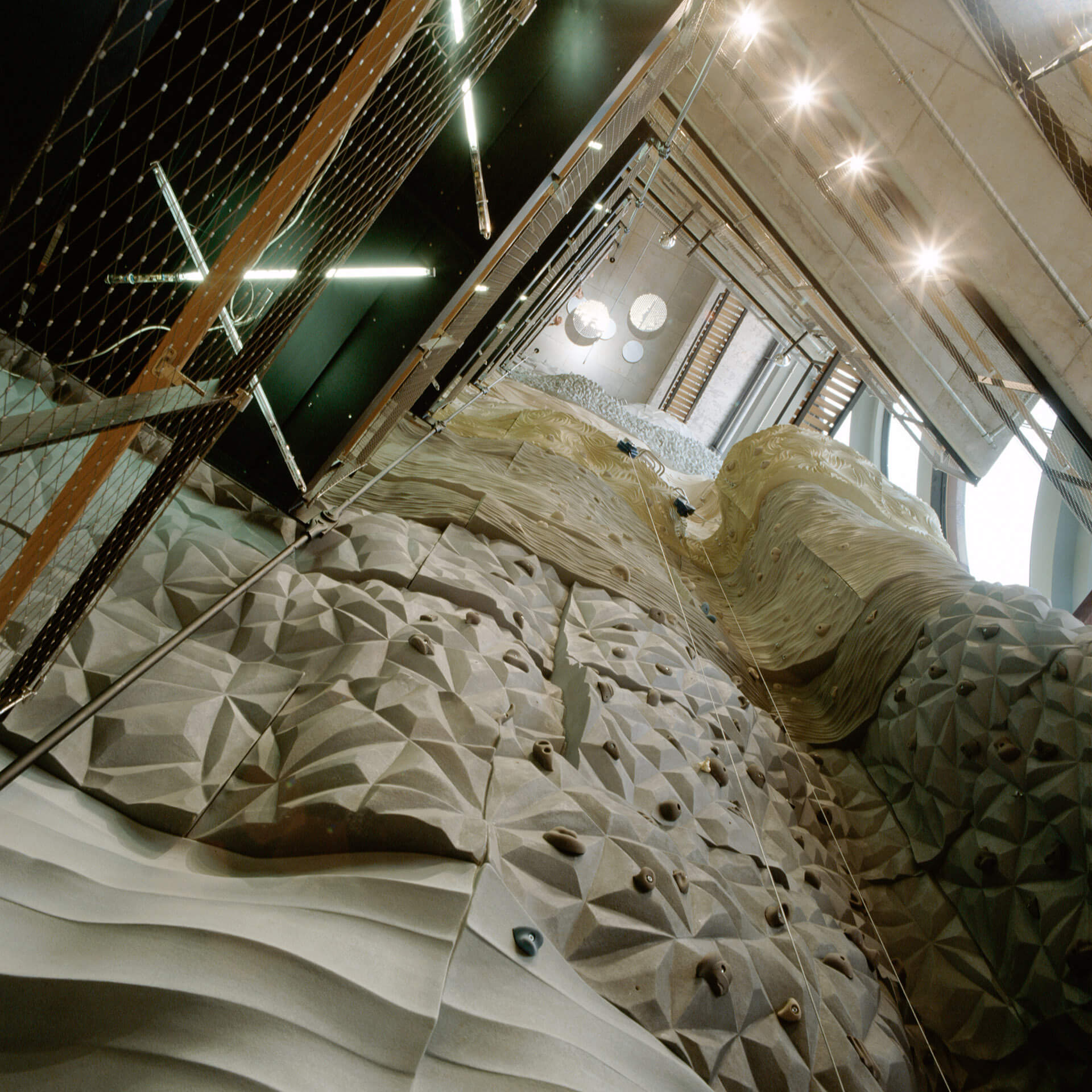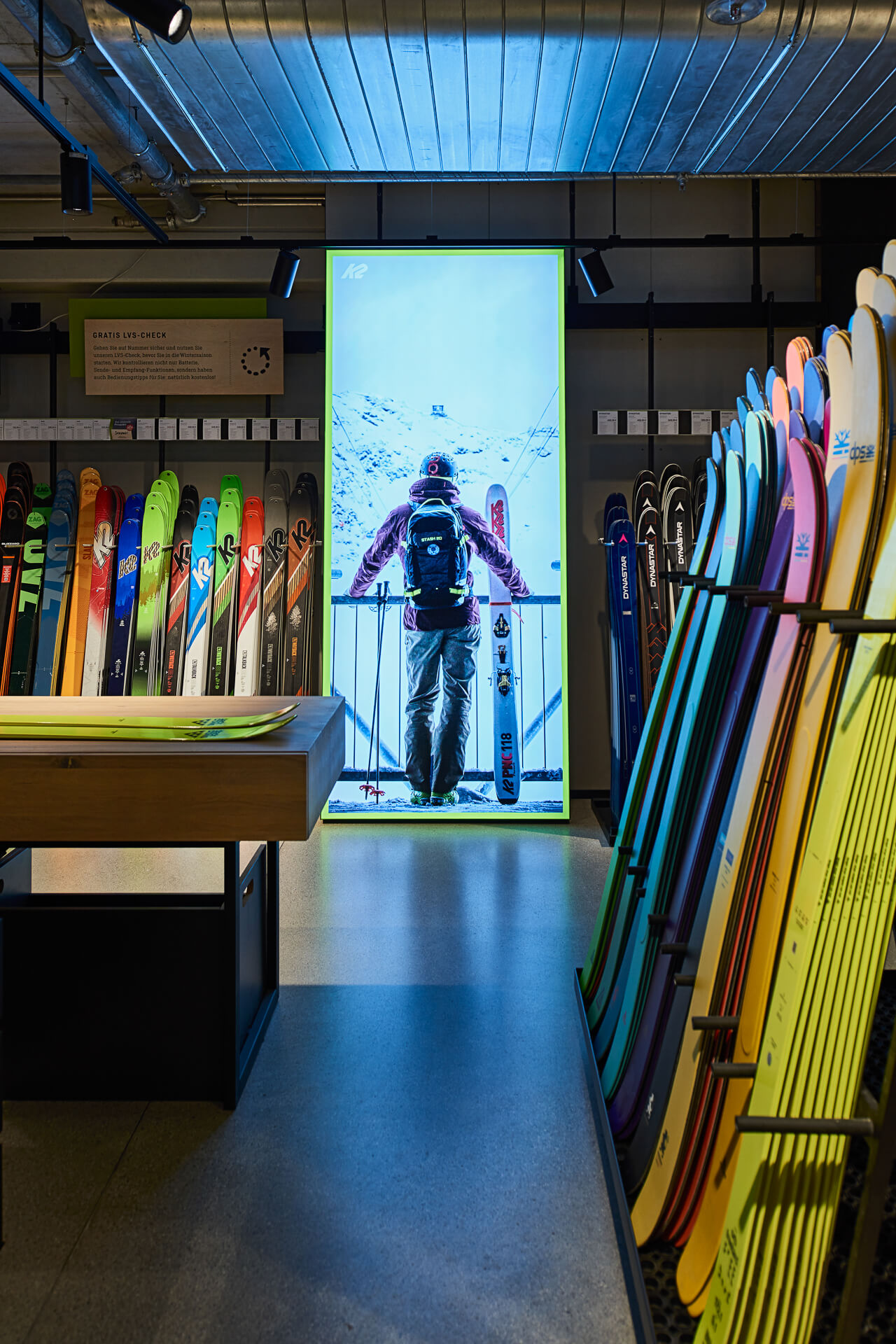 The concept is based on umbrella brand communication from the basement to the 5th floor: Polished concrete screed, open ceilings and walls of exposed concrete and gypsum fibreboard in an exposed concrete look form the urban framework within which the various theme worlds unfold. The minimalist look not only allows the merchandise to stand out, but also makes the sports store highly flexible in terms of display options and seasonal exchange of products.