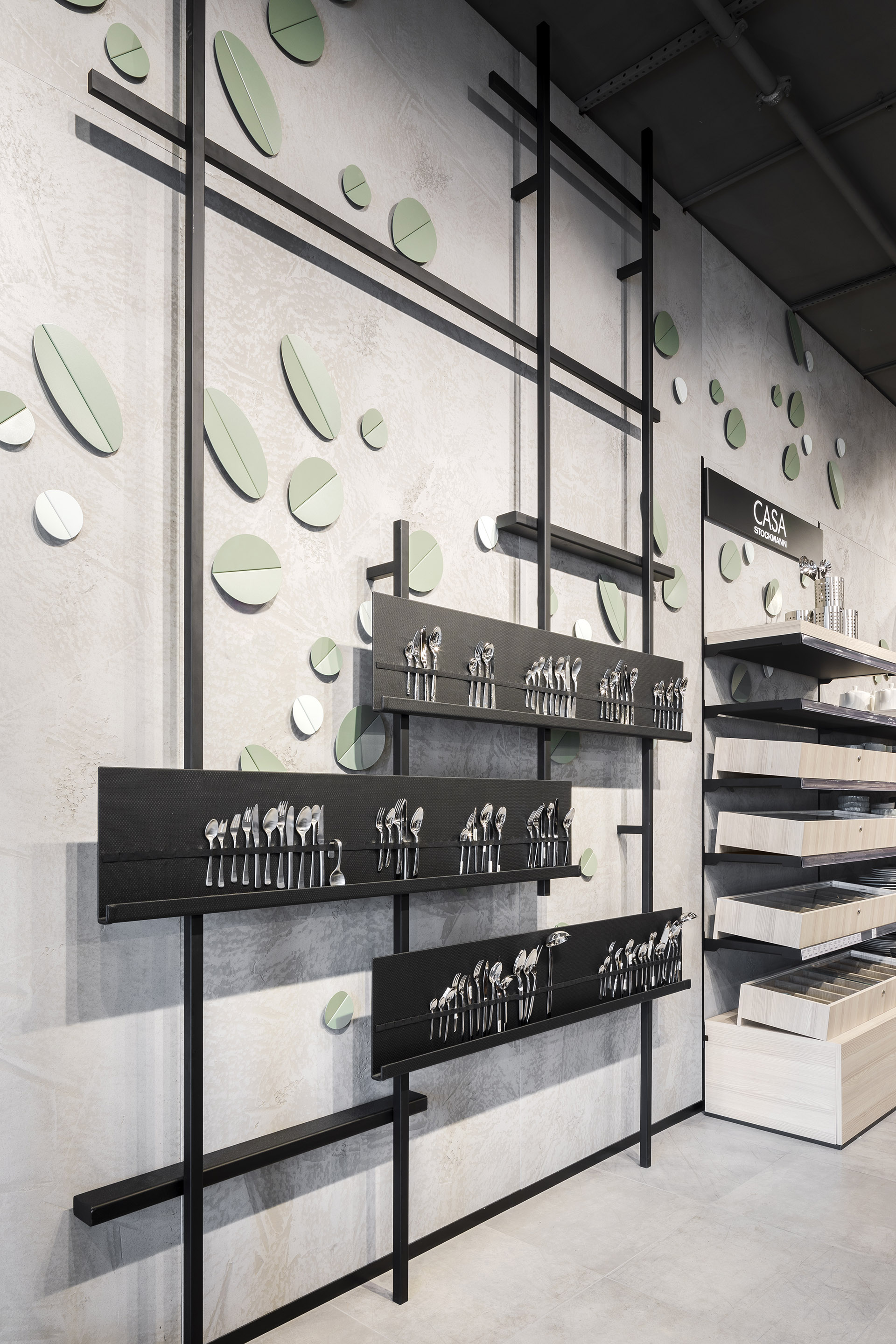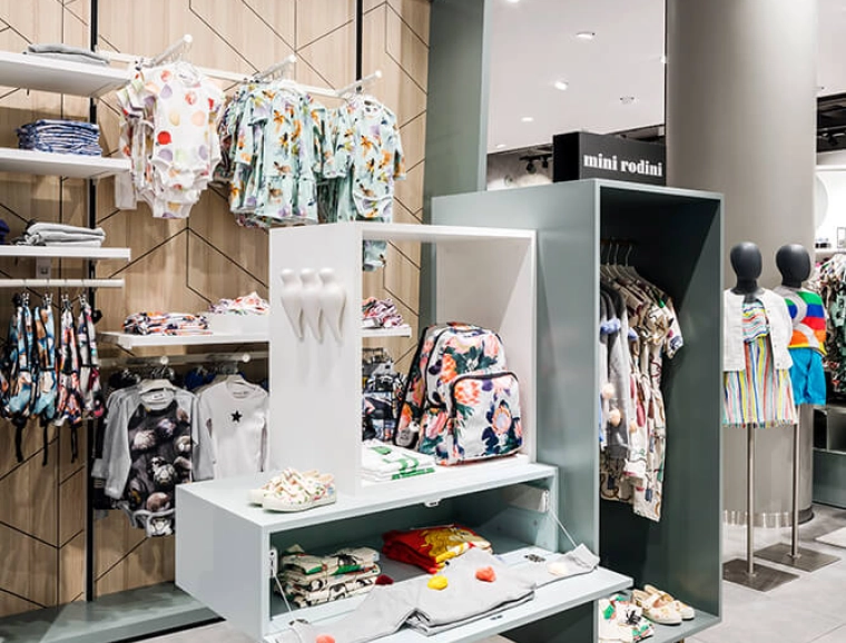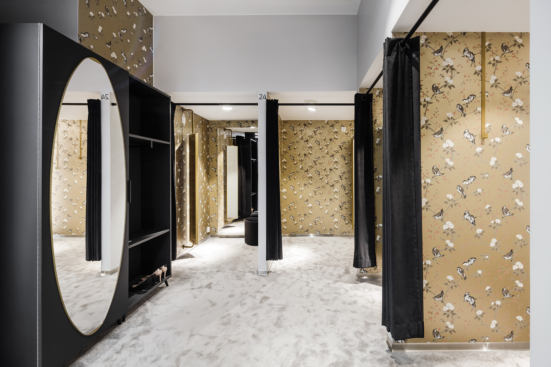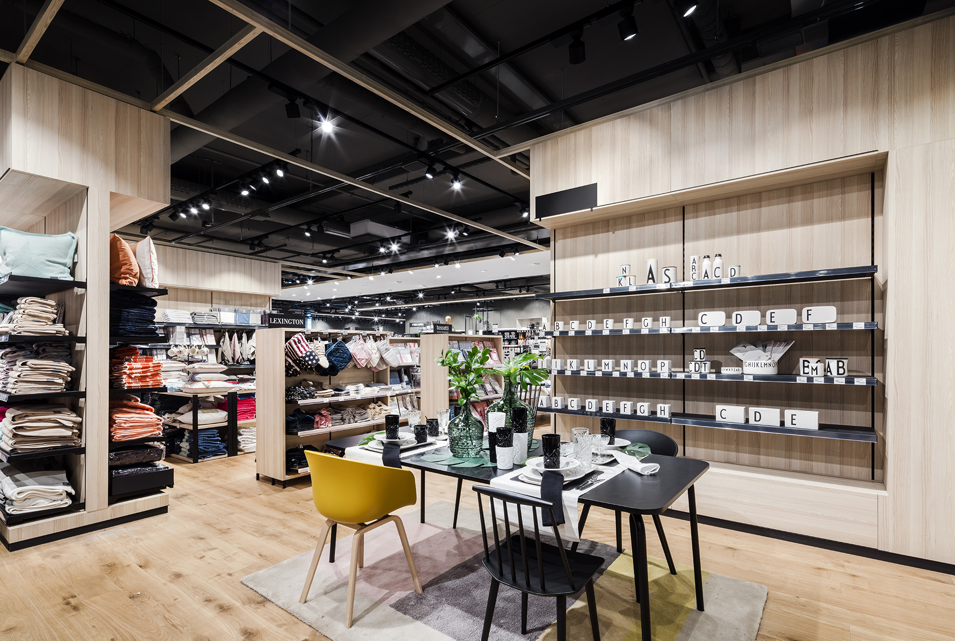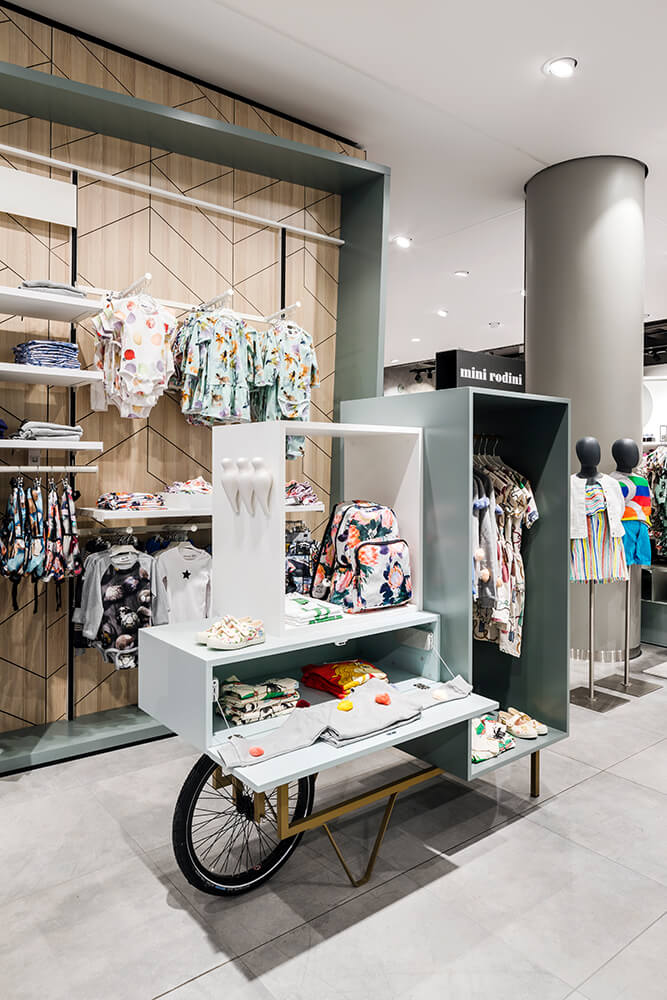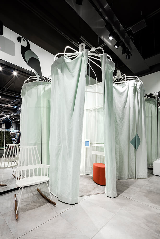 One floor up, the blocher partners interior designers skillfully present cosmetics, premium women’s clothing, accessories and handbags, and lingerie, staged against a backdrop of gold-toned fabric, on coppery shelves and illuminated by expressive, large-format circular lighting fixtures: all in all, a luxurious ambiance that turns shopping into a memorable experience. The heart of the third floor, location of Home & Living, offers a sense of well being thanks to the predominant use of oak. For the kids’ department, the blocher partners team developed playful concepts that also pick up on Finland’s flora and fauna: Children’s sizes are indicated using stylized bird images, from sparrow to parrot to raven – designed by the typenraum communication agency, a member of the blocher partners family. Try-on rooms resembling birdcages add to the fun of shopping. An iPad in each cabin offers digital support to the customer: A simple scan sends your request for a different size to the salesperson on the floor – a service available throughout the entire Stockmann store.