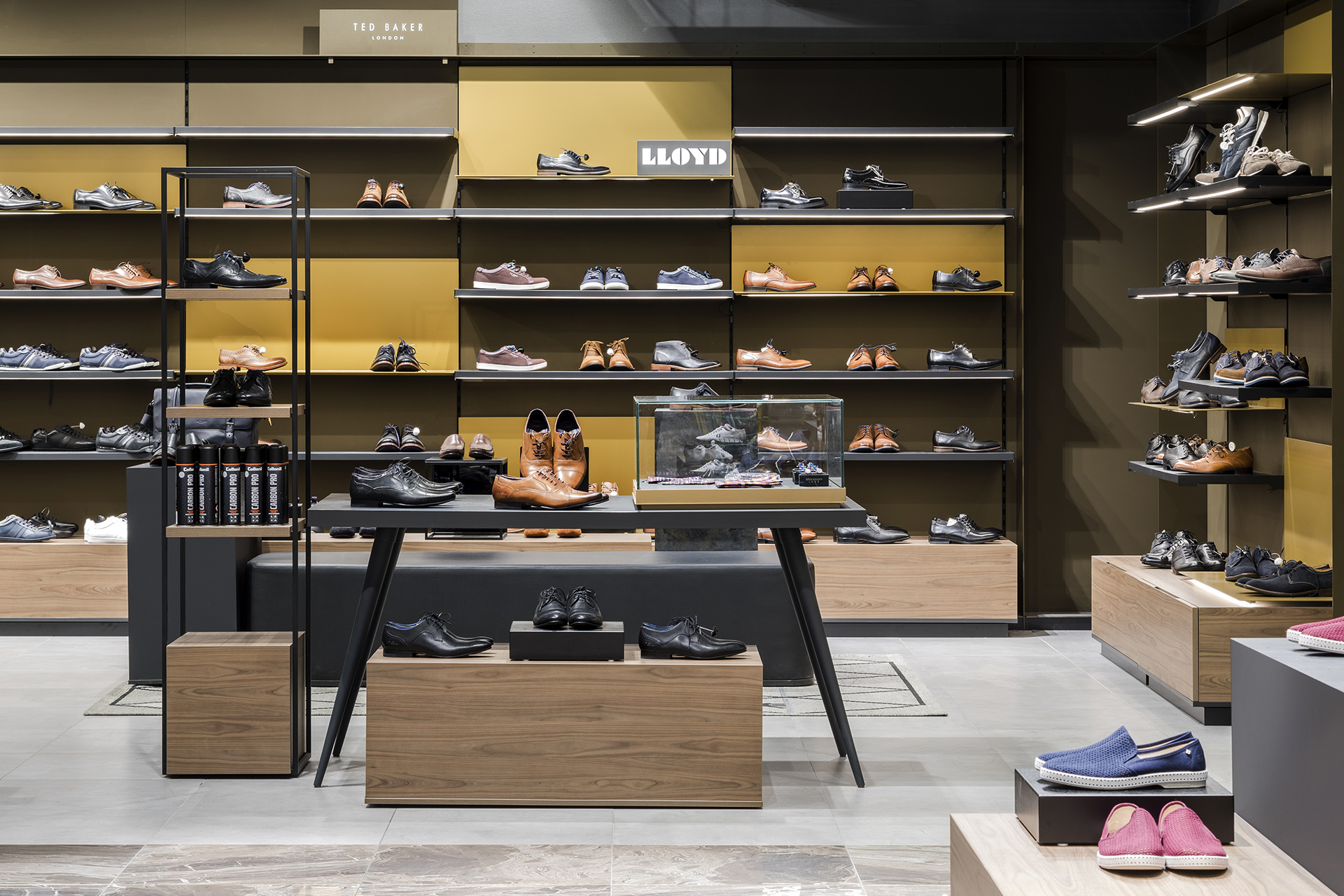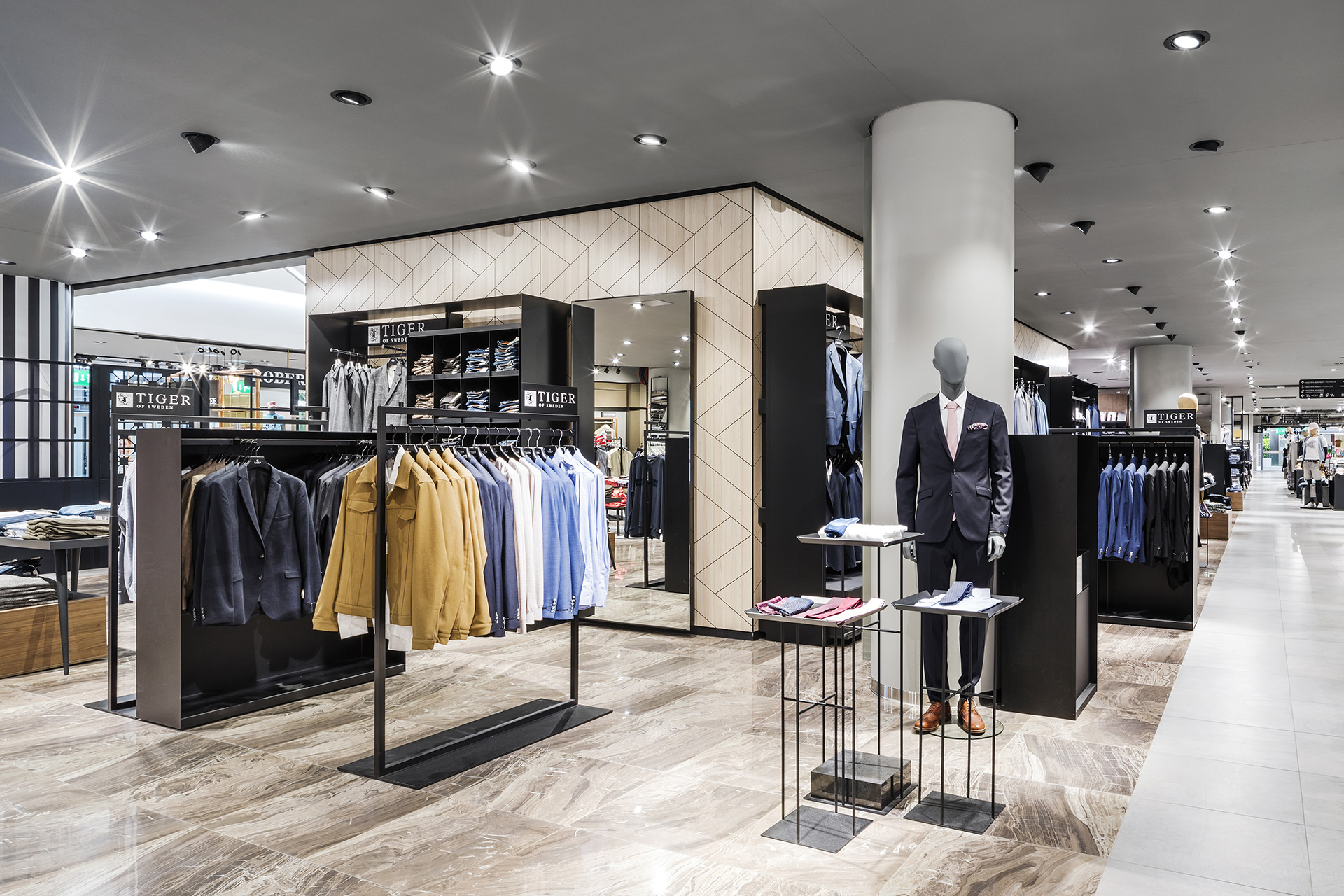 blocher partners has given each of the three levels – with a total sales area of 8,200 square meters – a clear structure, with different design accents and shop-in-shop concepts on each floor. The looks vary: On the first floor, the men's department has an urban style; the women's casual zone features classy red-brown wall elements; and the sports section is outfitted in fresh tones of white and green.