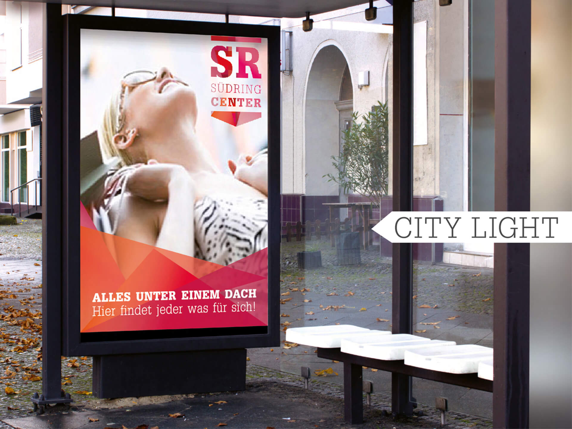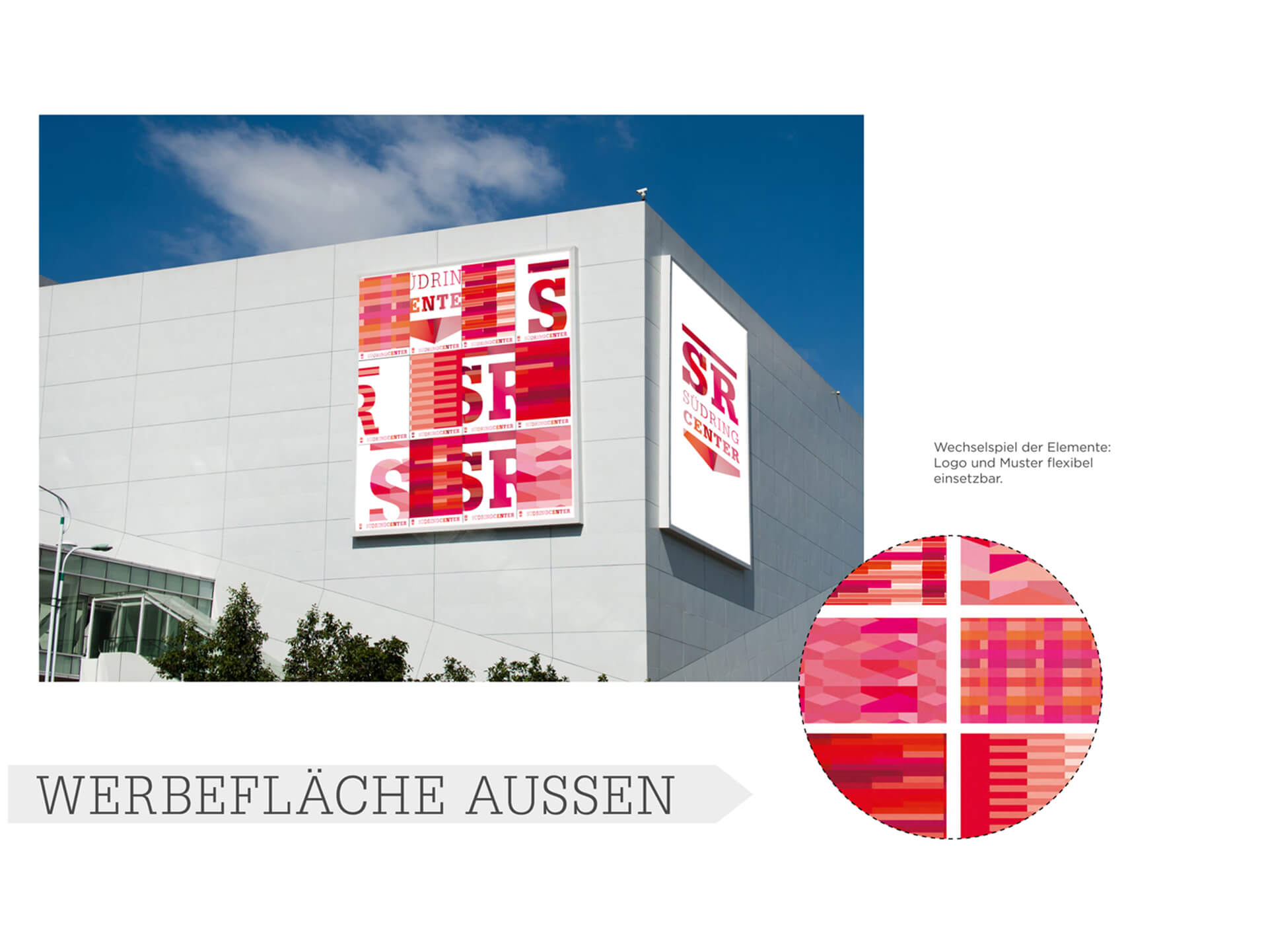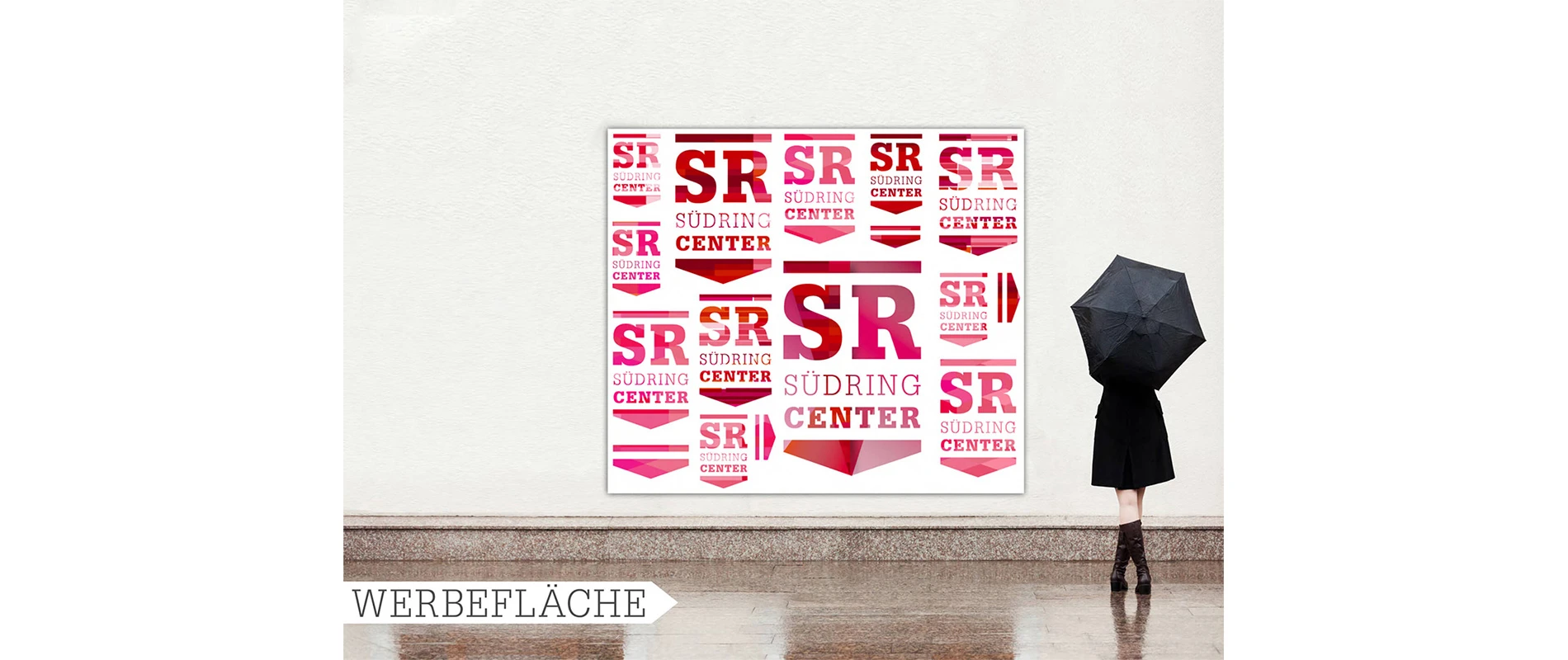 In the center of the logo: the initials of the Südring-Center "SR". Clearly structured by a line above and a dynamic, arrow-shaped basis elemtent - as a contemporary interpretation of the original company logo from 1969. Colour comes into play with red hues as highlight pattern that stands for the multifacetedness of the shopping world. So to say a second, emotional level that makes the emblem downright versatile. Depending on the campaign or occasion the pattern can vary, at times as diamond structure, at times as a collection of bars and lines. Still, the logo always stays true to itself. An exciting play of consistency and change, varying aesthetics and again and again new messages that customers can experience step-by-step as the completed conception gets realised.