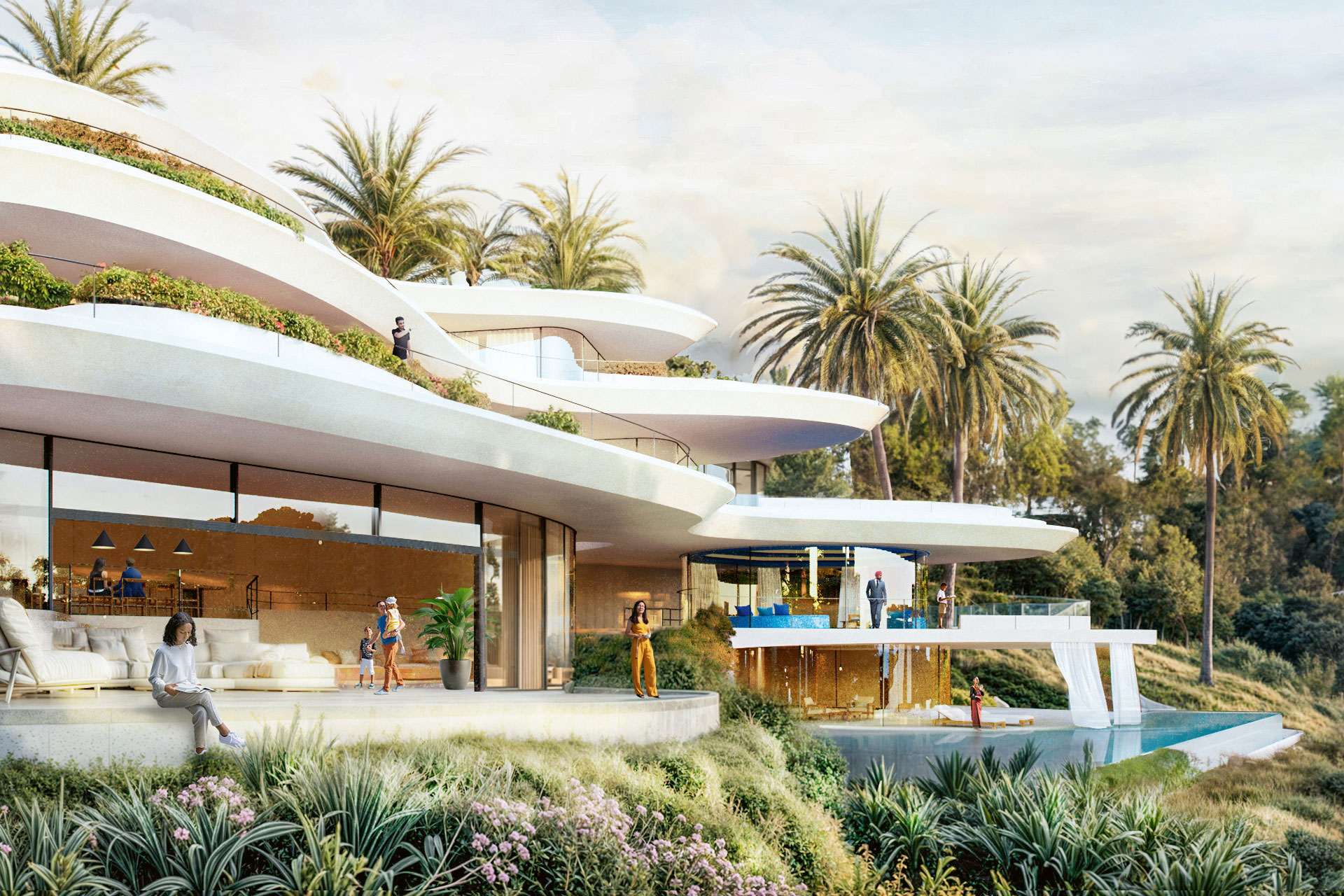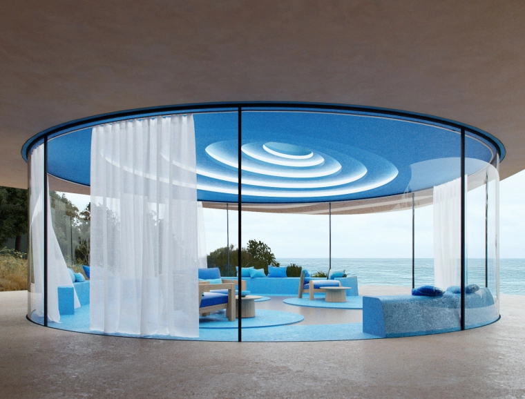 The »Blue Lounge« is the centerpiece – a multifunctional room with a 360-degree panoramic view. An essential element of the design is water, which flows through the living space from the entrance area down to the main terrace into a swimming pool, thus connecting with the garden landscape.