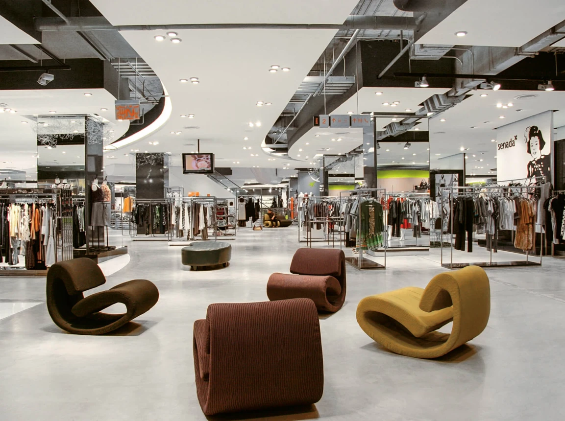 The guiding spirit of the blocher partners design is the élan and temperament of Zen's target group: young and fashion conscious clientele. The dynamics of this generation influences the entire layout of this department store: Escalators in a staggered setup add drama to the space and offer a variety of views into the shopping floors; star-shaped pathways and curved ceiling panels draw the eye toward the individual product realms on each 5,000-square-metre sales floor. By alternating between open and closed ceilings, the designers added pizazz to the space; the design, featuring grids, prints or mirrors, emphasizes the personality of each individual sales area. Bright colours, often against white backgrounds, make for a positive mood on the retail floors.