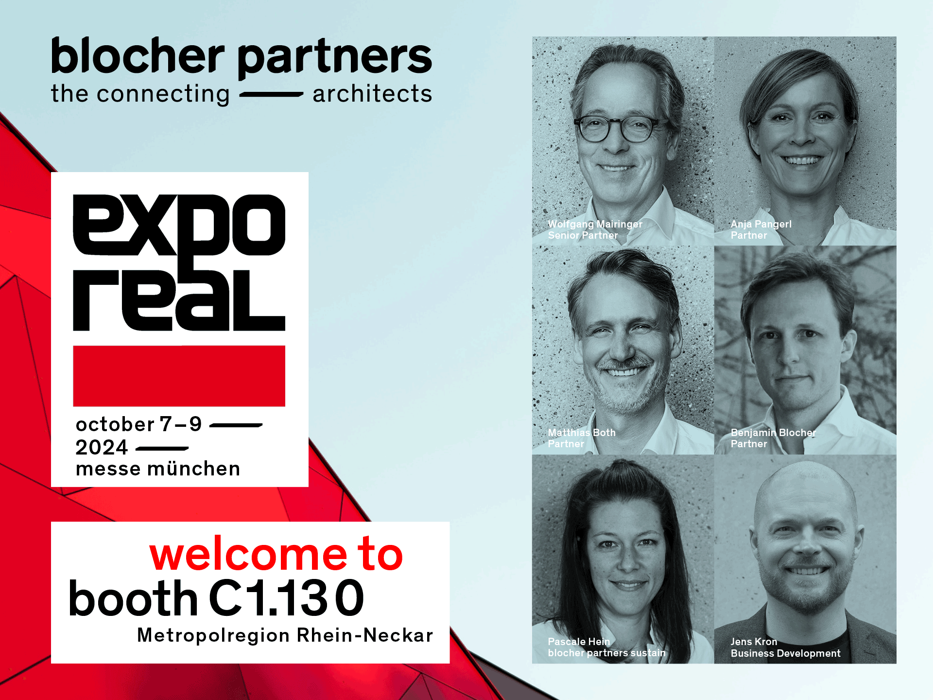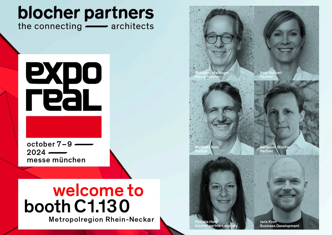 Wir freuen uns auf die EXPO Real (Link https://exporeal.net/de/) und den Austausch mit Ihnen! Am Stand der Metropolregion Rhein-Neckar C1.130 stehen Wolfgang Mairinger, Benjamin Blocher, Matthias Both, Anja Pangerl und Pascale Hein als Vertreter der Geschäftsführung sowie unser Head of Business Development Jens Kron zum Dialog bereit.