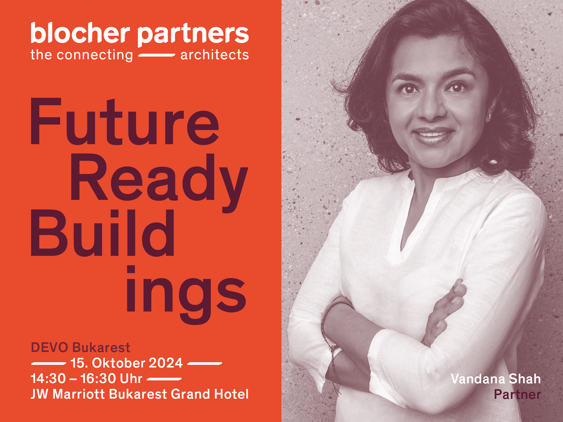 Unsere Partnerin Vandana Shah spricht am Dienstag, 15. Oktober, im Rahmen des Panels "Future-Ready Buildings" von 14.30 bis 16.30 Uhr auf der DEVO 2024 in Bukarest. Auf diesem hochkarätigen Event der Bau- und Architekturbranche wird sie den transdisziplinären Ansatz unseres Büros präsentieren und anhand ausgewählter Projekte verschiedene Maßstäbe und Herangehensweisen veranschaulichen.