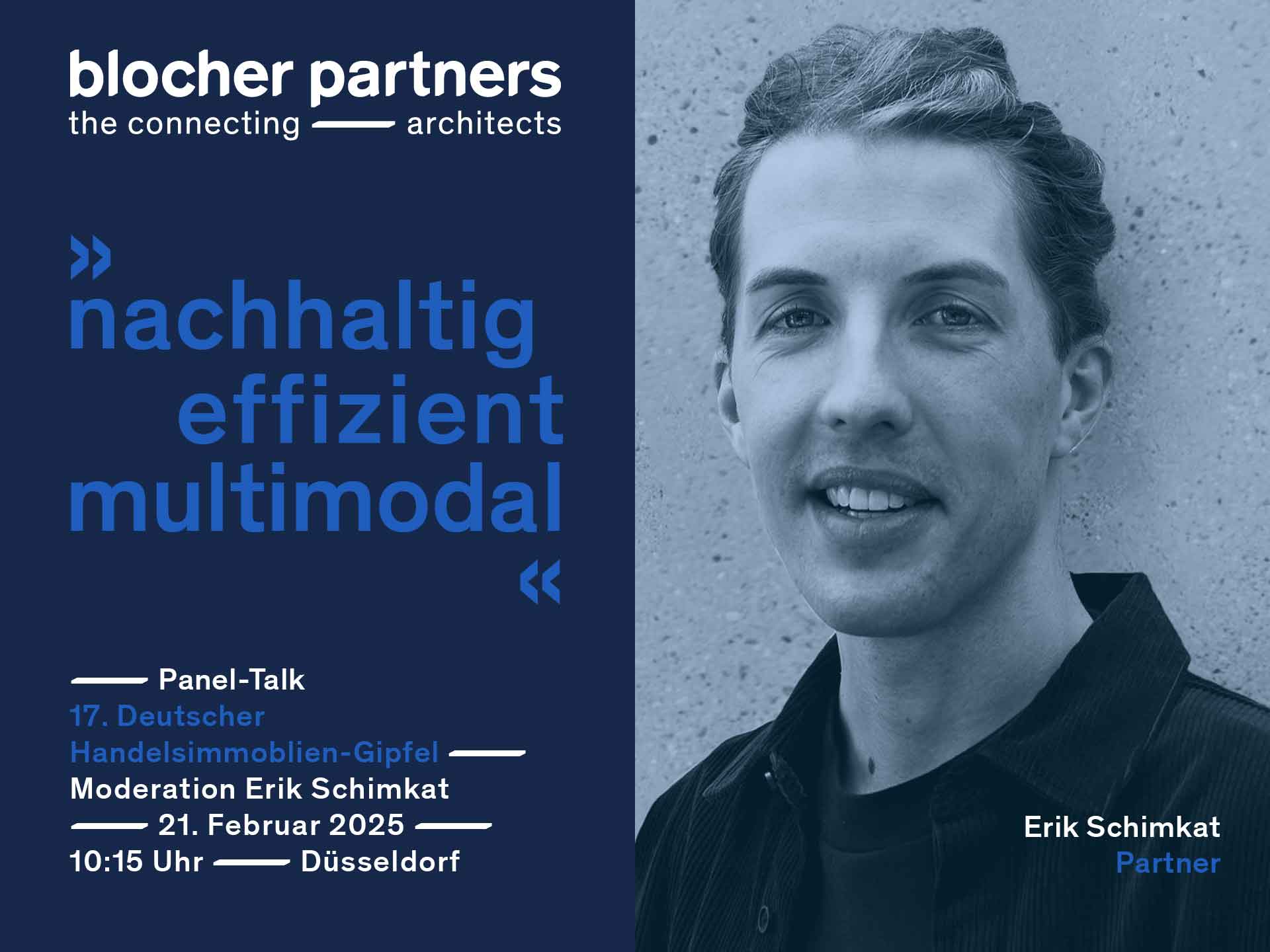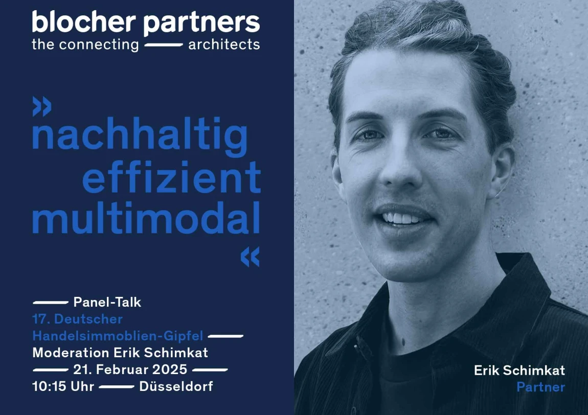 Erik Schimkat, als Geschäftsführer von blocher partners sens auf Design Strategie spezialisiert, übernimmt die Moderation am 21.02 um 10:15 Uhr und geht gemeinsam mit Fachkolleg:innen der Branche der Frage nach, wie sich Handelsimmobilien zukunftsfähig und ressourcenschonend gestalten lassen. Dabei steht besonders die Verknüpfung von Nachhaltigkeit, Effizienz und multimodalen Konzepten im Fokus: Wie können Architektur und Städtebau neue, resiliente Wege einschlagen, um Stadtquartiere und Handelsstandorte langfristig erfolgreich zu machen?