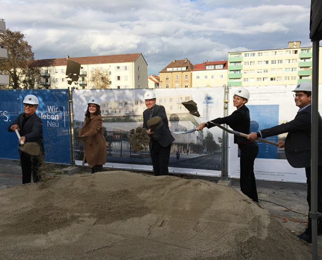 Ein weiterer Meilenstein für das Stadtentwicklungsprojekt Heiners in Neu-Ulm: Der Spatenstich des jüngst beim polis award ausgezeichneten Projekts fand im Beisein von Ministerialrätin Petra Kramer vom Bayerischen Staatsministerium für Wohnen, Bau und Verkehr, Oberbürgermeisterin Katrin Albsteiger und Berthold Stier, Geschäftsführer der Entwicklungsgesellschaft Neu-Ulm statt. Für blocher partners war Senior Partner Wolfgang Mairinger bei der Zeremonie vor Ort. Erfahren Sie mehr zum über das vielfältige, gemischt genutzte Gebäude.