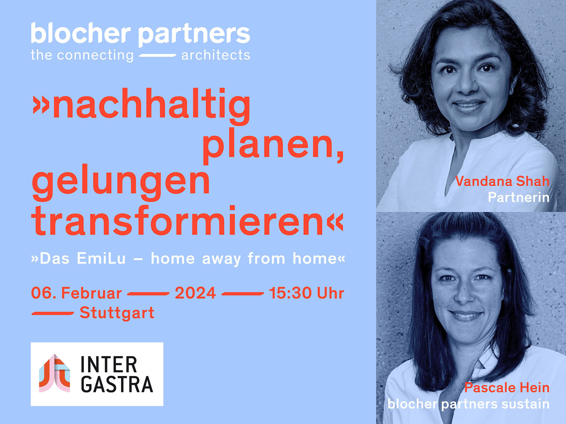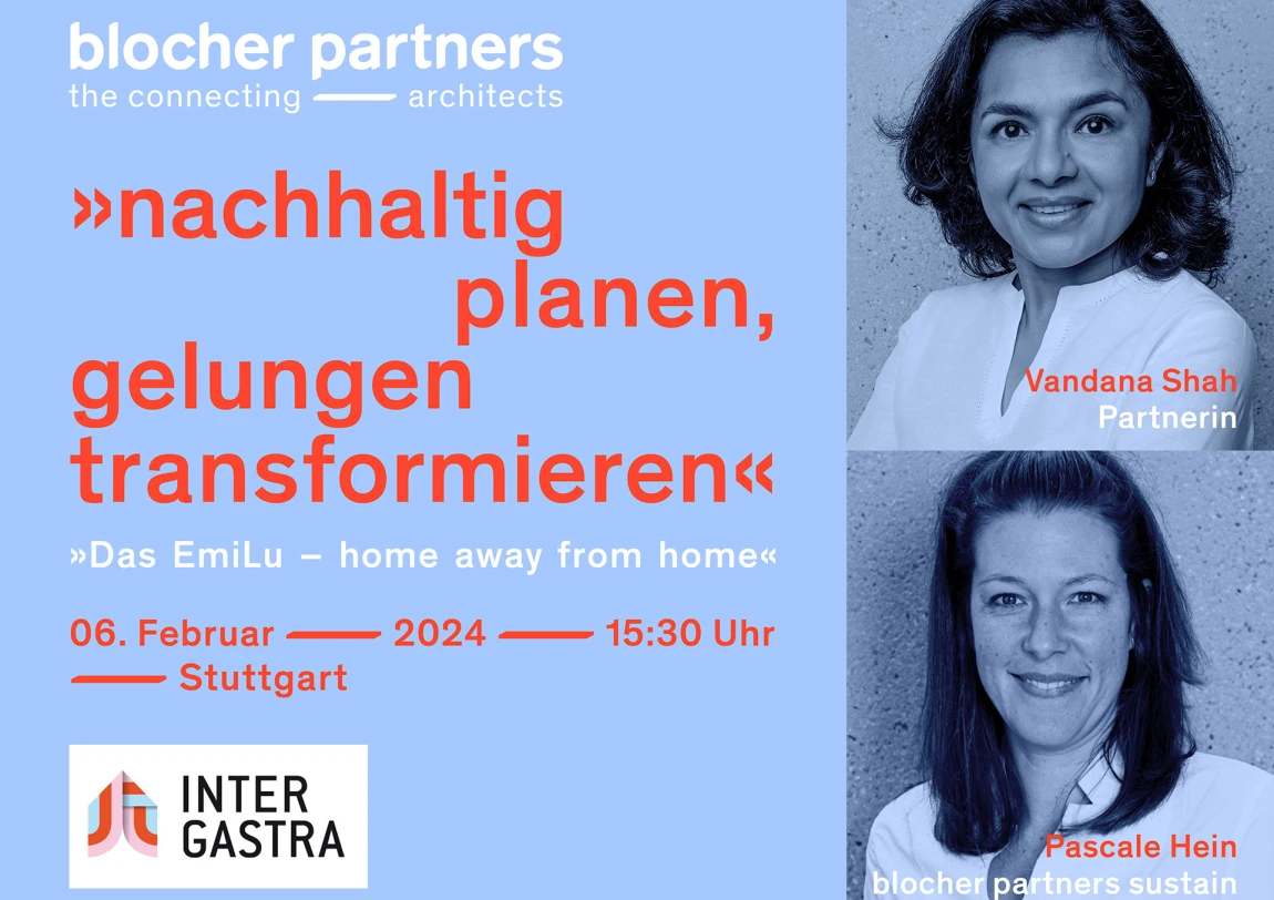 Am Wochenende öffnet die Intergastra in Stuttgart, Leitmesse für Hotellerie & Gastronomie, wieder ihre Pforten. Als Referentinnen werden Vandana Shah, Partnerin blocher partners, und Pascale Hein, Geschäftsführerin blocher partners sustain, am Dienstag, 6. Februar, auf der Green Stage in Halle 4 im Forum »Intelligente Kreislaufwirtschaft in Hotellerie & Gastronomie« am Beispiel des Designhotels EmiLu über nachhaltige Planung und gelungene Transformation berichten.