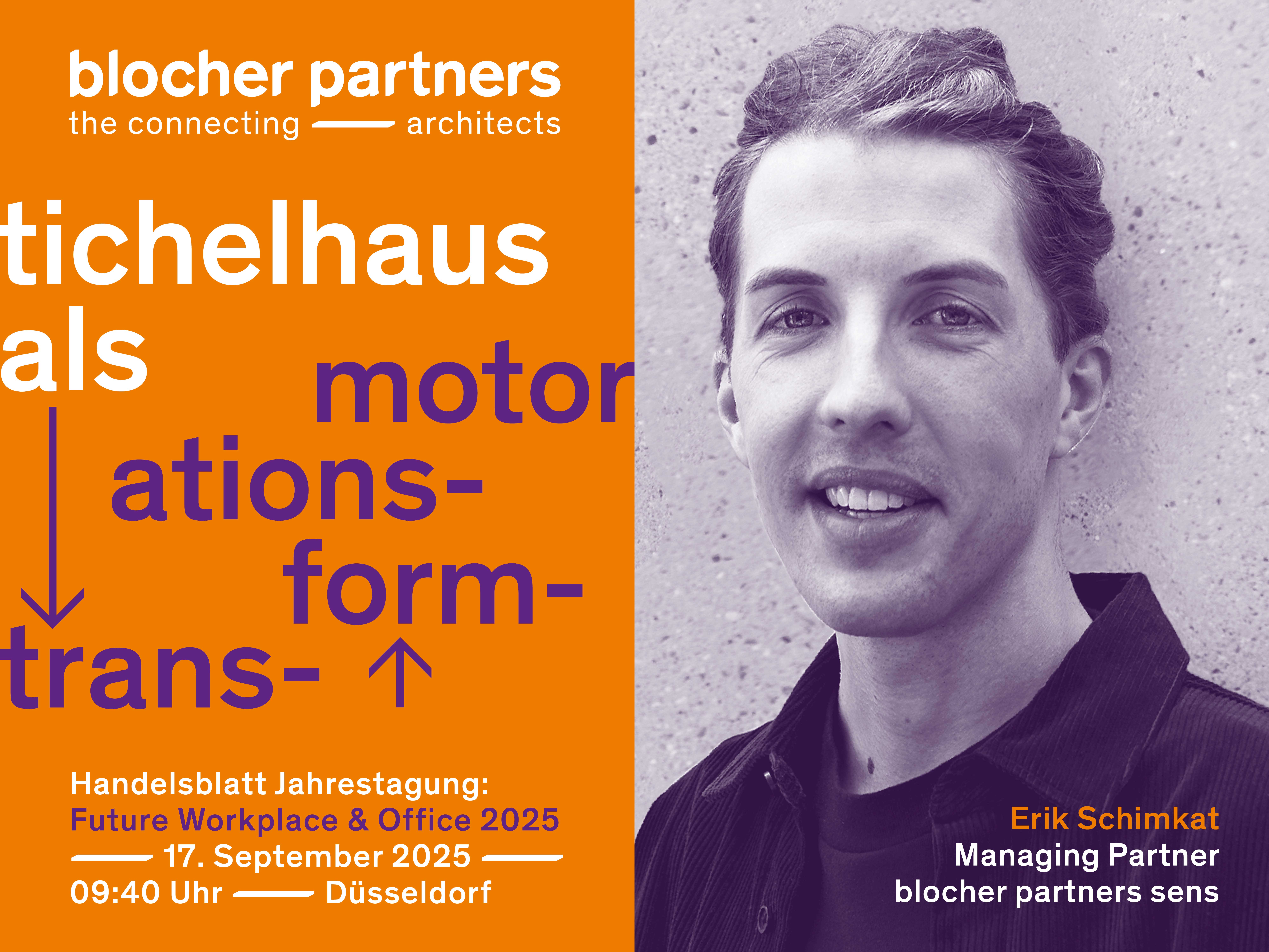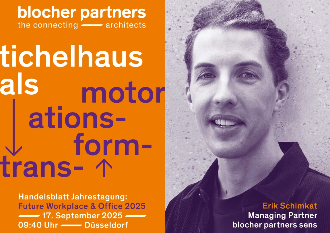 Erik Schimkat, Geschäftsführer blocher partners sens, und Rainer Huff (Telefónica Germany) berichten am 17. September um 9.30 Uhr im Rahmen der zweitägigen Konferenz Future Workplace & Office in Düsseldorf über den Standortwechsel von o2 Telefónica. Der Vortrag zeigt, wie der Umzug ins Hamburger Tichelhaus entlang der vier Dimensionen Bricks, Bytes, Behavior und Brand zum Transformationsmotor wurde. Die Veranstaltung ist Teil der Jahrestagung der Handelsblatt Mediengruppe.