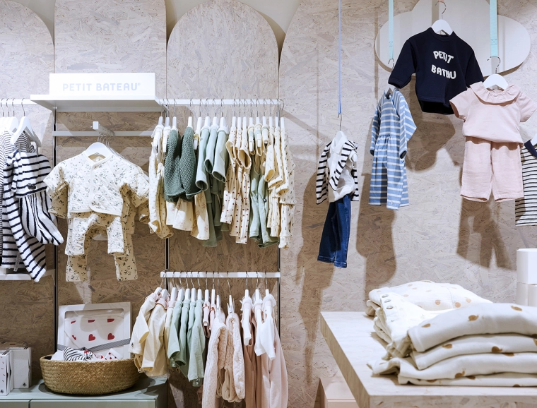 Im Stammhaus des Modefilialisten Angéloz transformierten die Planer die ehemals als Verwaltungsfläche genutzte zweite Etage in eine attraktive Modeabteilung,zusätzlich planten sie die Kinderwelt im zweiten Untergeschoss. Die Verkaufsfläche wuchs damit um ein Drittel. Ein Highlight ist die großzügige Kundentreppe. Vertikale Kacheln und Holzlamellen verleihen dem Treppenhaus Dynamik und Wärme. Im Zuge der Modernisierung überarbeiteten die Innenarchitekten zudem alle Etagen und entfernten eines der zwei Mitarbeiter-Treppenhäuser, um die Verkaufsflächen großzügig wirken zu lassen. Diesen Eindruck unterstreichen auch die vergrößerten Fenster und der Verzicht auf abgehängte Decken.