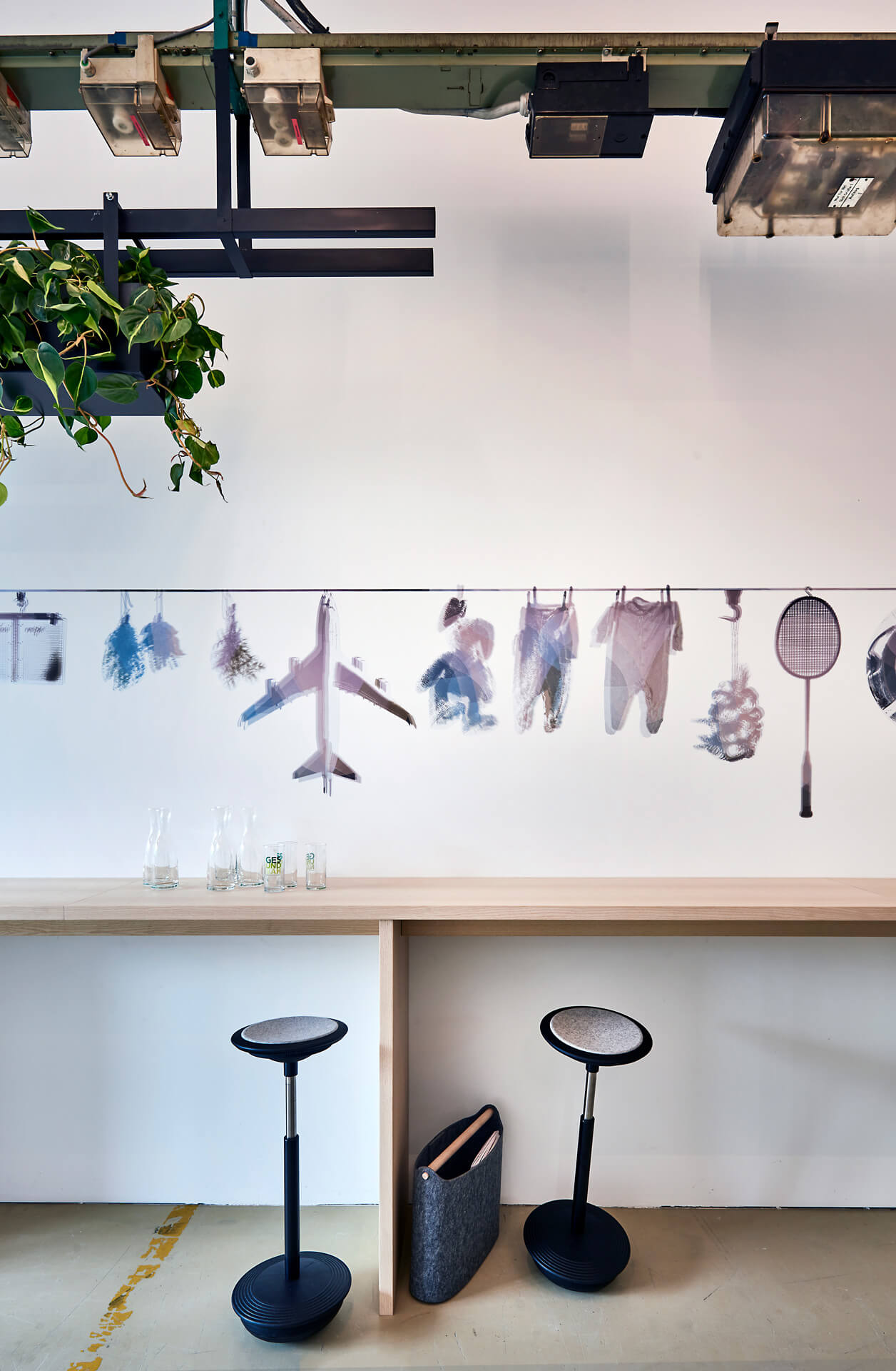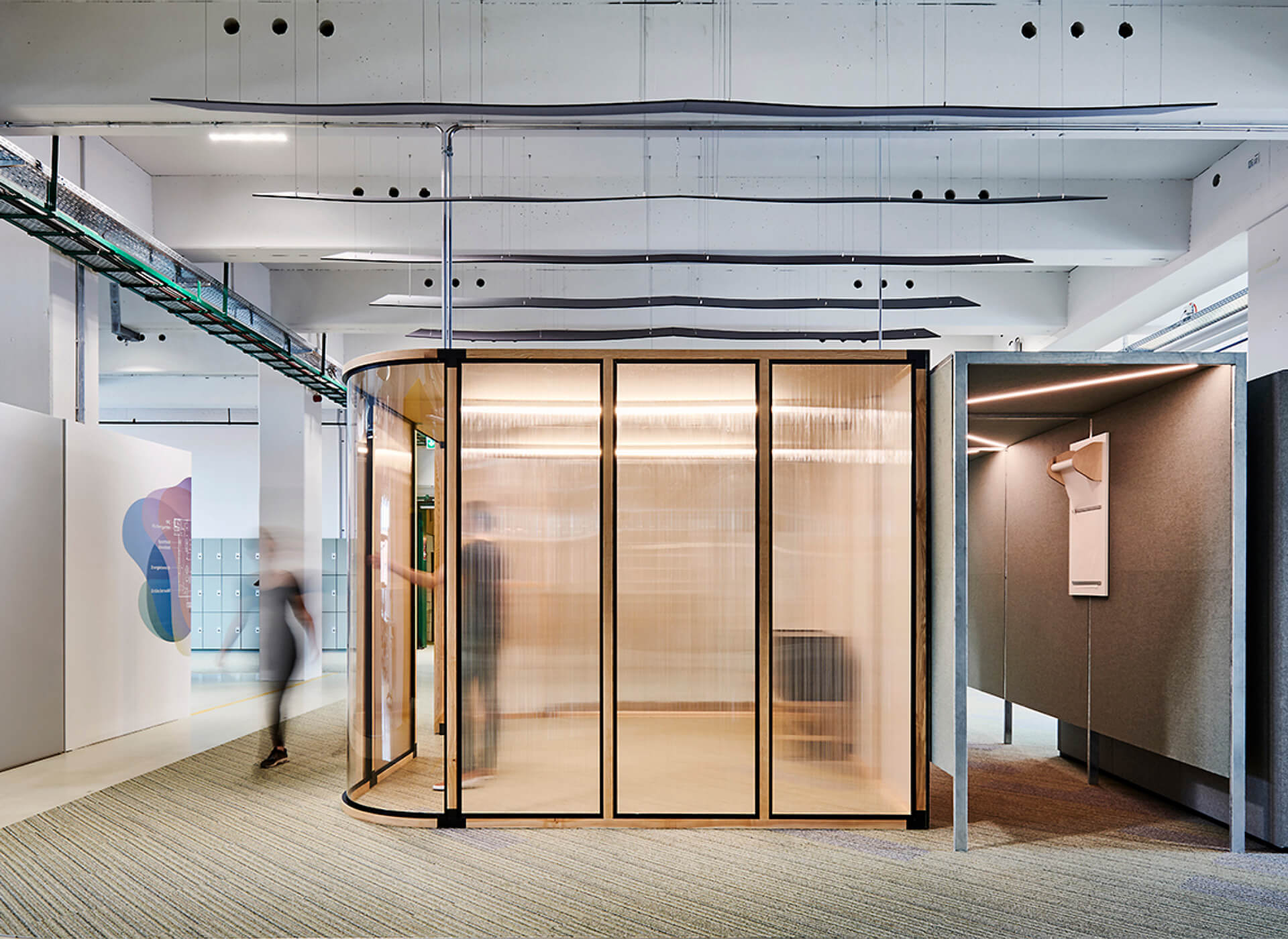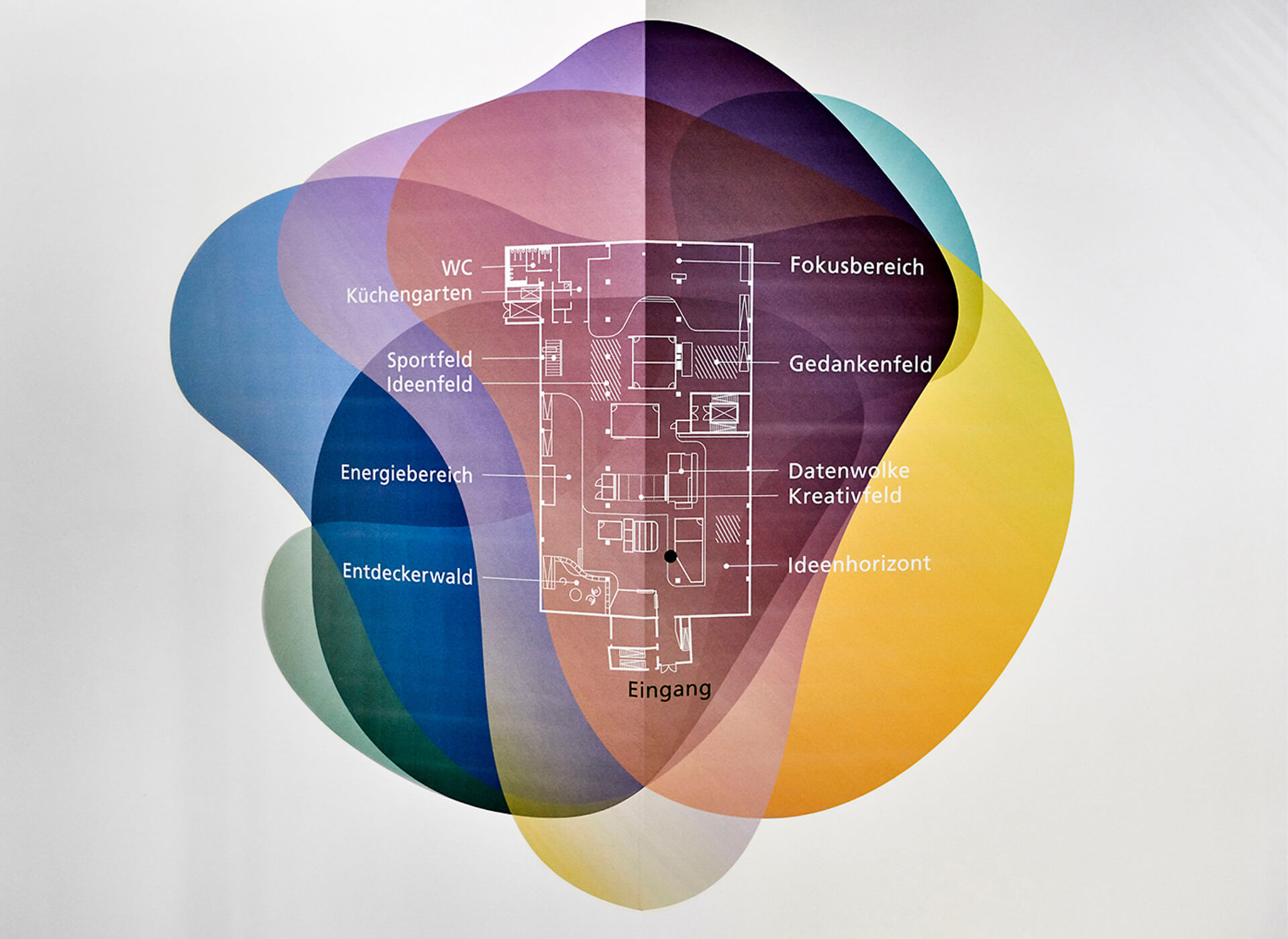 Das Leitsystem ermöglicht eine übergeordnete und intuitive Raumerfahrung, indem sie den grundlegenden Funktor dieser Idee aufgreift: ein lebender Organismus. Ein System der Bewegung. Eines, das sich stetig reproduziert – in Variation, in Schichtungen, Verzweigungen, Überlagerungen, Verbindungen. Daher: Fünf organische Formen mit fünf Farben für die fünf Werte als transparenter Kanon. Es gibt einen Attraktor, um den herum sich alles moduliert und bewegt. Wir nennen es »die Wolke«. Eine Ideenwolke. Eine sich selbst reproduzierende Formenvariation lebendiger Initiale.