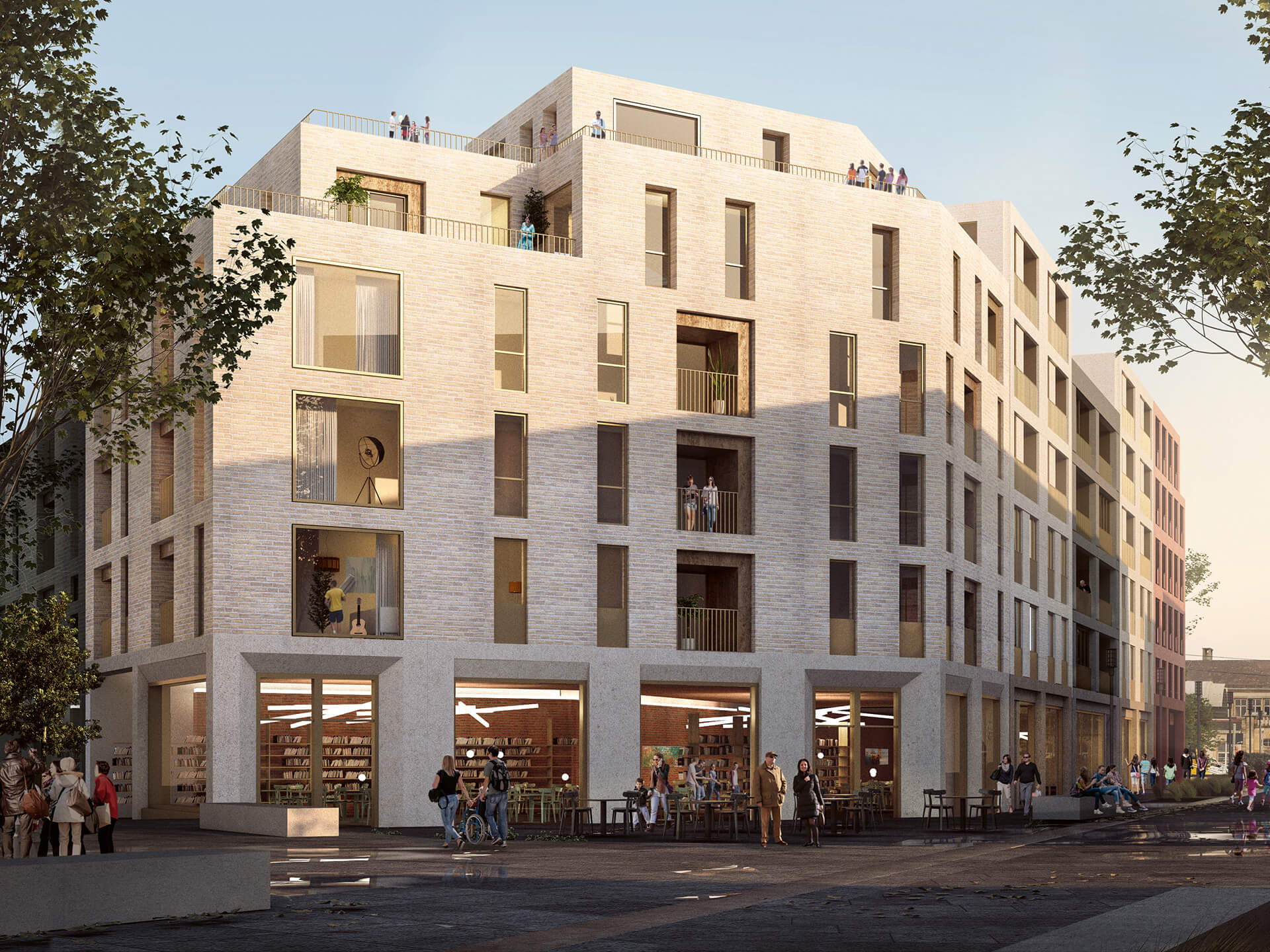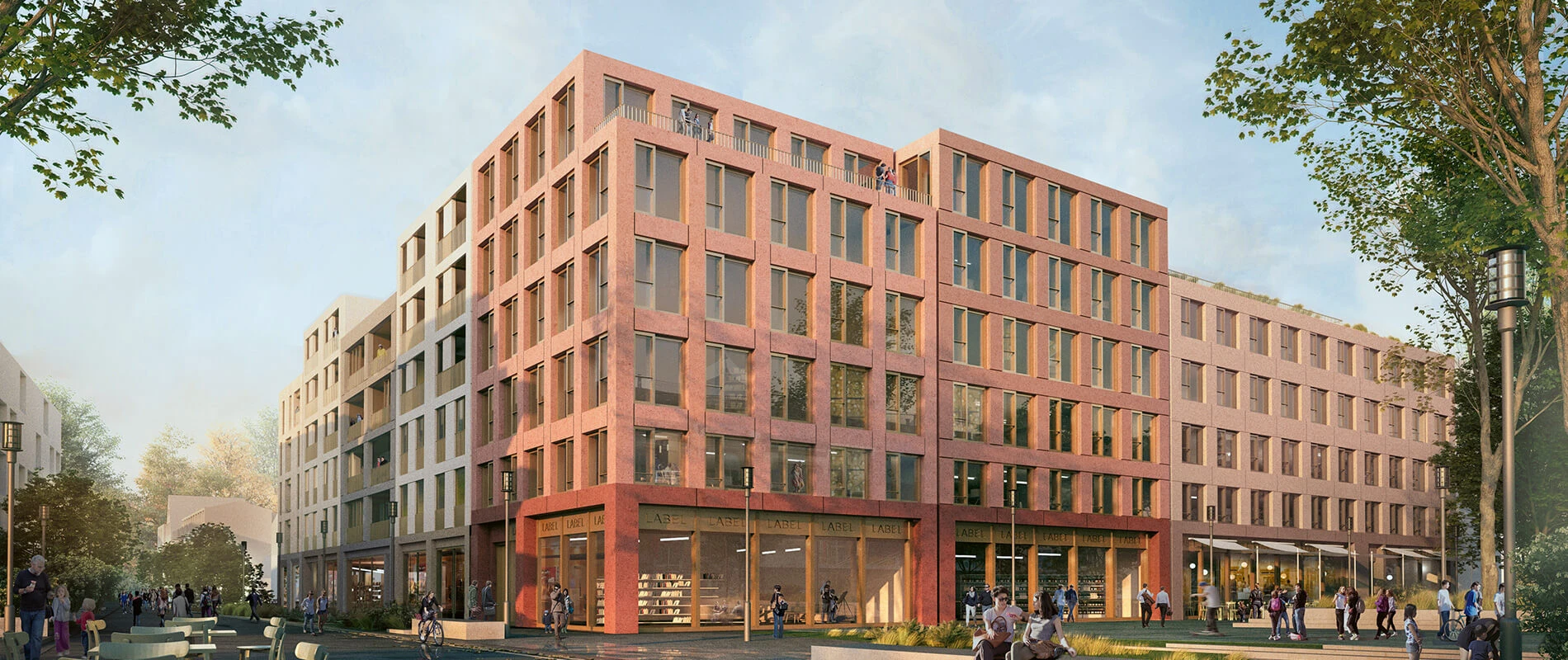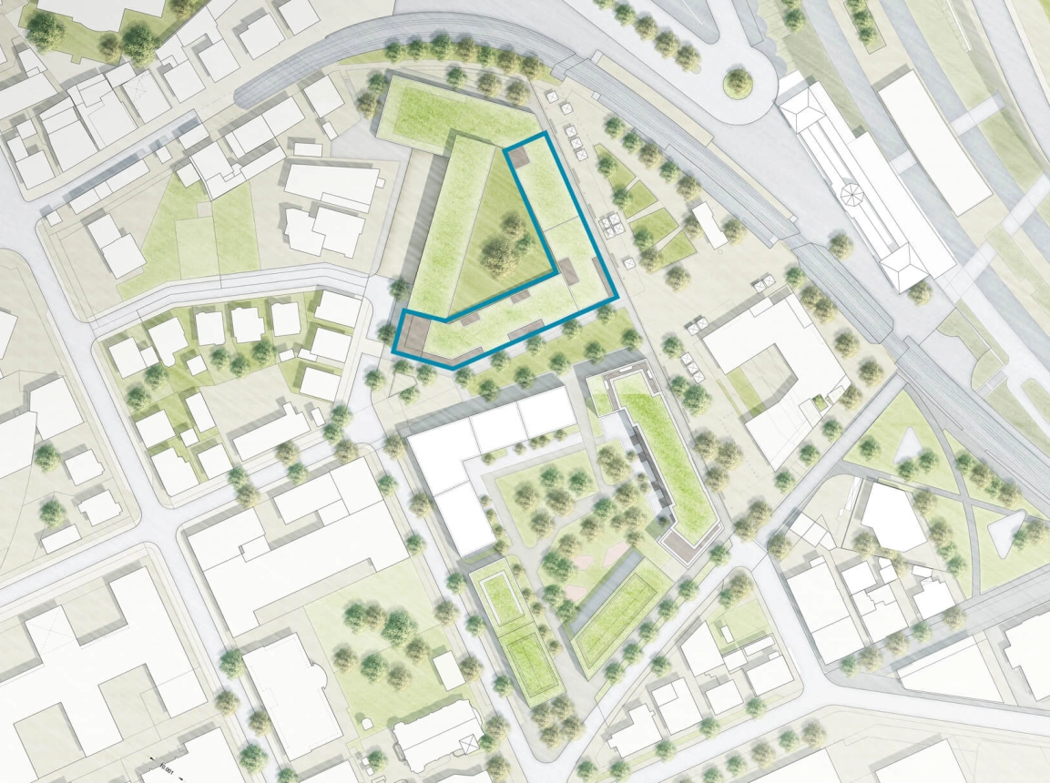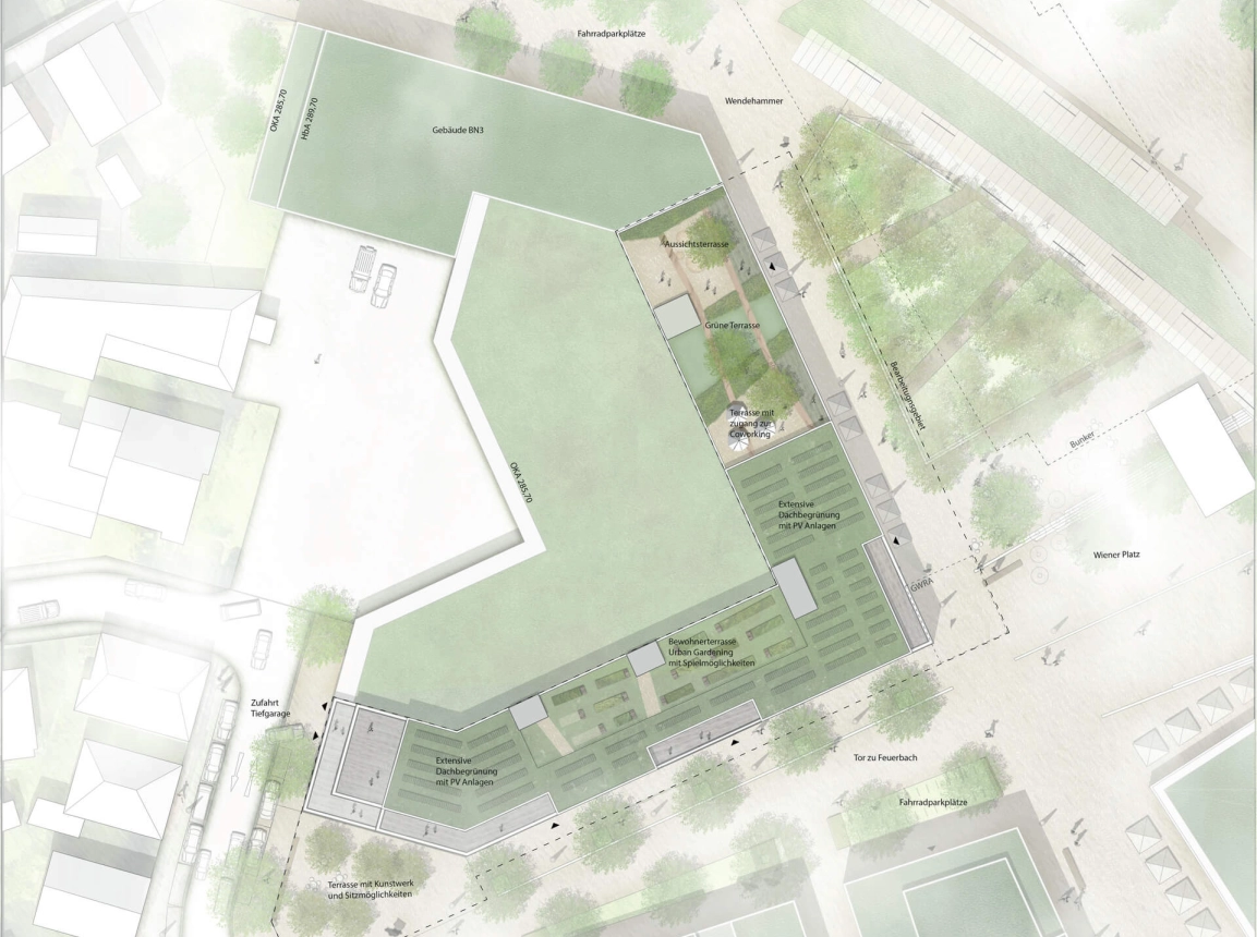 Als markanter und identitätsstiftender Stadtteileingang eröffnet sich in Zukunft das Areal am Wiener Platz in Stuttgart-Feuerbach. Shops und Cafés in den Erdgeschossen, Wohn- und öffentliche Nutzungen in den oberen Stockwerken sowie die Adressierung direkt an der Fußgängerzone sorgen für ein lebendiges Flair. Das Quartier verbindet sich mit der Stadt und schafft unter den Bewohnern Identität. Die kleinteilige Struktur, wechselnde Materialien sowie die unterschiedlichen Fensterformate und Loggien betonen den urbanen Charakter und integrieren den Baukörper harmonisch in seine Nachbarschaft.