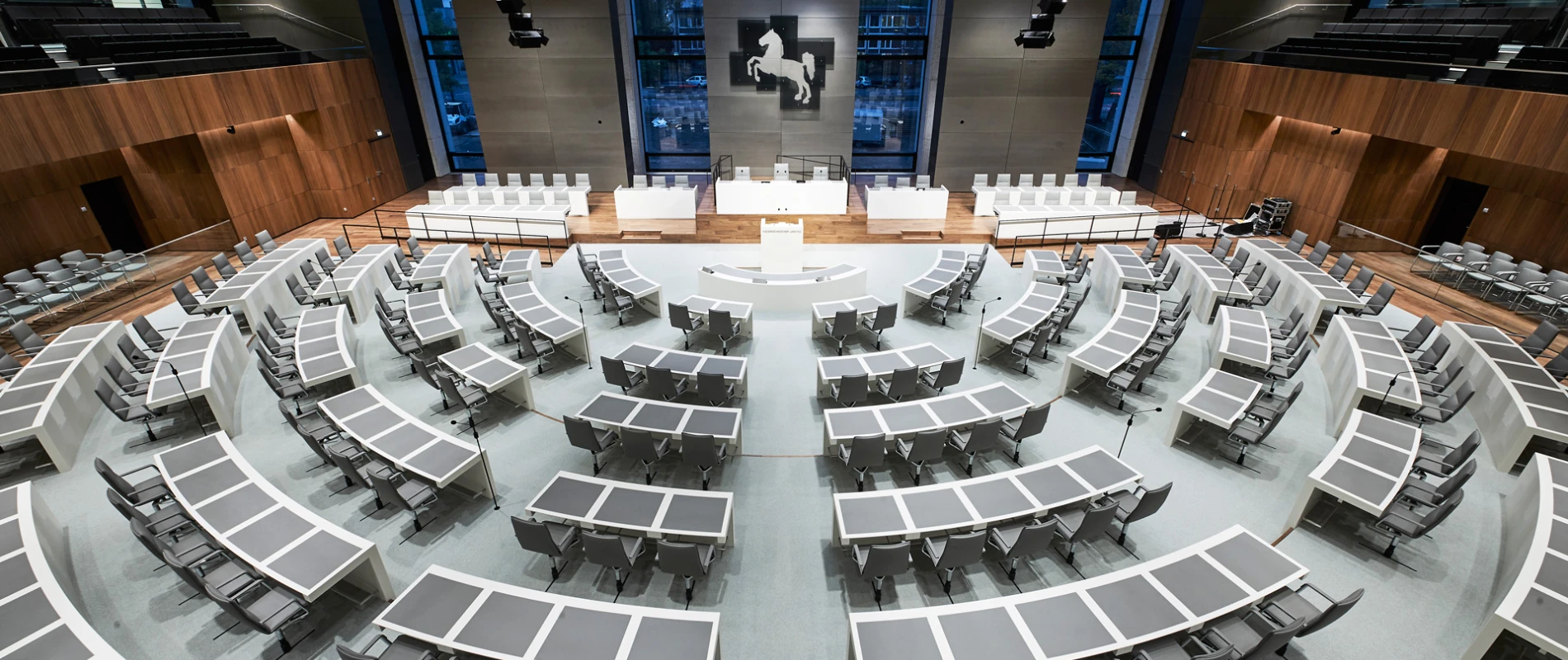 Der bis zu 150 Abgeordnete und 261 Besucher fassende Plenarsaal ist ganz auf die Stirnseite mit Sichtbezug zur Stadt ausgerichtet, wo die Präsidiumswand angeordnet ist. Genau hier thront auch das neue Wahrzeichen des Landtags – das Niedersachsen-Ross, das typenraum in Zusammenarbeit mit den Architekten entwickelte.