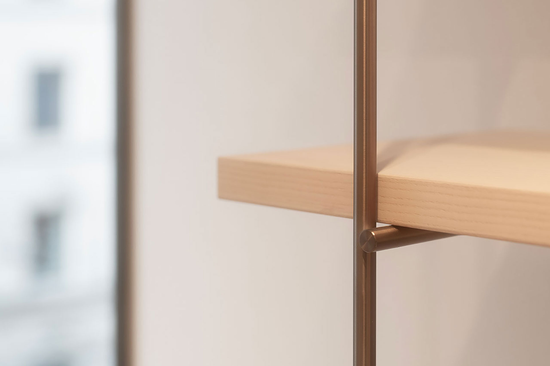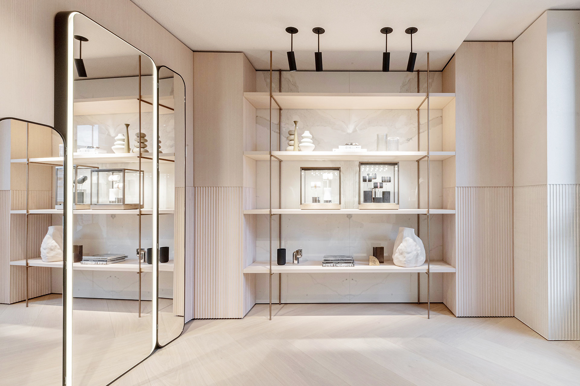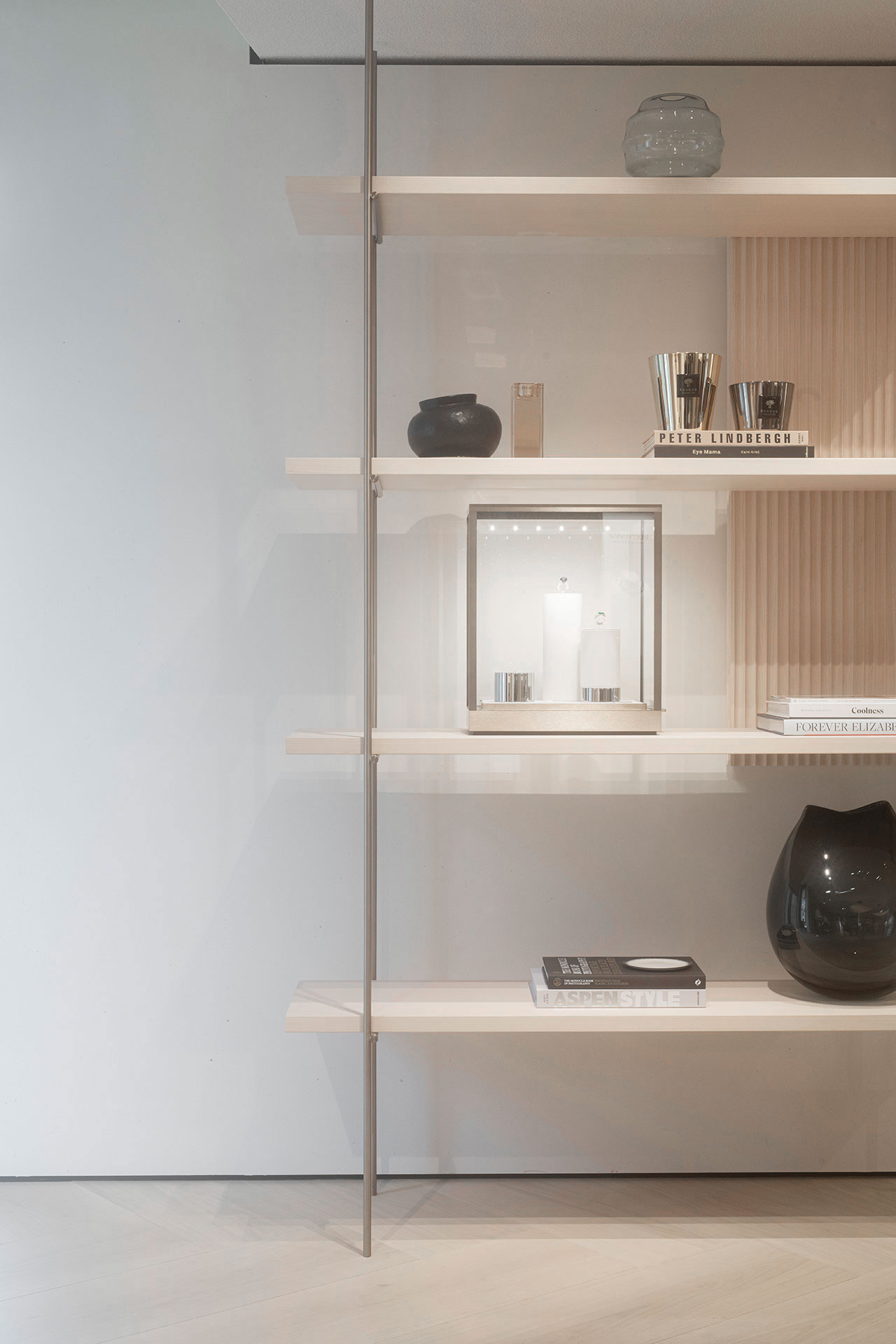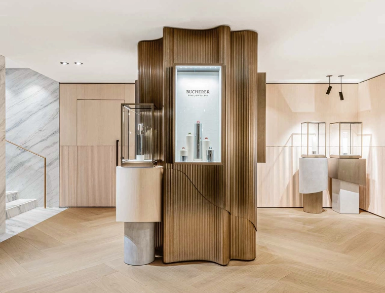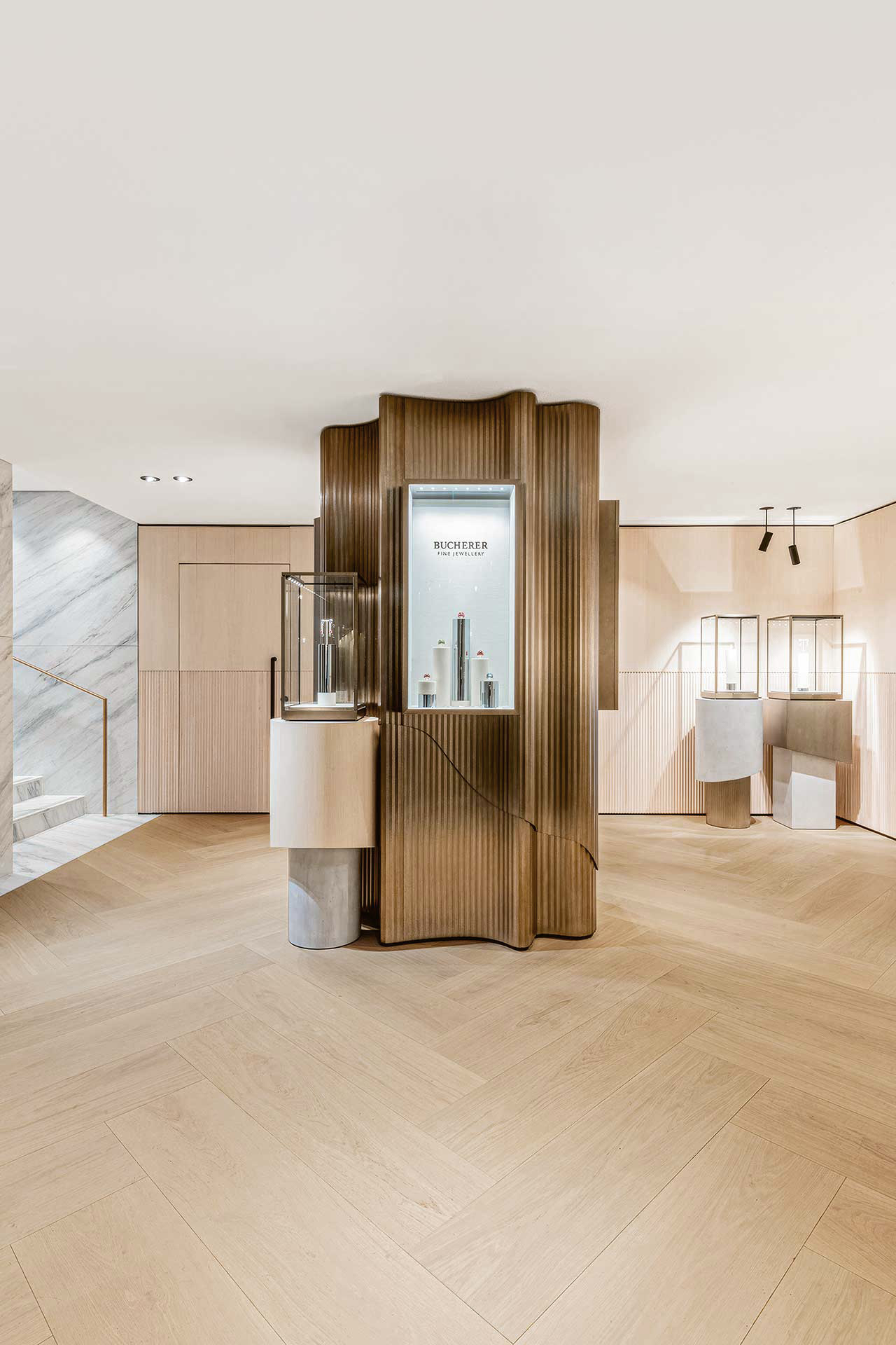 Die von blocher partners verwendeten Materialien sind nicht nur nachhaltig und langlebig, sondern spiegeln auch die Qualität der angebotenen Produkte wider. Geweißtes Eschenholz-Stucco sowie Stuccolustro an den Wänden, Holzfußböden und Natursteinoberflächen harmonieren mit den Schmuckstücken. Möbel aus Edelstahl und Sicht-beton ergänzen das Interieur. Die von blocher partners entworfenen Regale und die Visual Merchandising-Tools zeigen eine leichte, aber robuste Konstruktion. Eine zentrale, mit einer messingfarbenen Metallwelle verkleidete Stütze, die von Schaukästen umgeben ist, bildet das Herzstück des Bereichs und dient gleichzeitig als beeindruckende Skulptur. Die sorgfältig geplante Beleuchtung inszeniert die Schmuckstücke.
