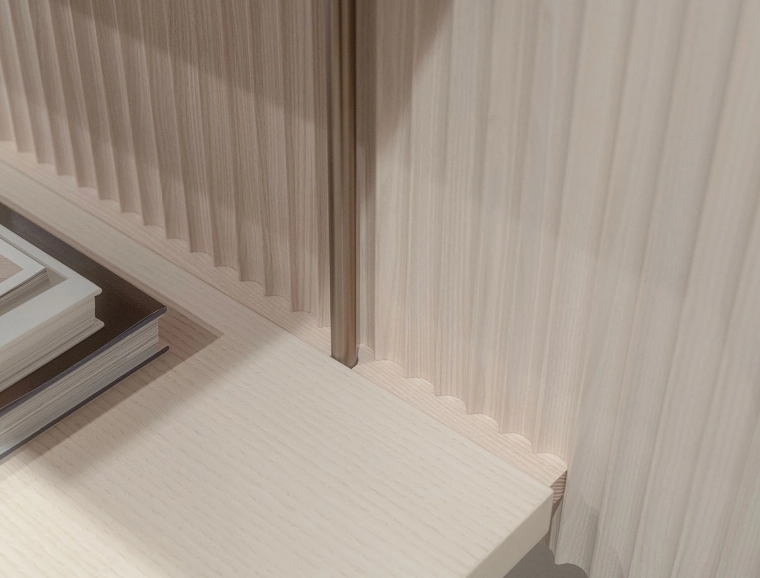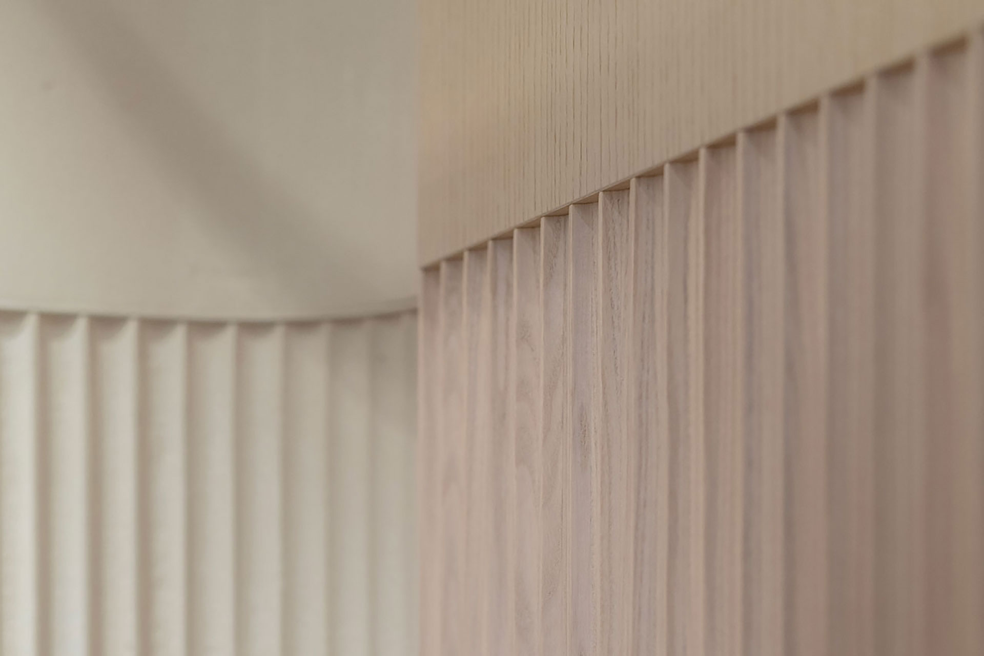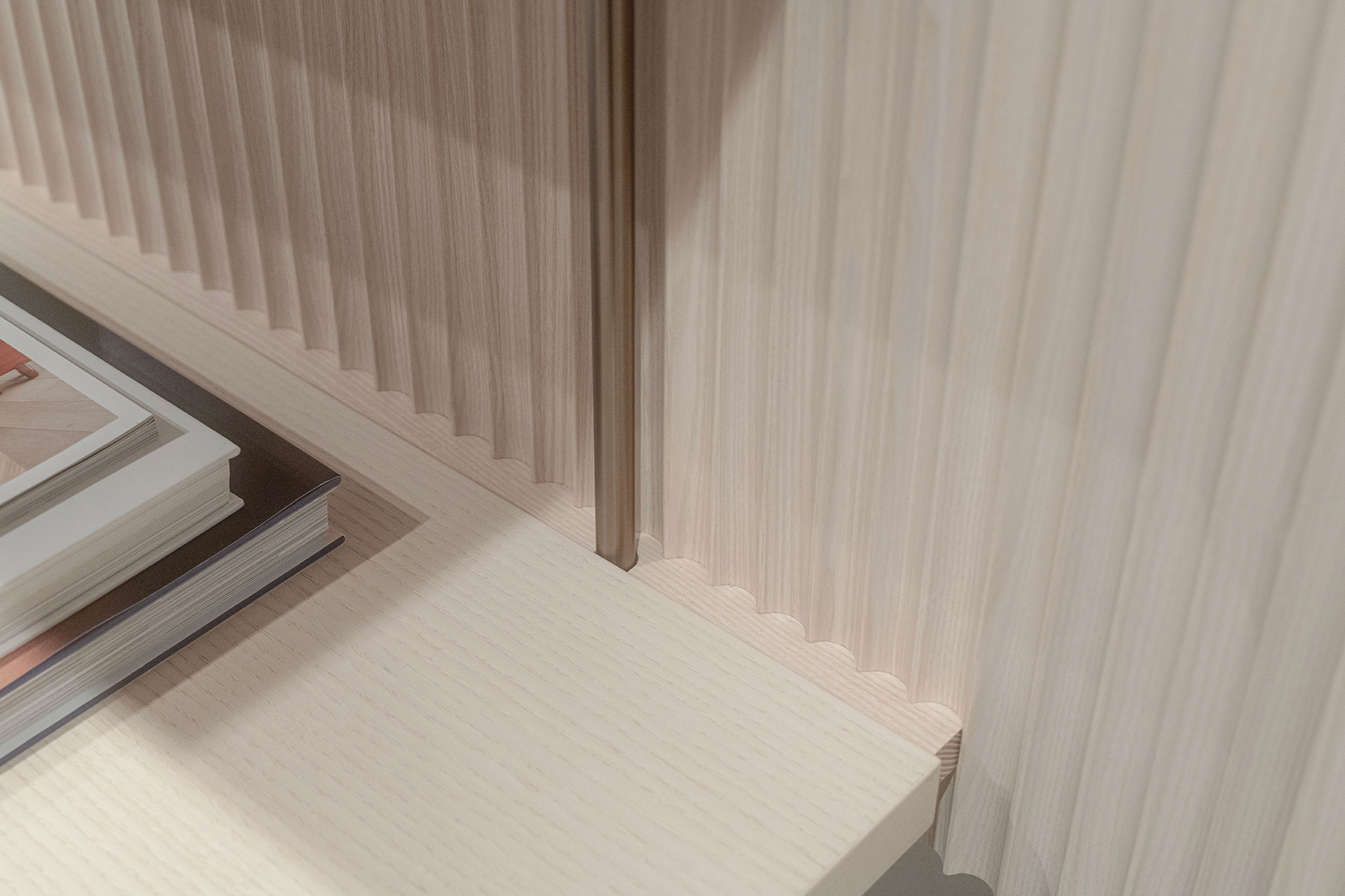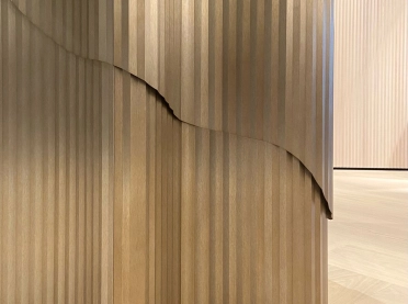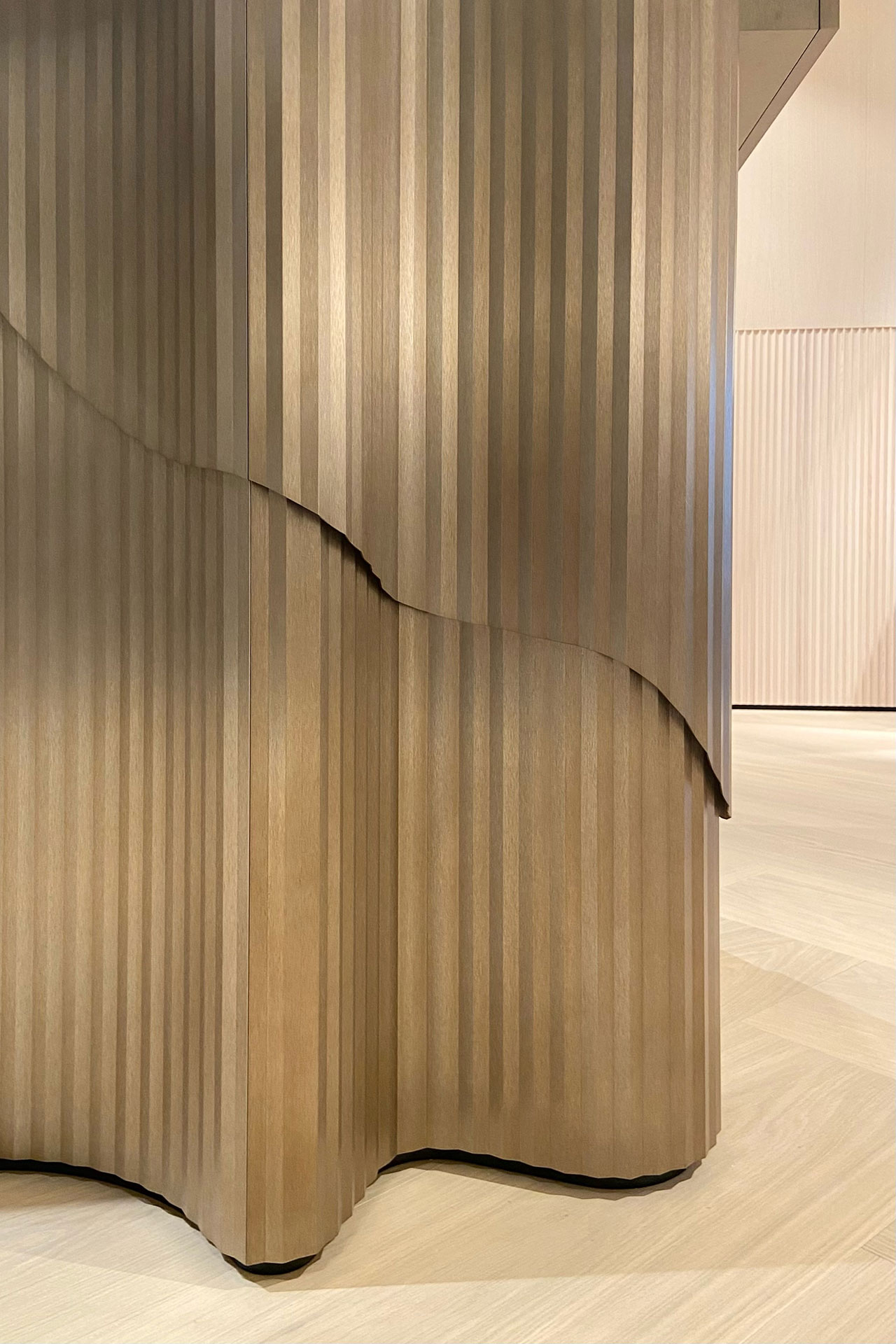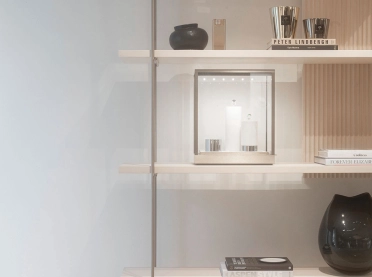 Die von blocher partners verwendeten Materialien sind nicht nur nachhaltig und langlebig, sondern spiegeln auch die Qualität der angebotenen Produkte wider. Geweißtes Eschenholz-Stucco sowie Stuccolustro an den Wänden, Holzfußböden und Natursteinoberflächen harmonieren mit den Schmuckstücken. Möbel aus Edelstahl und Sicht-beton ergänzen das Interieur. Die von blocher partners entworfenen Regale und die Visual Merchandising-Tools zeigen eine leichte, aber robuste Konstruktion. Eine zentrale, mit einer messingfarbenen Metallwelle verkleidete Stütze, die von Schaukästen umgeben ist, bildet das Herzstück des Bereichs und dient gleichzeitig als beeindruckende Skulptur. Die sorgfältig geplante Beleuchtung inszeniert die Schmuckstücke.