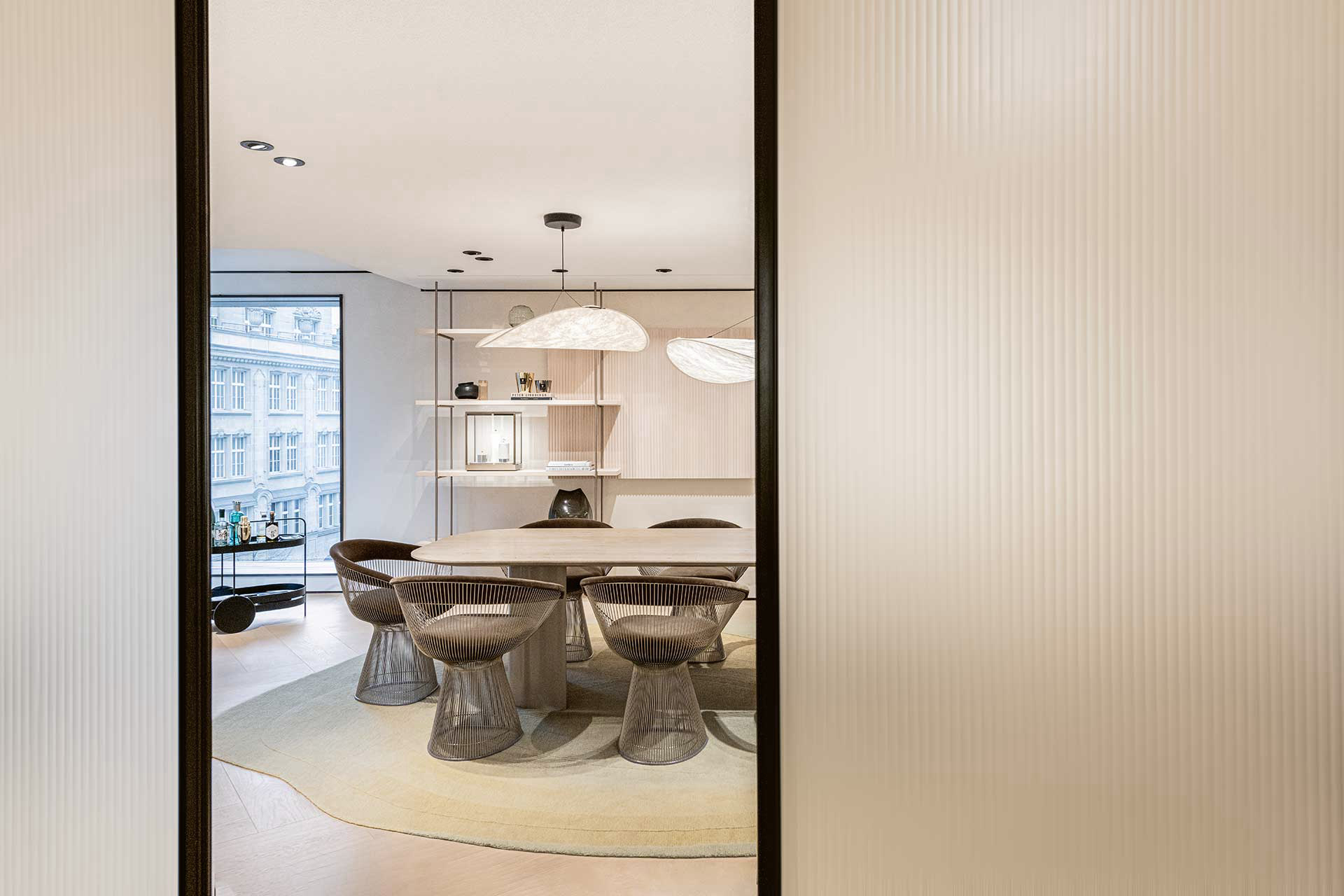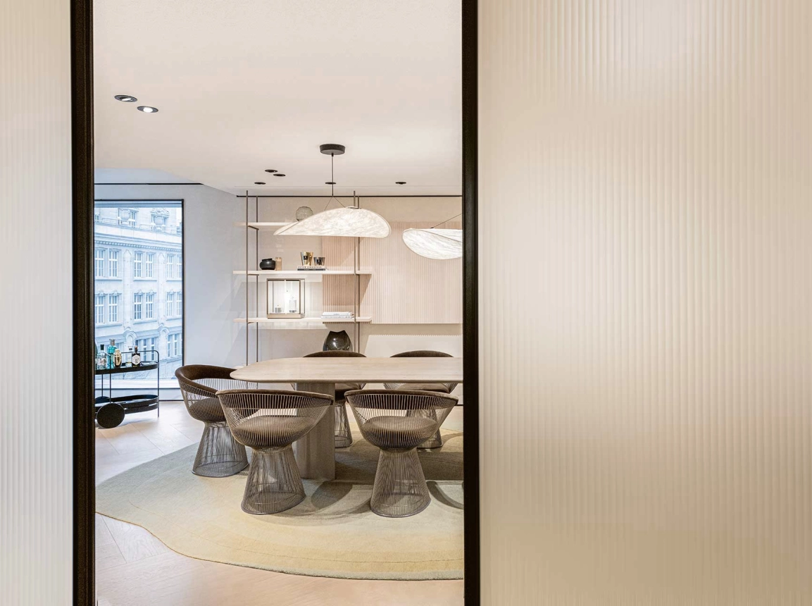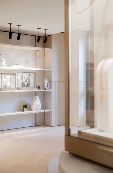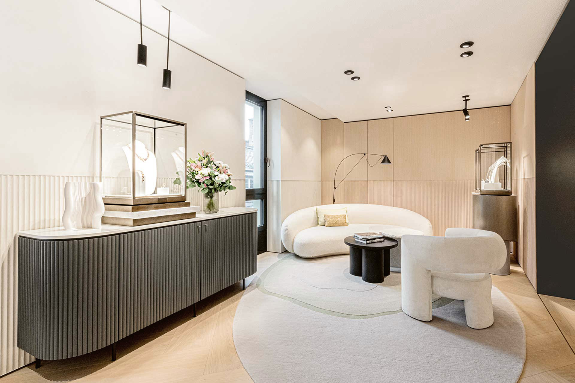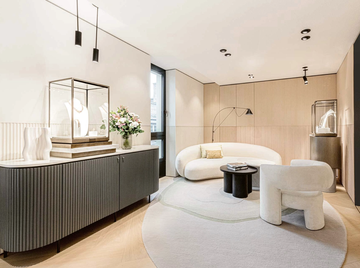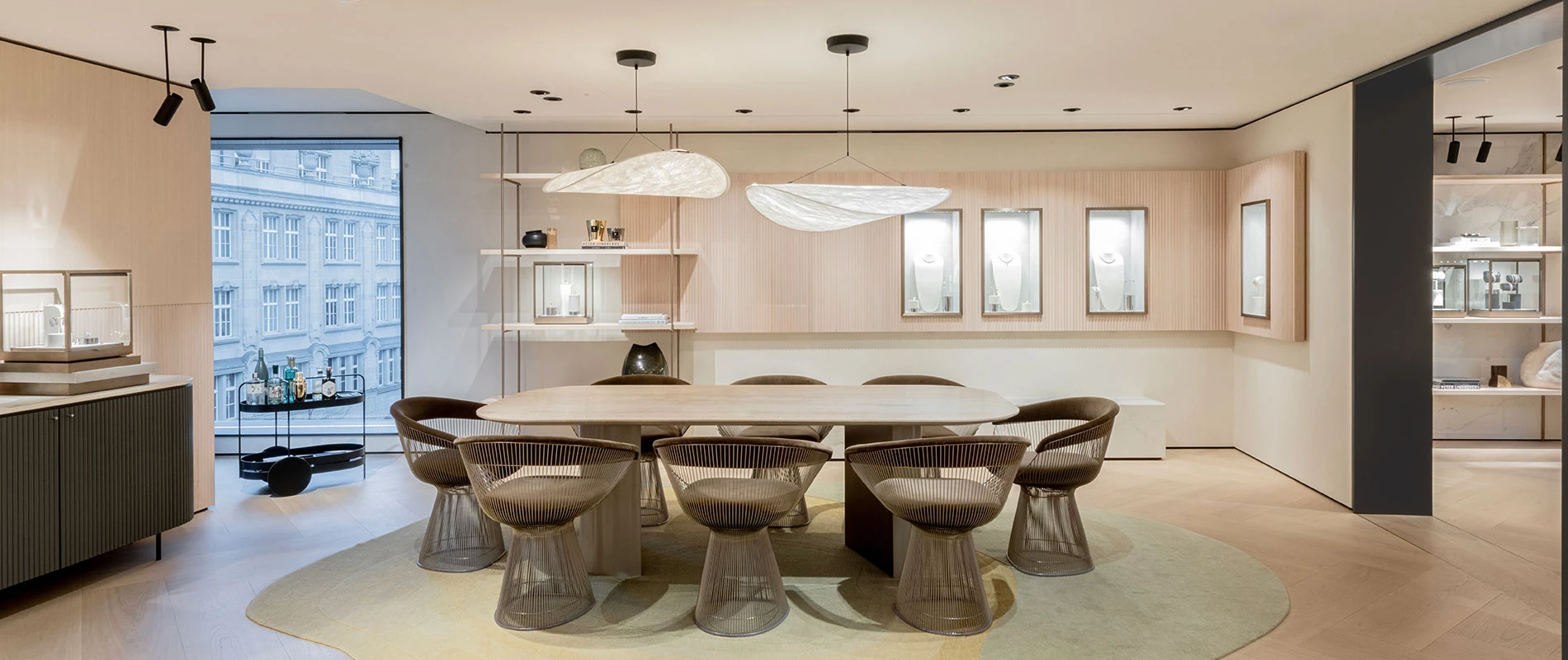 Die Räumlichkeiten sind mit einer warmen, wohnlichen Atmosphäre ausgestattet, die an ein luxuriöses Wohn- und Esszimmer erinnert und die anspruchsvolle Klientel zum Verweilen einlädt. Ein speziell gestalteter VIP-Raum erhöht die Exklusivität und bietet Gästen einen privaten Rückzugsort. Die neugestaltete High Jewellery-Abteilung ist über einen Durchgang direkt mit dem benachbarten Sotheby’s verbunden.