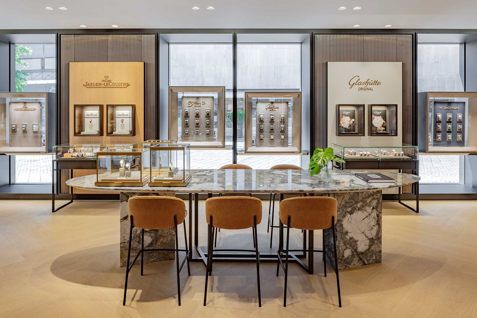 Die Innenarchitektur reflektiert die luxuriöse Markenidentität von Bucherer durch ein gekonntes Zusammenspiel von Materialien wie Parkett, Holz und Marmor. Gleichzeitig nimmt die Gestaltung die Bauepoche des Gebäudes auf – Farben und Waschbetonwände setzen Akzente, die den historischen Kontext würdigen und den Store in die Umgebung einbinden.