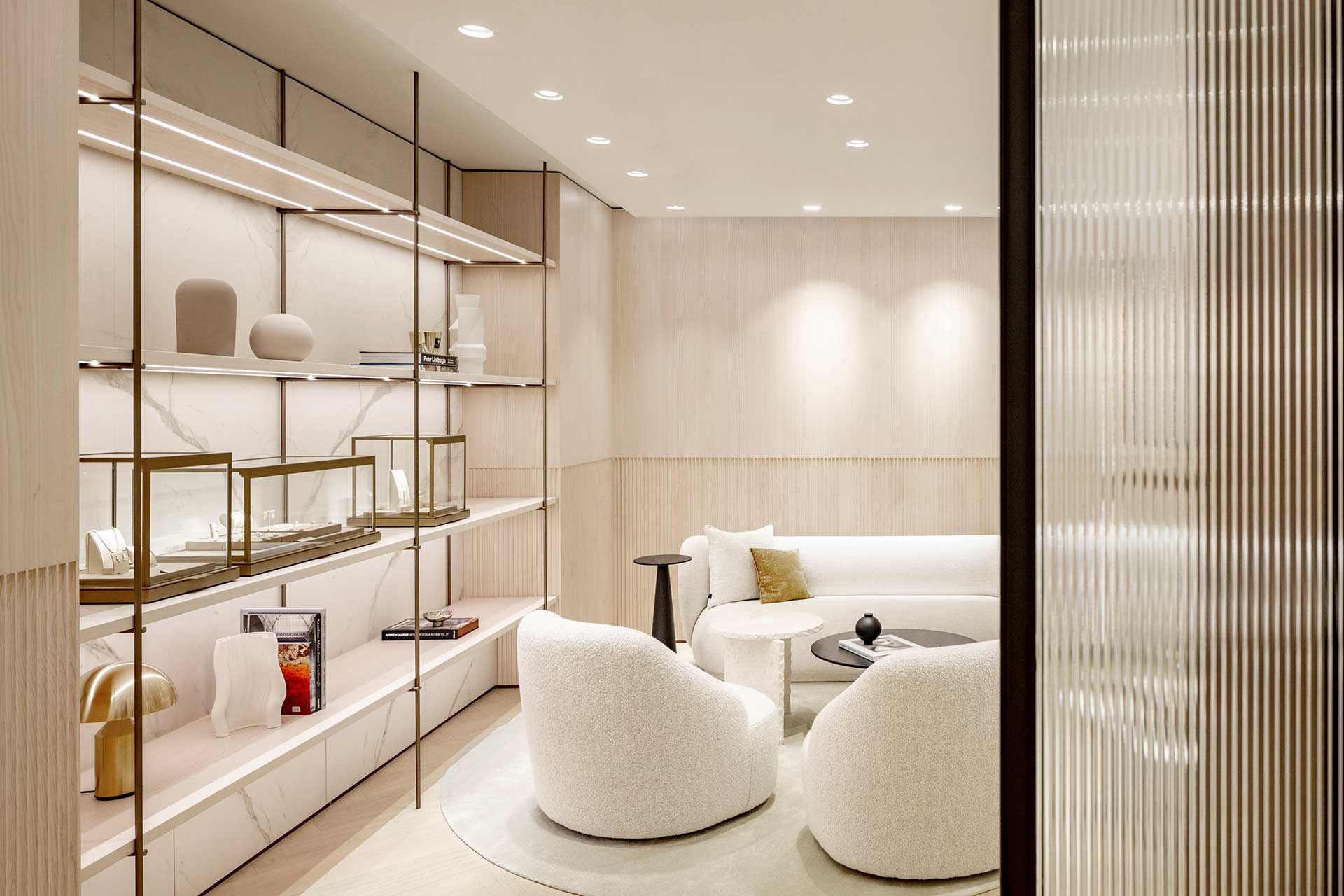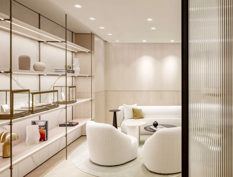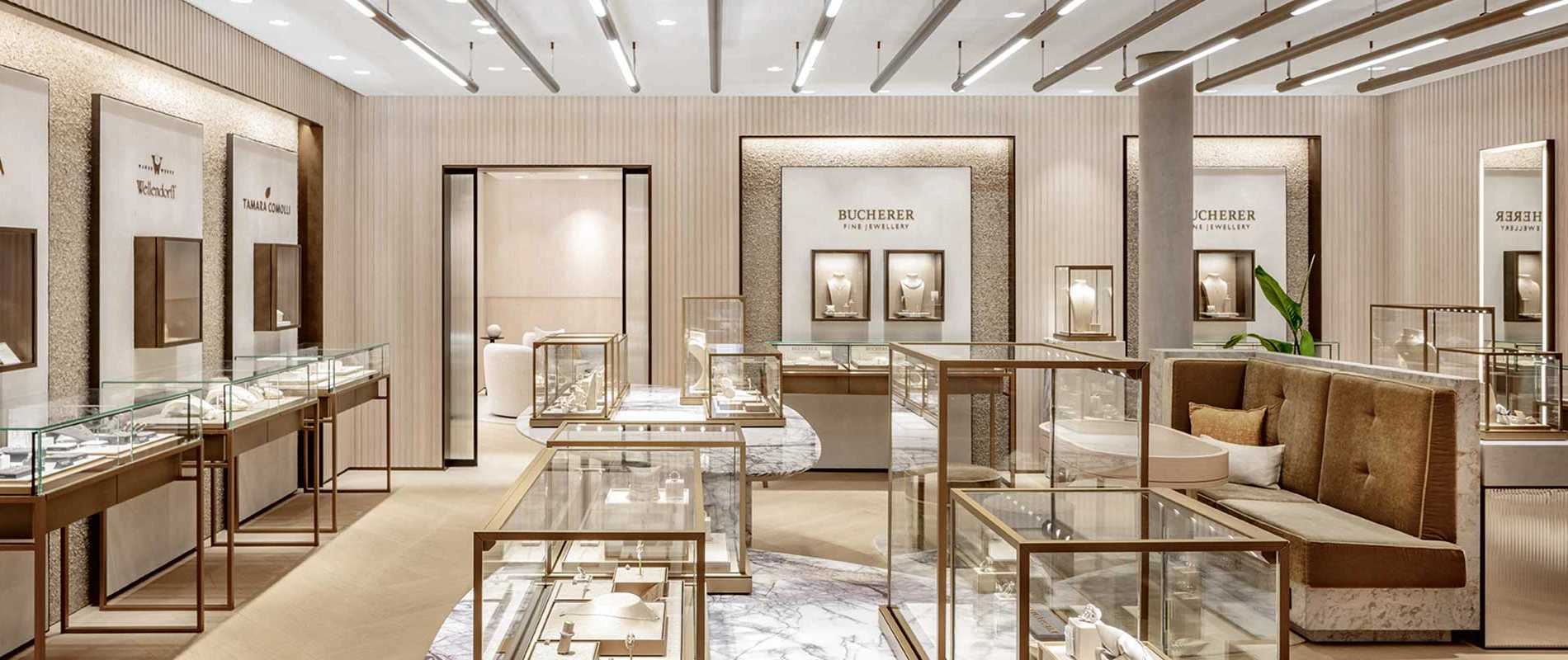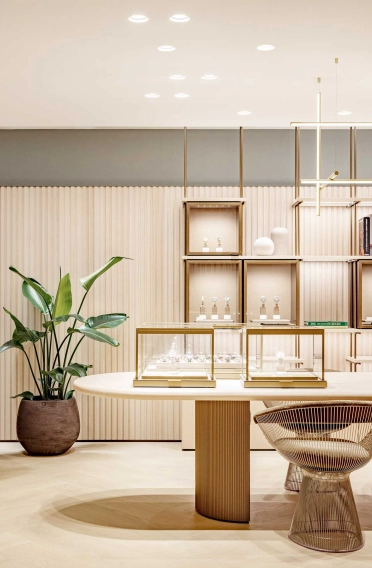 Prägnante Lichtstäbe zonieren im Erdgeschoss die Bereiche Uhren und Schmuck, unterstützen die Orientierung, setzten die Produkte perfekt in Szene und betonen so die Exklusivität der Markeninszenierung. Eine Wendeltreppe führt ins Untergeschoss, wo Kunden neben einer Eventfläche auch auf Certified Pre-Owned (CPO) Uhren stoßen.