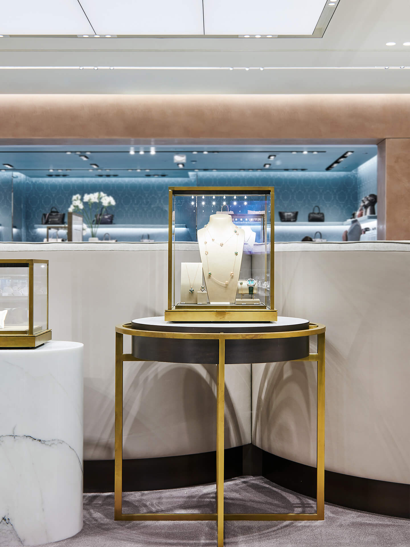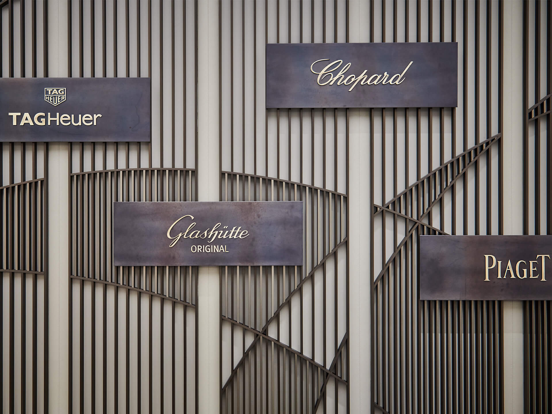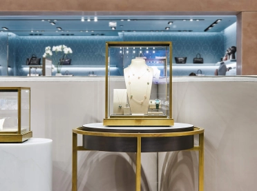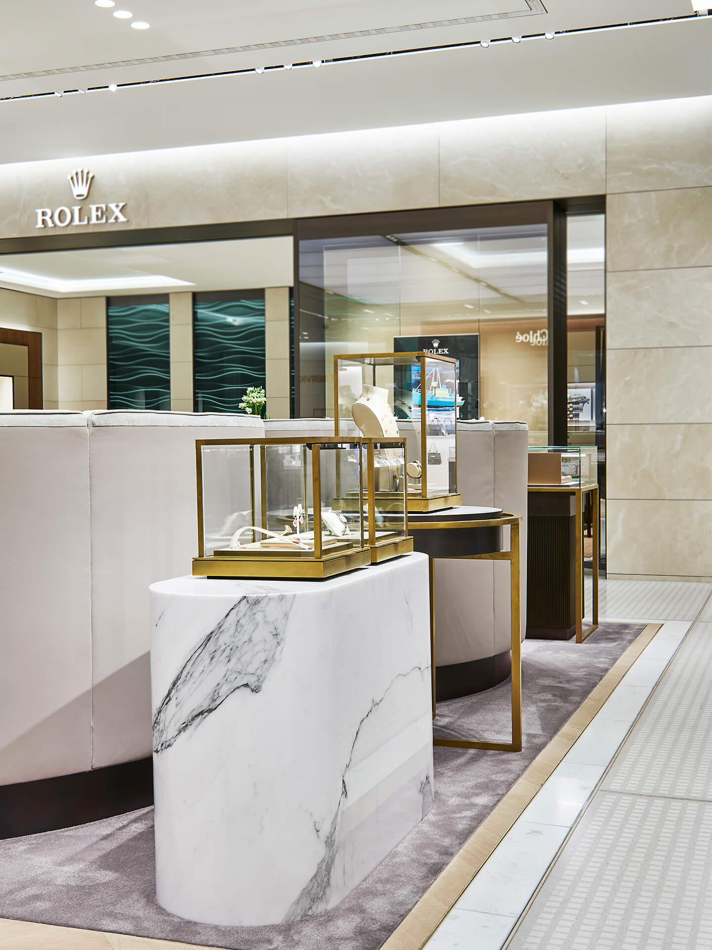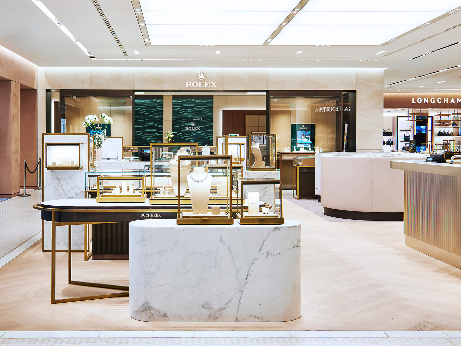 Das luxuriöse Ambiente in den beiden Bereichen Uhren und Schmuck ist geprägt von Marmor und Eichenholzparkett. Die edle Ware wird auf Highlightstelen und Präsentationsmöbeln aus Marmor und Messing gezeigt, die Markensichtbarkeit ist durch integrierte Markentafeln gewährleistet. Einen Rückzugsort für das persönliche und vertrauliche Kundengespräch sowie die Anprobe bieten in beiden Bereichen Sitzinseln mit hohen Rückenlehnen. Die hohe Uhrenkompetenz Bucherers wird eindrucksvoll durch eine Backwall aus Metall und Leder in Szene gesetzt.