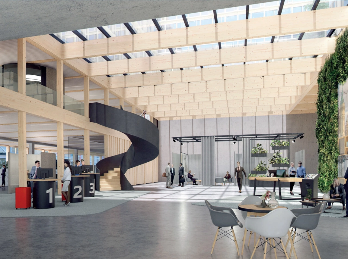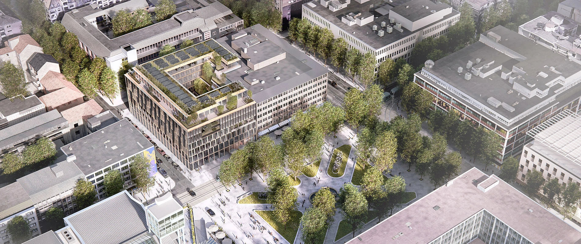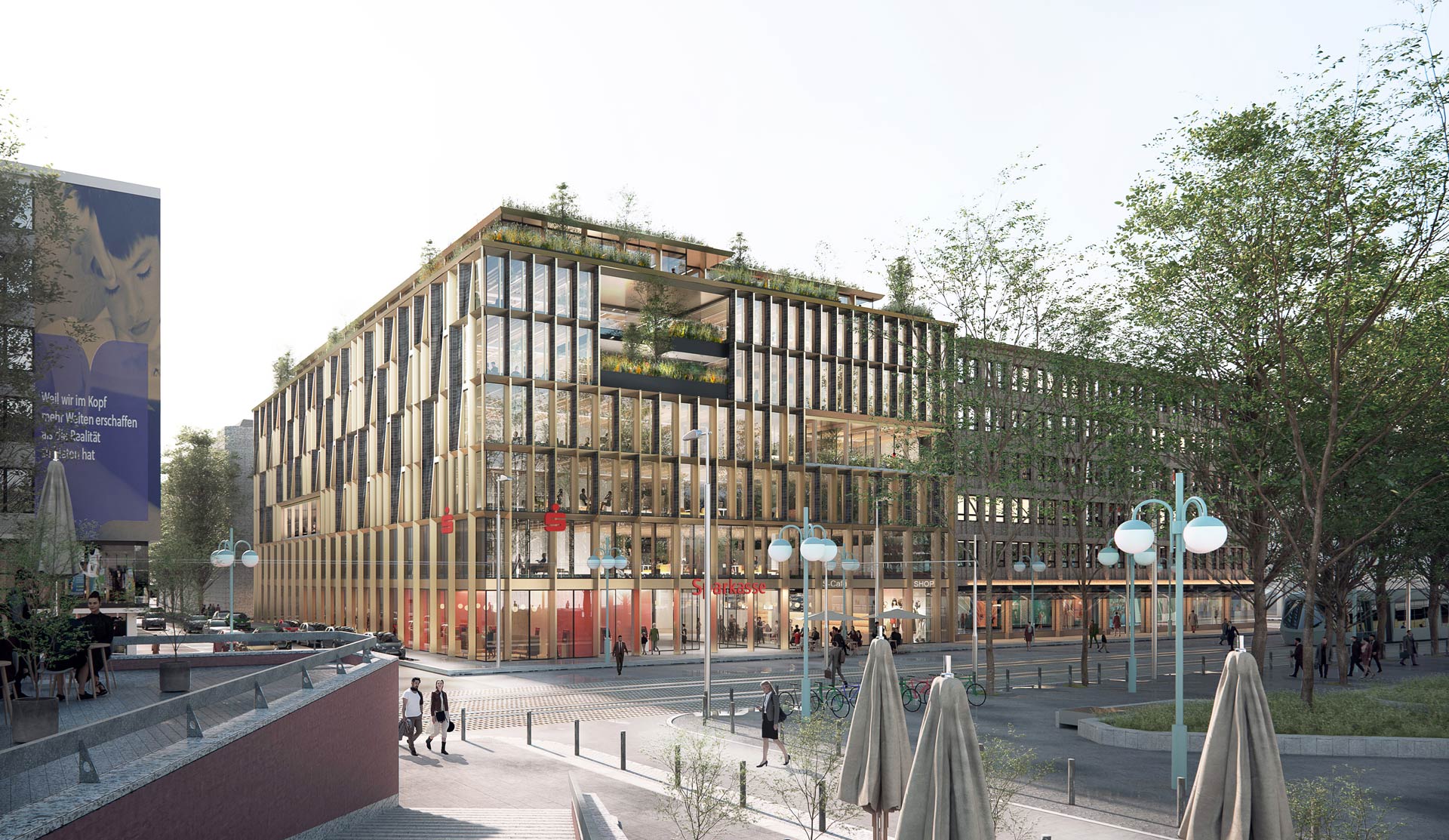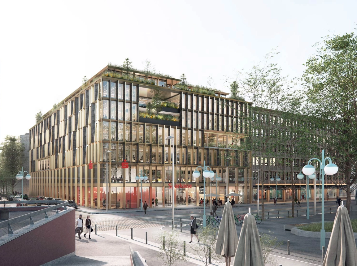 Für den geplanten Neubau der Sparkasse Rhein Neckar Nord am Paradeplatz im Herzen Mannheims haben die Architekten einen Entwurf entwickelt, der durch seine Ästhetik ebenso wie durch seine Nachhaltigkeit und Effizienz besticht. Erlebbar wird dies durch eine Holz-Hybridbauweise, die Fassadengestaltung und Grünbereiche. Im Mittelpunkt: der Mensch.