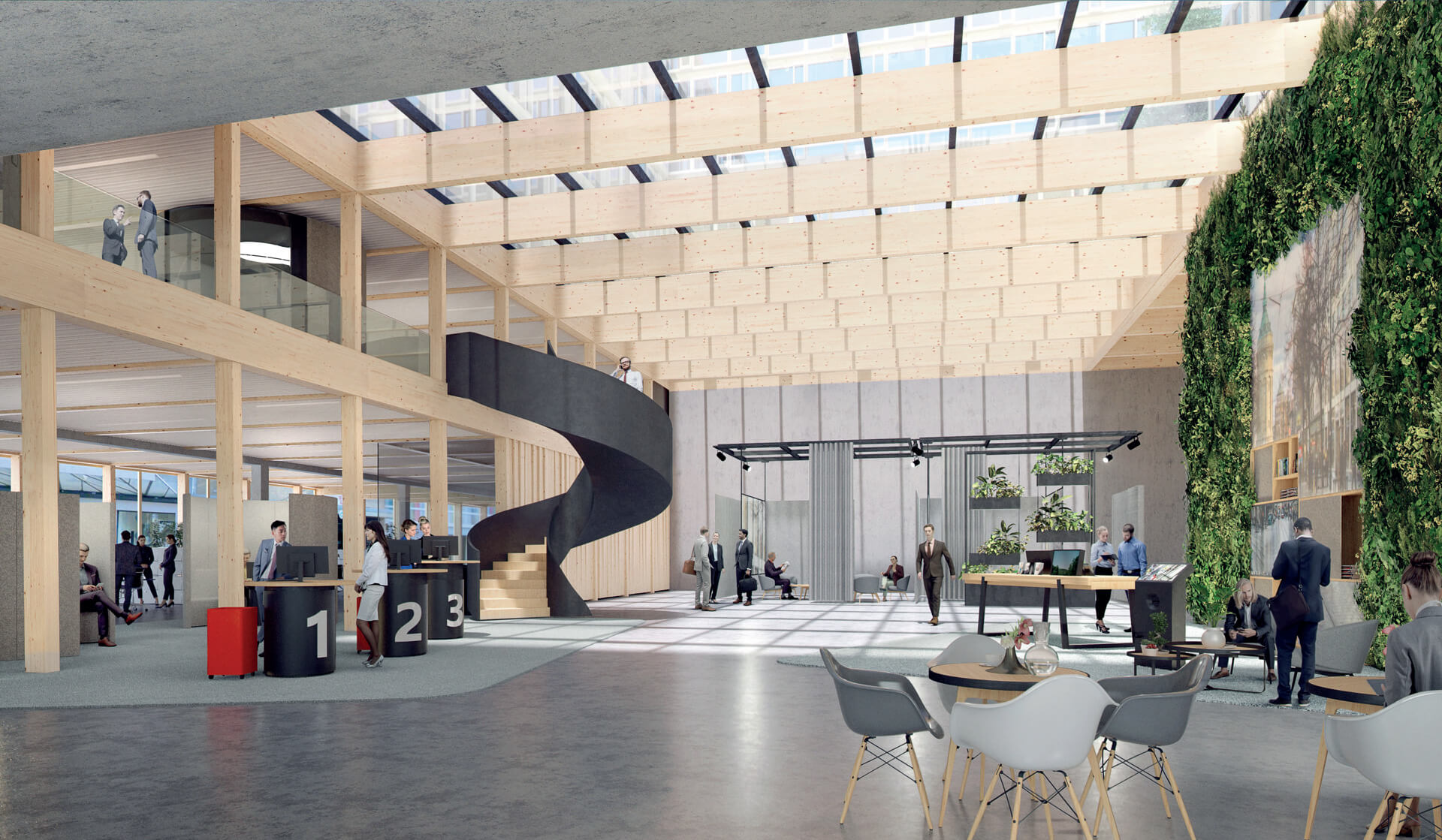 In der Umsetzung eines ökoeffizienten Designs spielen Konstruktion, Fassaden‐ und Energiekonzept optimal zusammen. Nach dem Cradle‐to‐Cradle‐Prinzip wird auf Materialwahl und Einsparung grauer Energie geachtet sowie hohen Wert auf Wiederverwendbarkeit der einzelnen Elemente gelegt. Für die tragende Struktur des Neubaus wird eine Holz‐Hybridbauweise vorgeschlagen. Die Geometrie der Fassadenpaneele, die zu 60% aus Photovoltaik‐Elementen bestehen, wurde über den unterschiedlich hohen solaren Eintrag entwickelt. Loggien brechen bewusst das regelmäßige Raster der Fassade und bieten durch ihre Begrünung eine hohe Aufenthaltsqualität auf den Terrassen. Das innovative Klima‐ und Energiekonzept für den Bürokomplex senkt durch eine optimierte Gebäudehülle sowie einfache und effiziente Lüftungs‐ und Raumklimakonditionierungssysteme den Gesamtenergiebedarf signifikant und schafft gleichzeitig optimierten Komfort für die Nutzer.