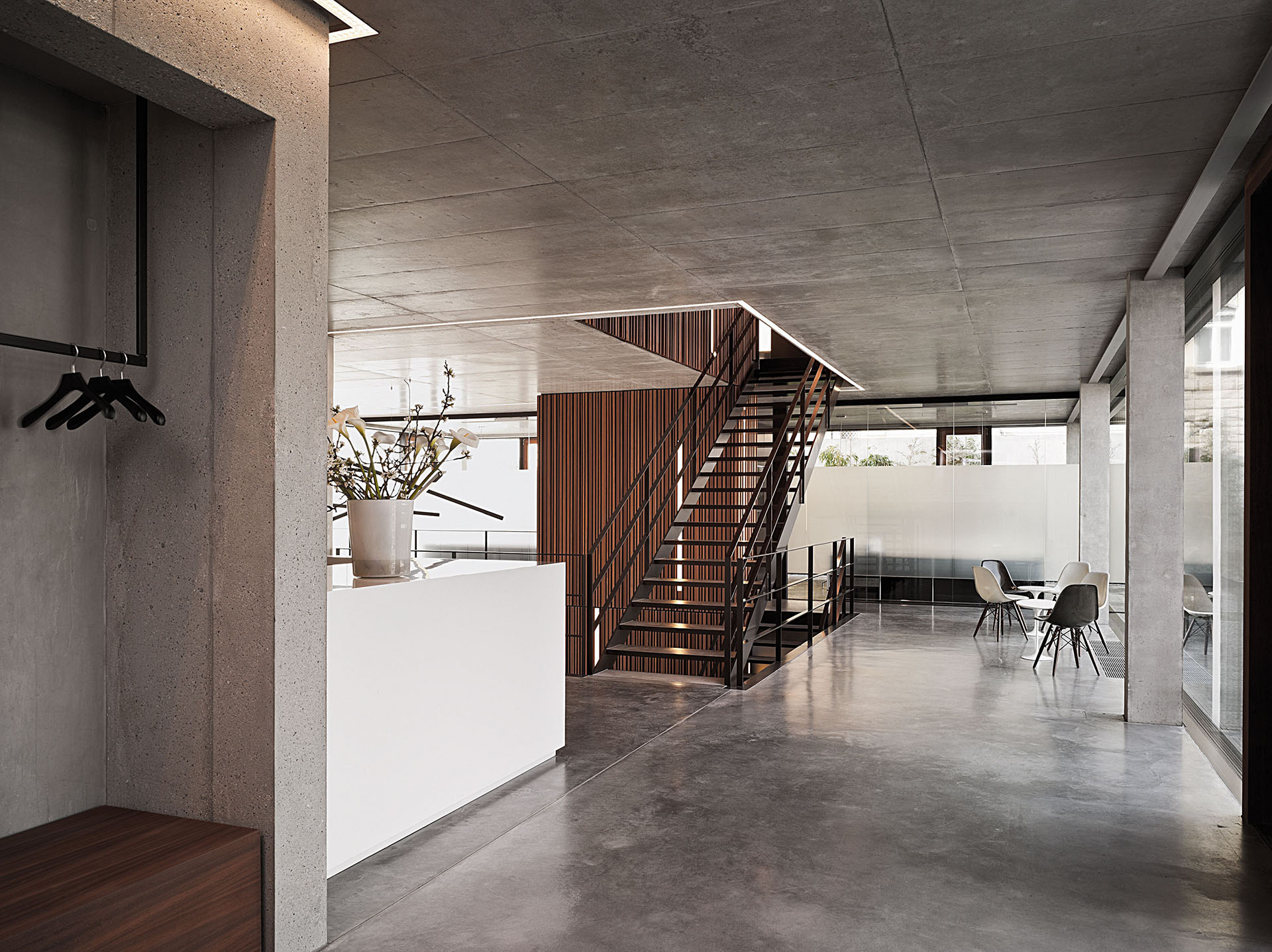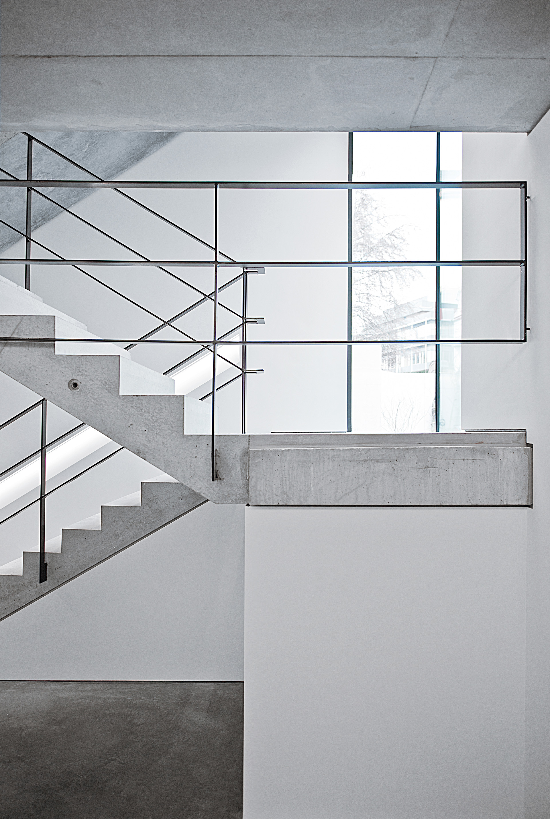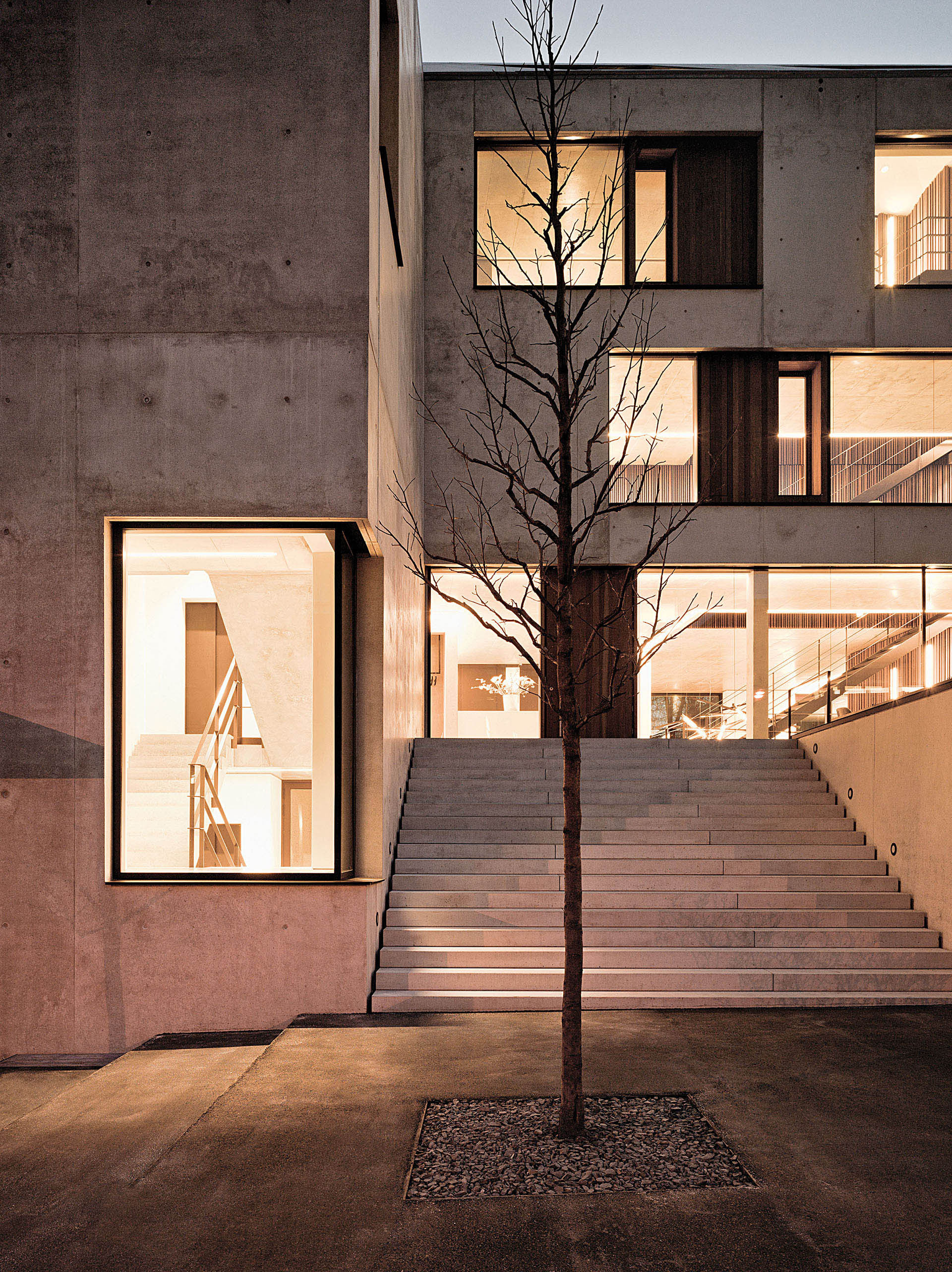 Das Bürogebäude besteht aus drei Vollgeschossen, einem Garten-, einem Dach- sowie einem Untergeschoss. Die Schlichtheit der inneren Gestaltung mit den sandgestrahlten Flächen aus Beton und Sichtbeton sowie dem Bodenbelag aus Zement-Estrich steht im Gleichklang mit dem äußeren Auftritt.