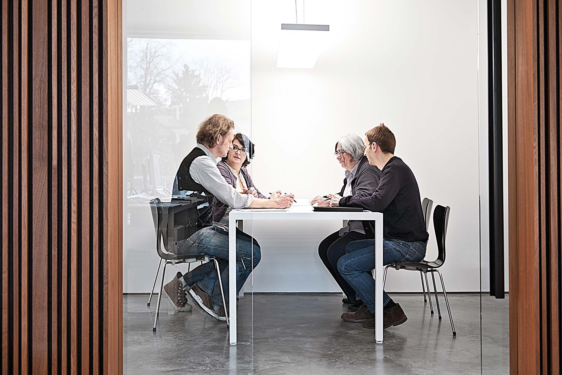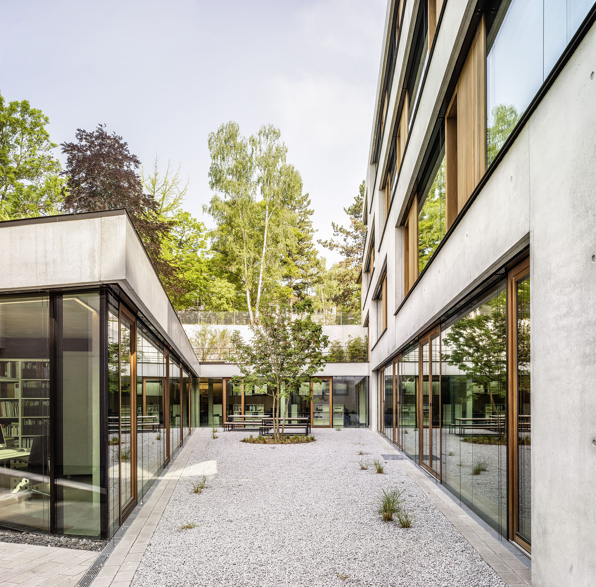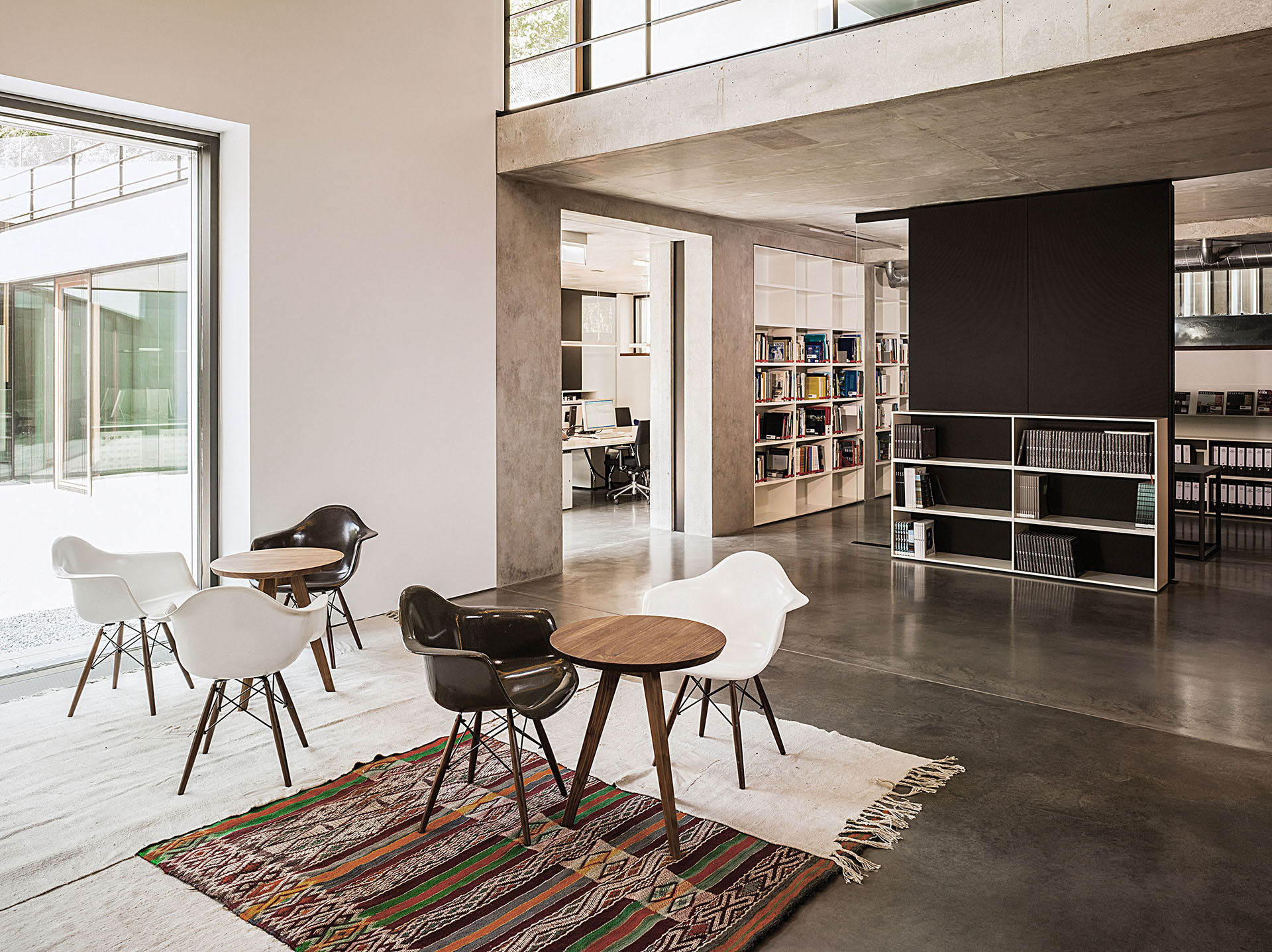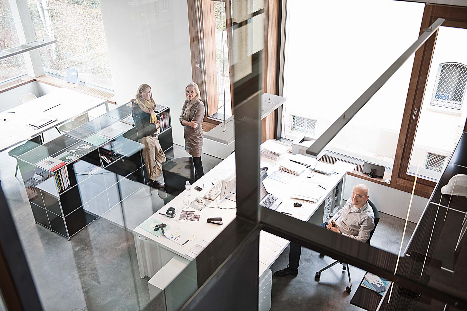 Das Bürogebäude besteht aus drei Vollgeschossen, einem Garten-, einem Dach- sowie einem Untergeschoss. Die Schlichtheit der inneren Gestaltung mit den sandgestrahlten Flächen aus Beton und Sichtbeton sowie dem Bodenbelag aus Zement-Estrich steht im Gleichklang mit dem äußeren Auftritt.