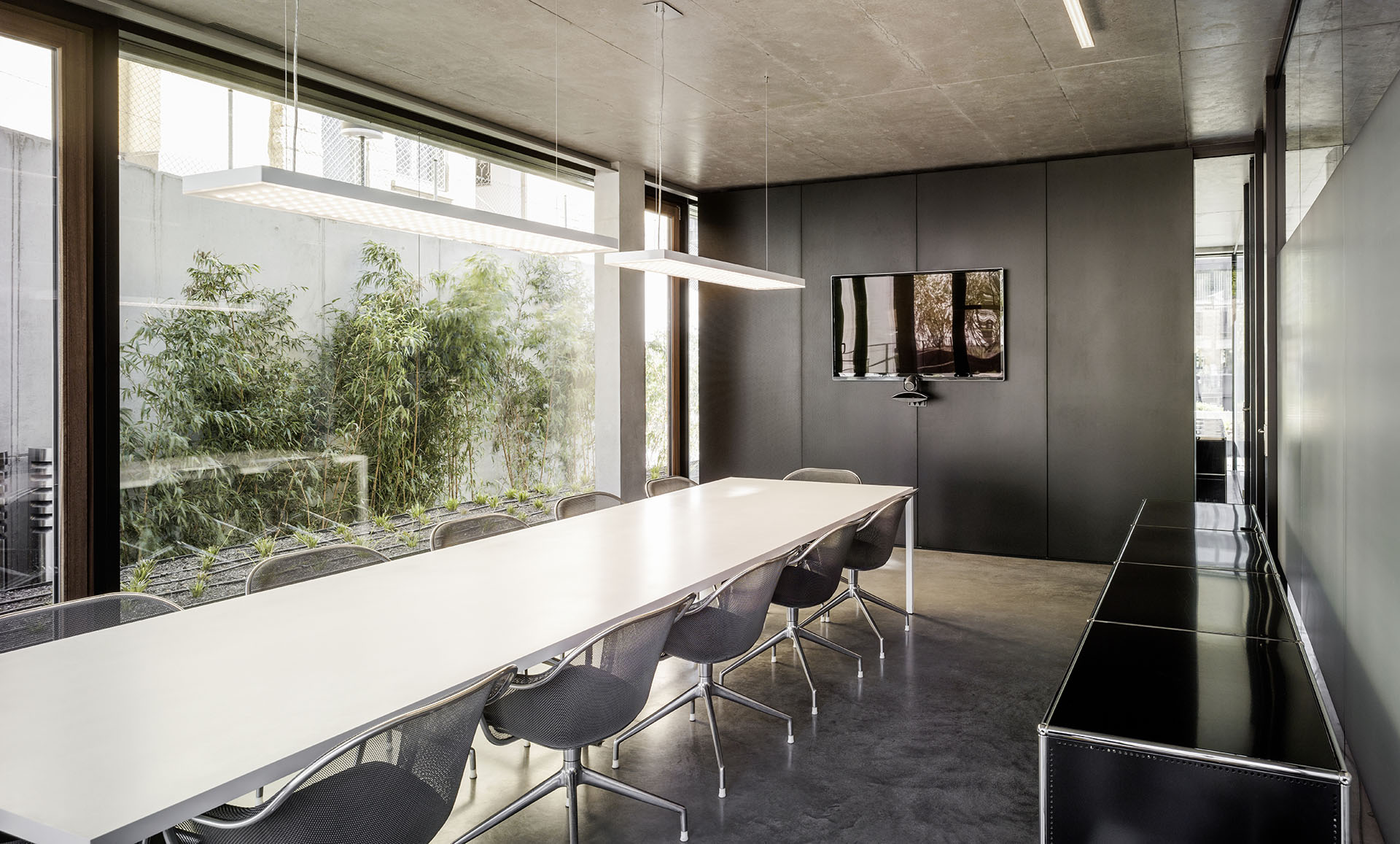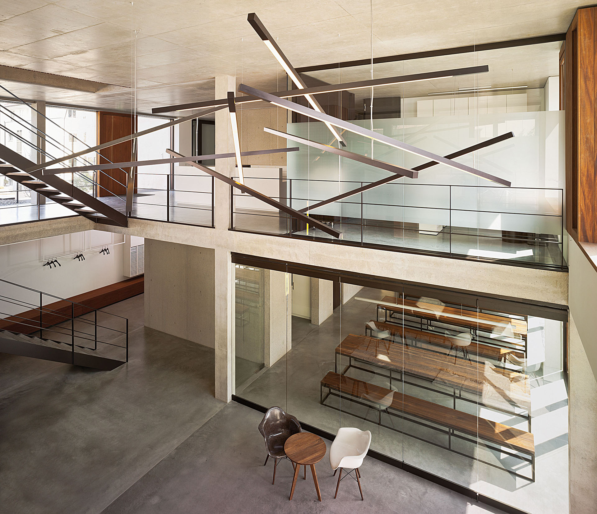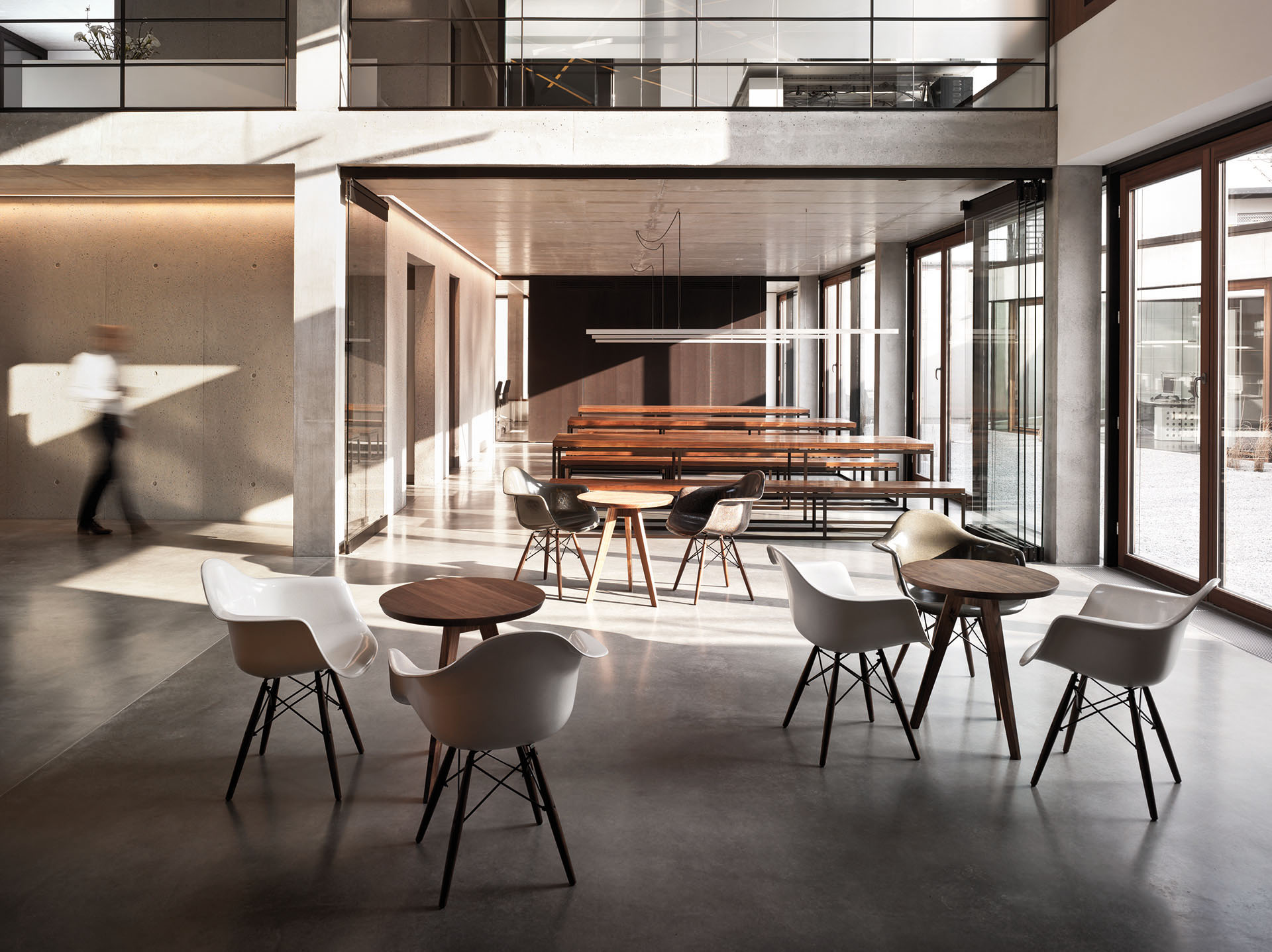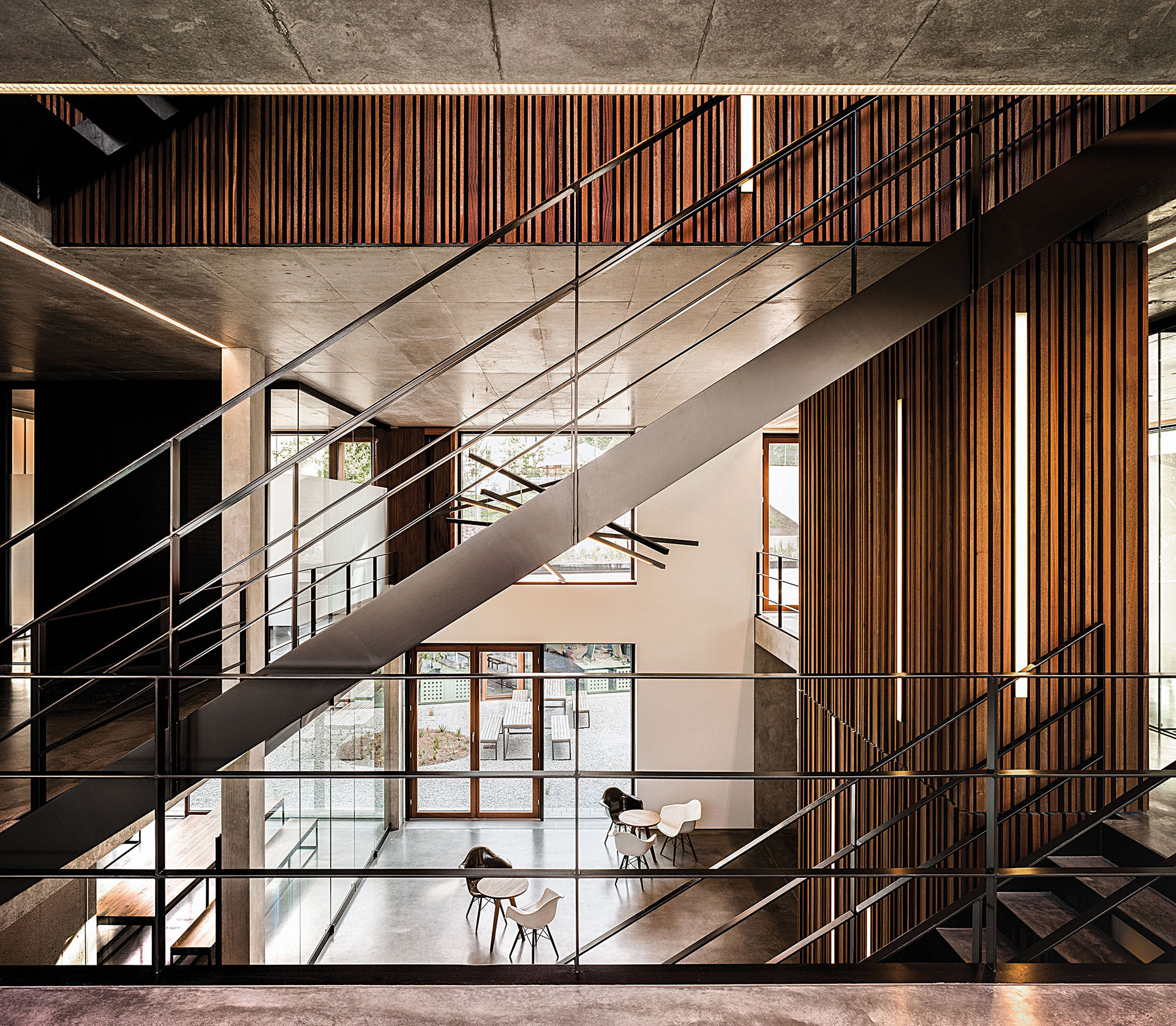 Die offene, dennoch klare Raumaufteilung lässt die Grenzen zwischen den Arbeitsbereichen verschwinden. An das großzügige Casino im Gartengeschoss dockt ein möblierter Innenhof an. Auf der einen Seite wird er von dem eingeschossigen Gebäudeflügel flankiert. Auf der anderen Seite öffnet sich ein zweigeschossiges Atrium, das nur eine verschiebbare Glaswand vom Casino trennt. Überhaupt das Atrium: Vom Erdgeschoss aus überfliegt das Auge den beeindruckenden Luftraum, in dem eine vom Mikadospiel inspirierte Licht-Installation hängt. Auch von der offen gestalteten Stahltreppe, die vom Gartengeschoss bis unters Dach reicht, ergeben sich vielfältige Blickbezüge.