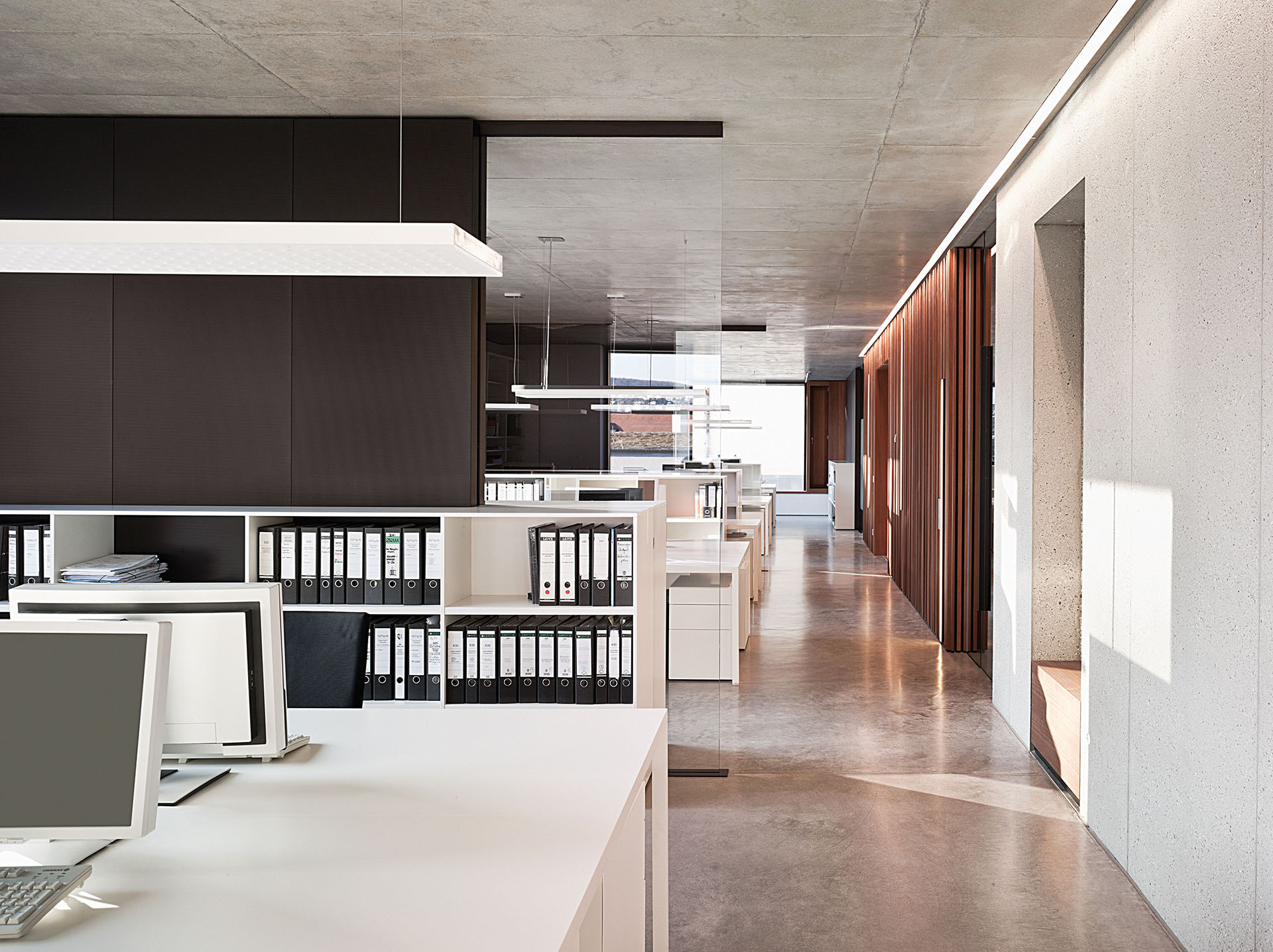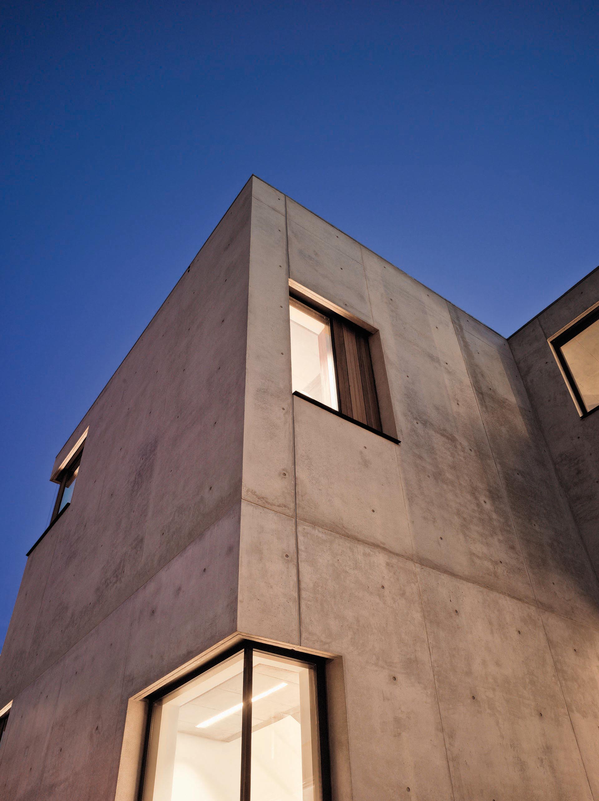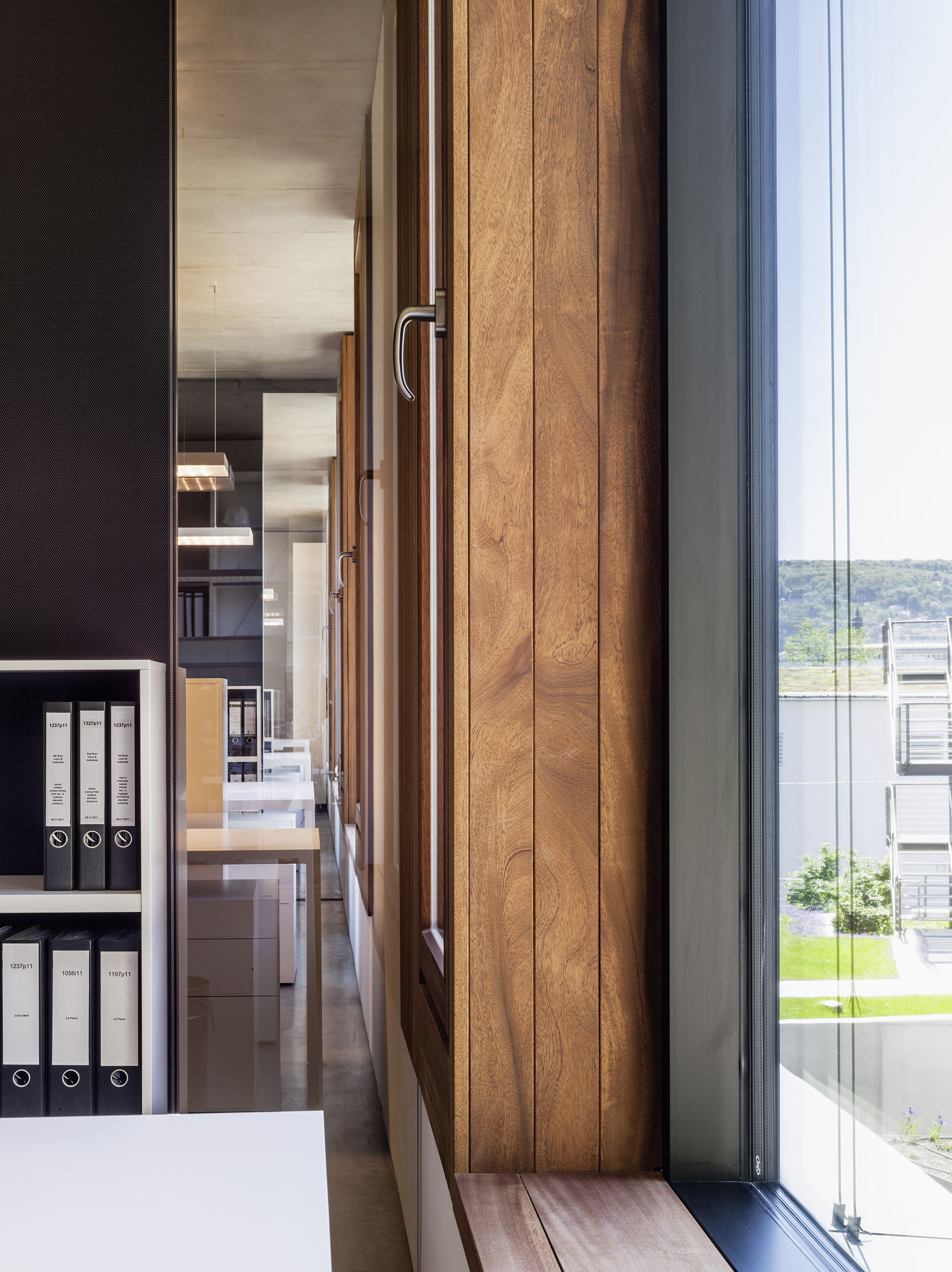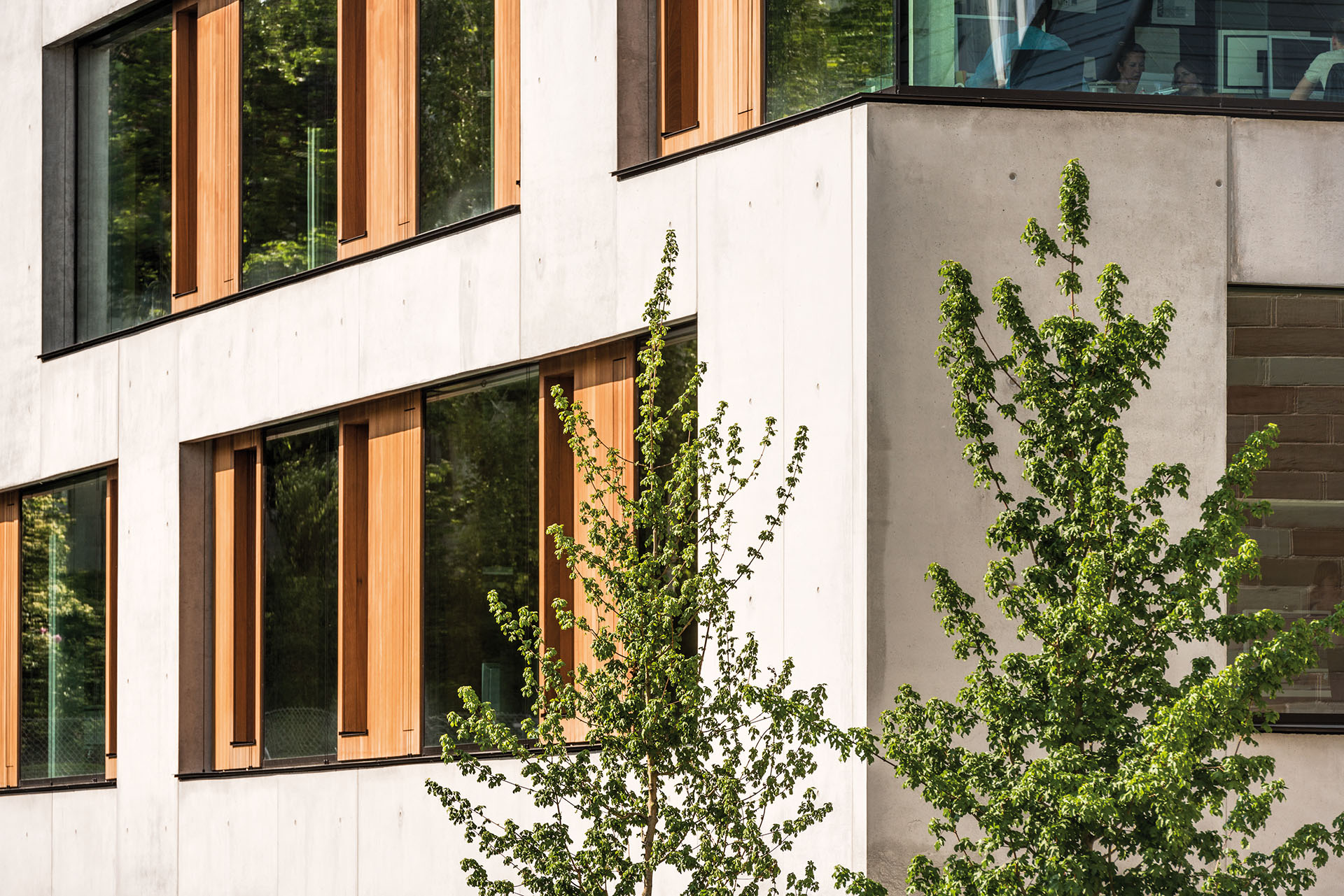 Ein Blickfang, der Passanten und Autofahrer gleichermaßen in seinen Bann zu ziehen vermag. Dem robusten Charme des Sichtbetons – als zweischalige Betonfassade mit Kerndämmung ausgeführt – schmeichelt die ätherische Transparenz großzügiger Fensterbänder. Holzelemente aus Sipo Mahagoni gliedern übergeordnet und geben der Fassade Tiefe. Die klaren Linien bringen sowohl Ordnung als auch Dynamik in die Fassade. Der Glasanteil entspricht der von der DGNB für die Platin-Zertifizierung vorgeschriebenen Größe, gleichzeitig verringern die Holzkuben optisch den geschlossenen Anteil der Hülle und „schlucken“ den Schall.