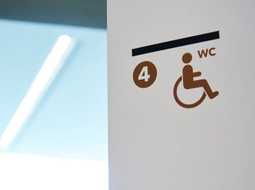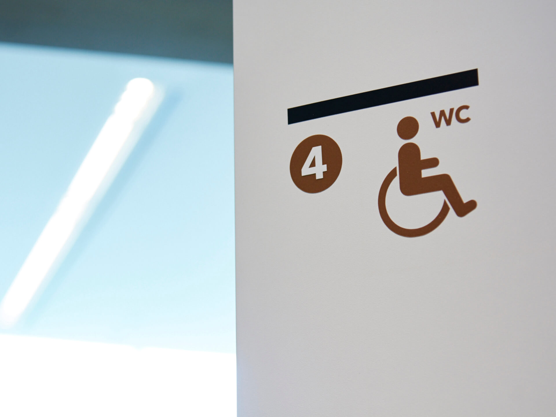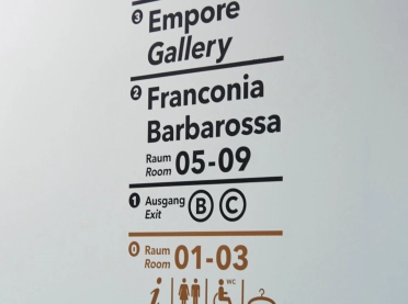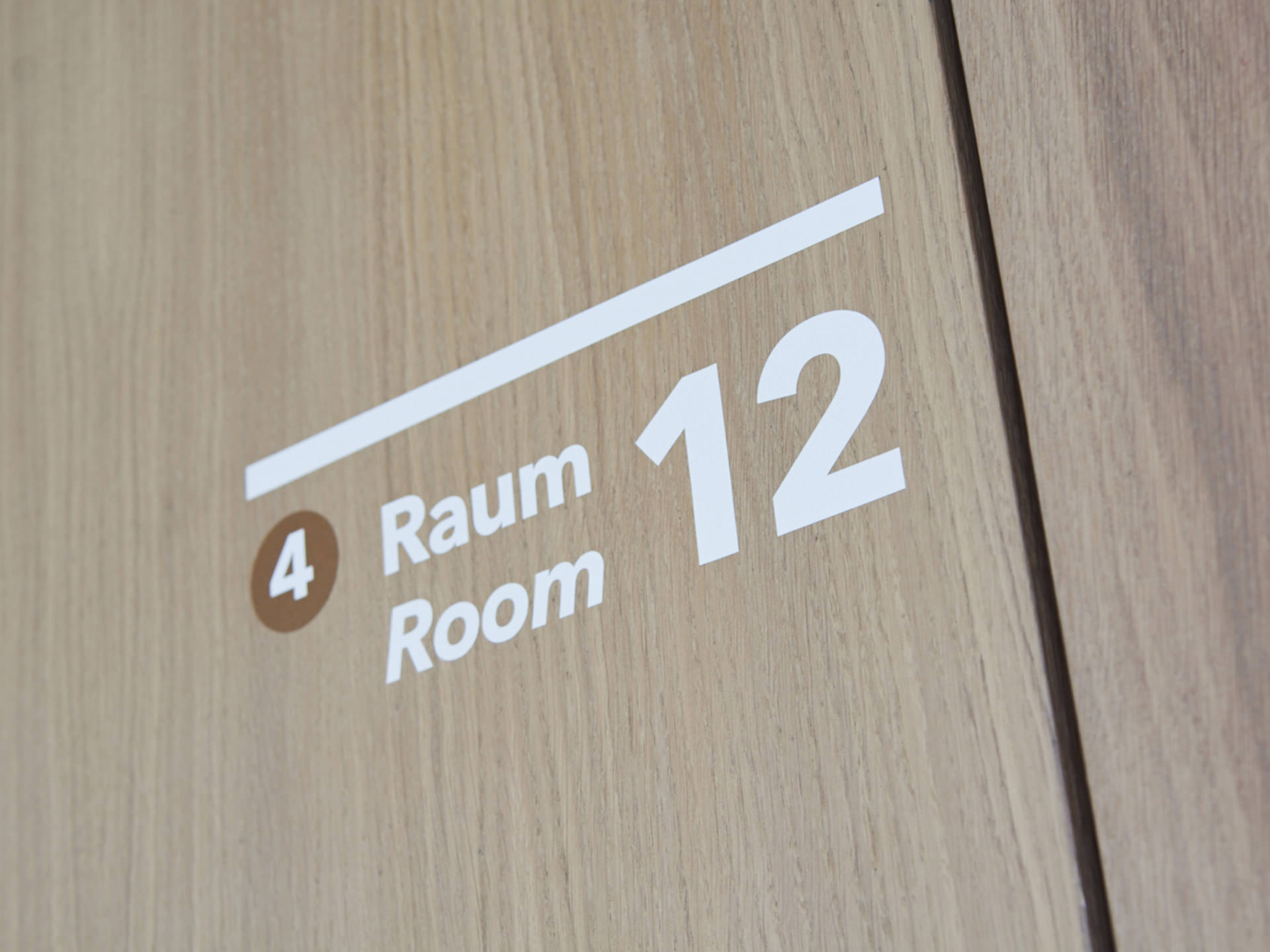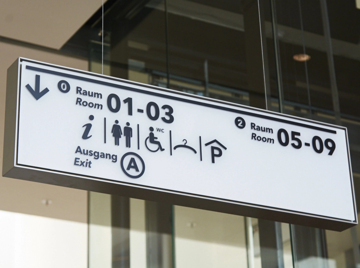 Die Maßnahmen reichen von der Bespielung von Stelen im Außenbereich und der Markierung der vier Eingänge bis zu Übersichtstafeln in den Foyers, abgehängte Wegweiser und Raumkennzeichnungen. Alle Konferenzräume wurden durch Monitore komplettiert, auf denen aktuelle und folgende Veranstaltungen digital angezeigt und ohne Aufwand geändert werden können.