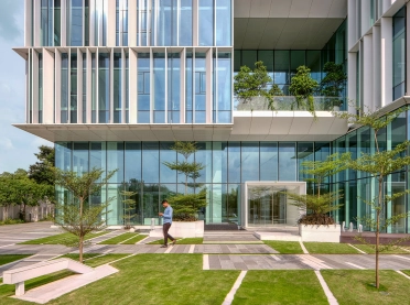 Pflanzen sind integraler Bestandteil des Entwurfs: Sie kommen entlang der Fassade sowie im Inneren zum Tragen, erzeugen ein angenehmes Raumklima und stellen starke Bezüge zur Umgebung her. Hochwertige Materialien wie Marmor, Teakholz aus zertifiziert umweltfreundlichem Anbau sowie Messing geben den gestalterischen Ton an, der Luxus und Freundlichkeit miteinander verbindet. Offene, helle Flure mit Balkonen, großzügige Büroräume mit Raumteilern aus Milchglas und akustisch aktive Materialien sorgen für eine angenehme Arbeitsumgebung.