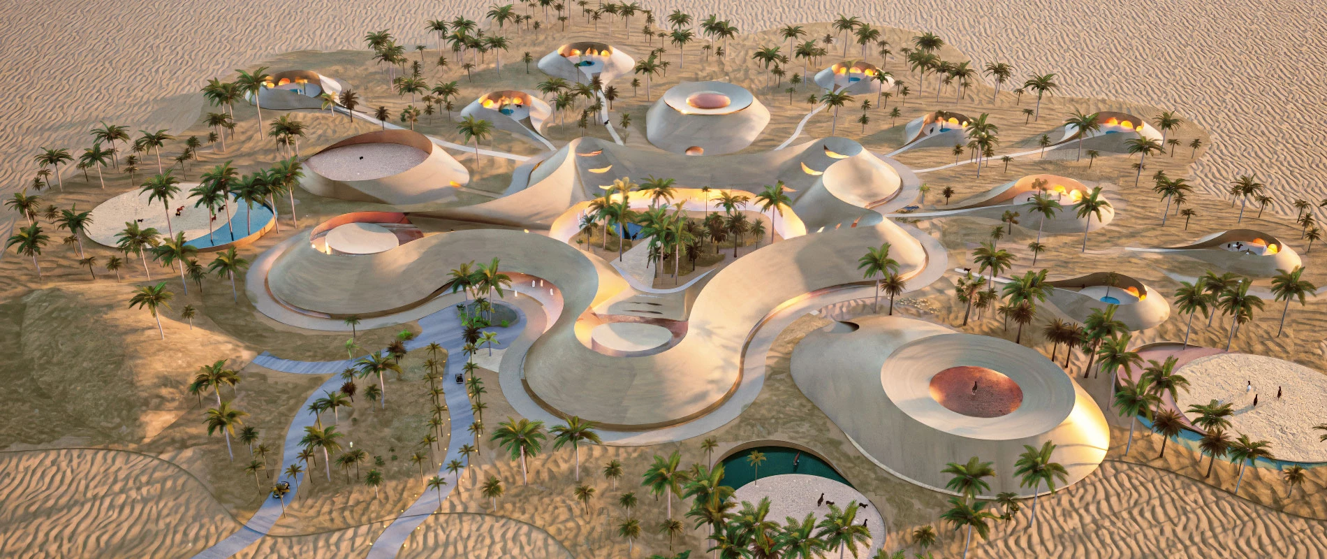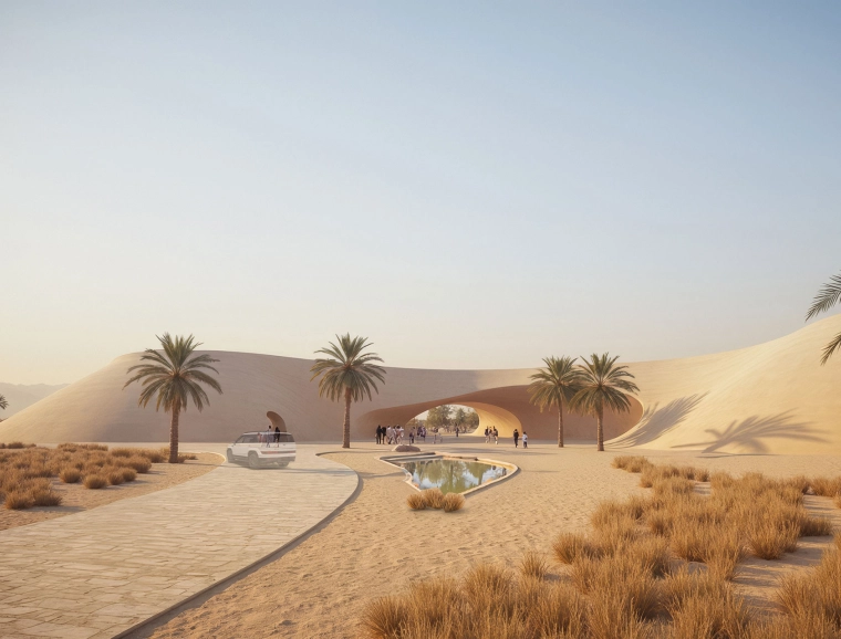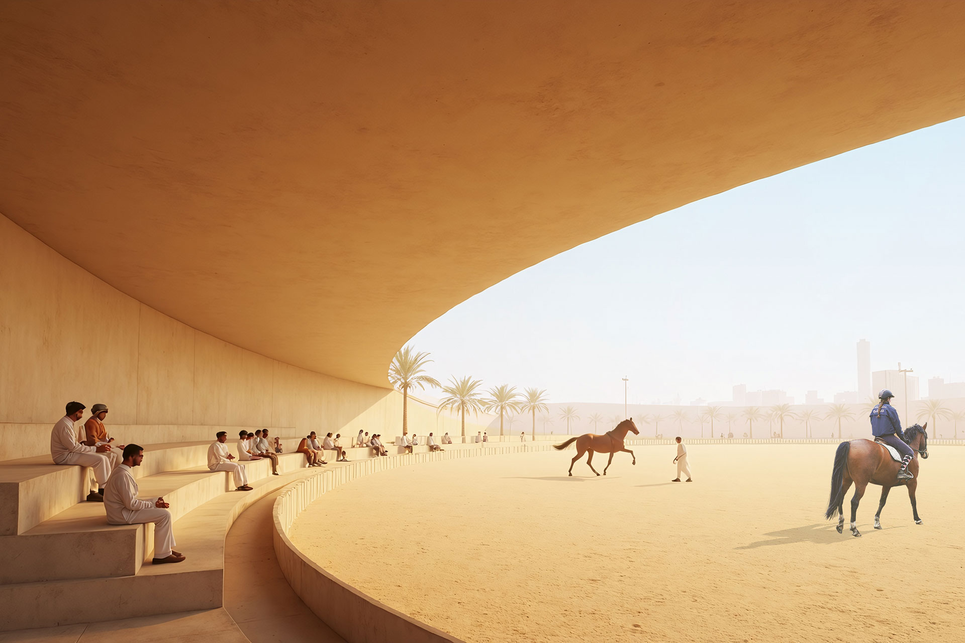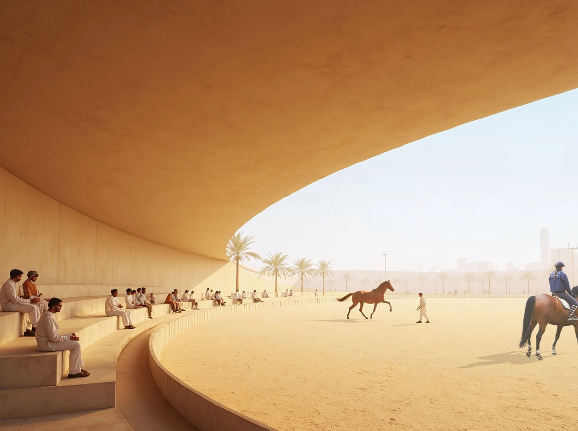 Ein Reitsportzentrum wird zur kulturellen Landschaft. Das geplante Lifestyle-Resort in der katarischen Wüste entwickelt seine Architektur aus Bewegung und Raumgefühl. Wege orientieren sich an natürlichen Spuren, Gebäude erscheinen wie geformt vom Wind. Zwei Konzepte prägen das Bild. Während »Desert Archipelago« organisch fließt, setzt »Inner Circle« auf klare Geometrie. Beide erzählen von Herkunft, Disziplin und Freiheit.