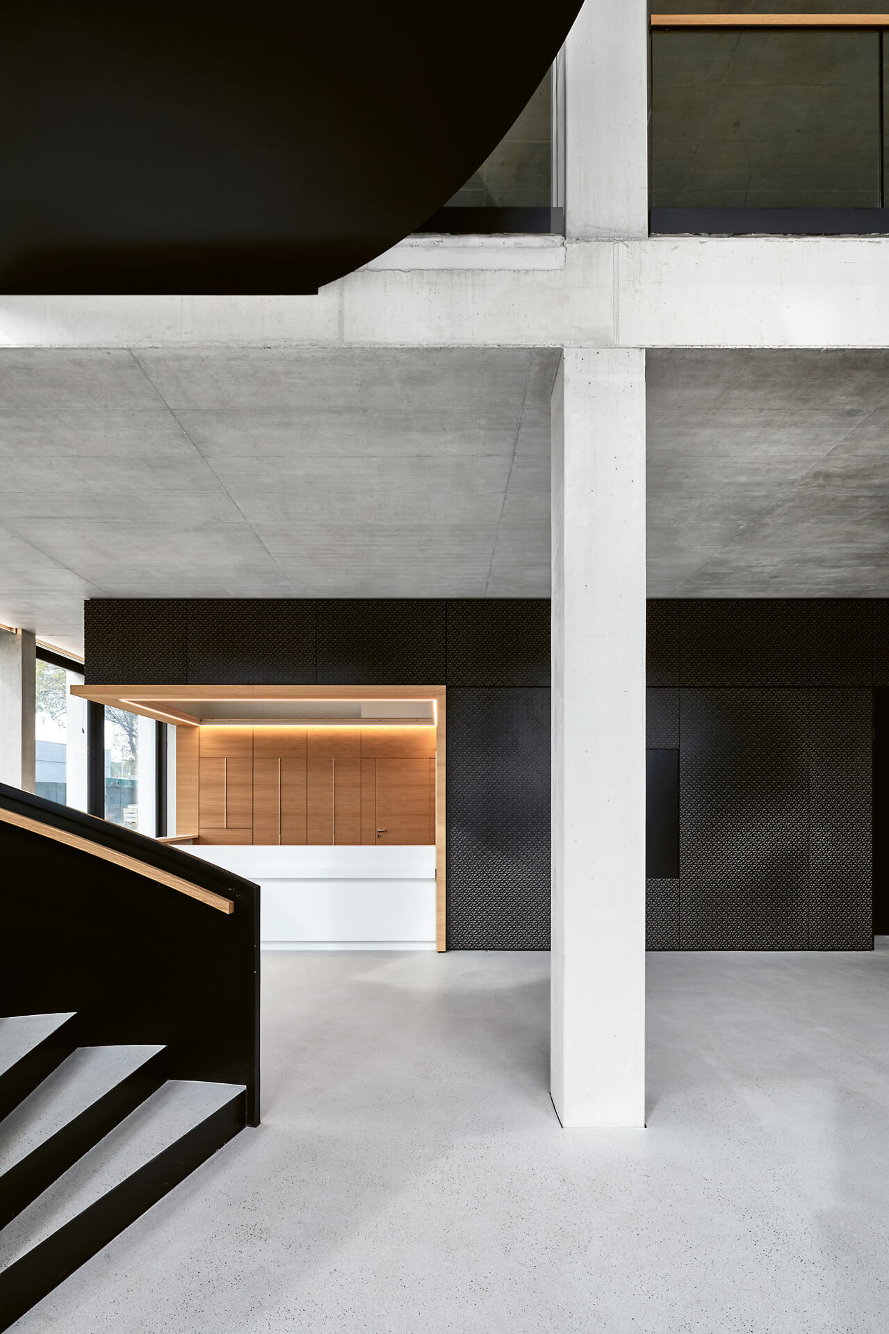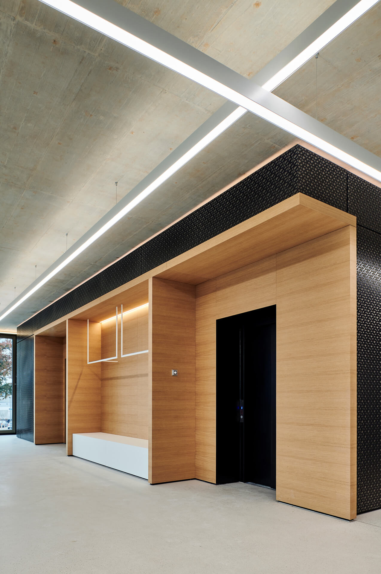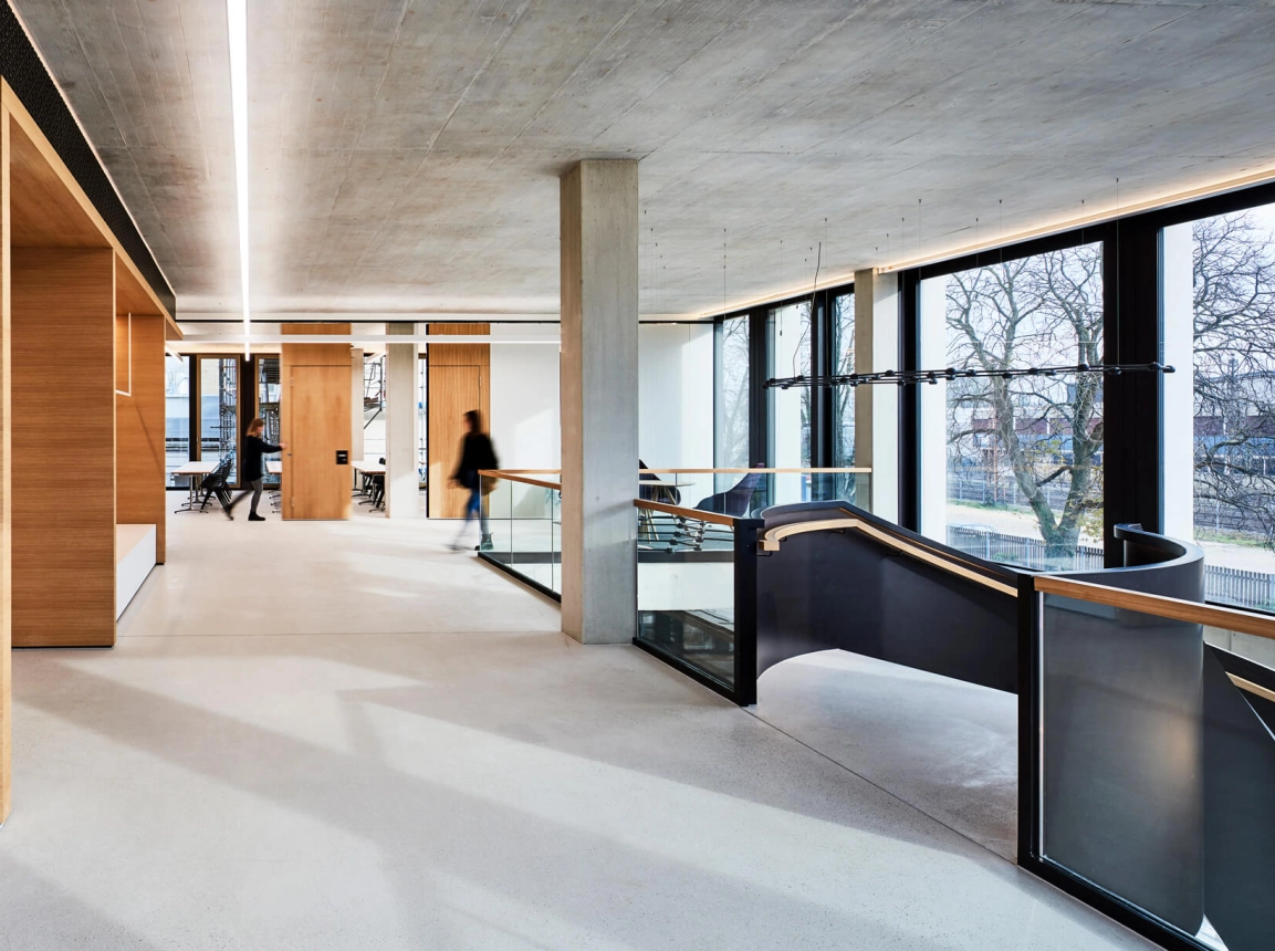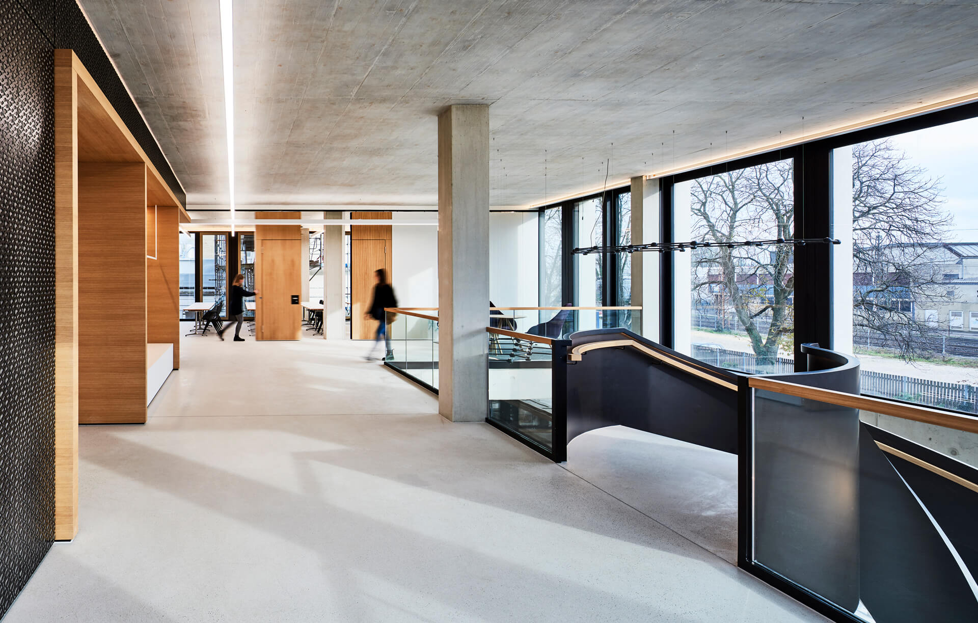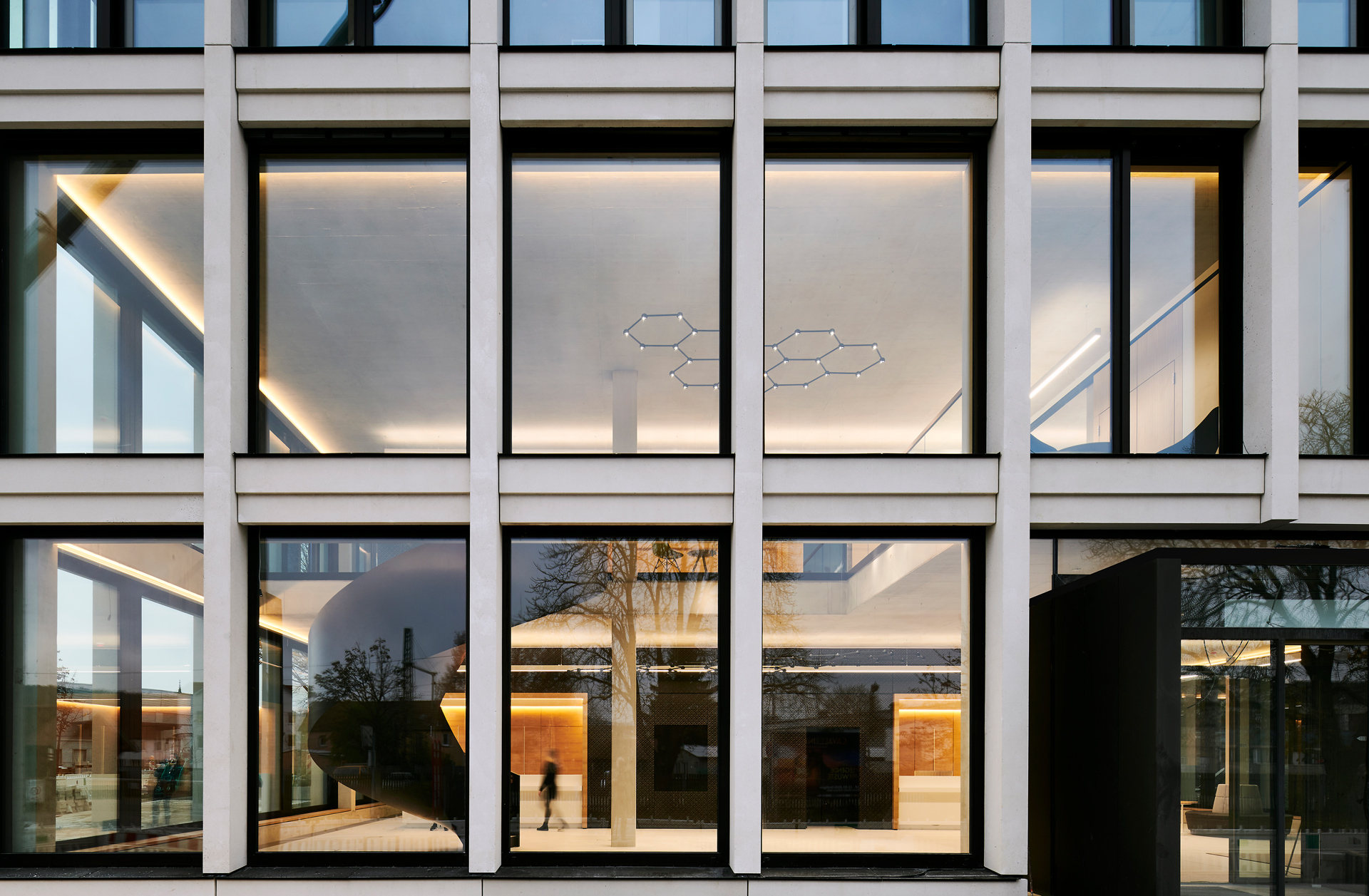 Der freistehende Solitär in Stahlbetonbauweise und einer raumhohen Elementfassade positioniert sich als prominenter Auftakt der zeilenartigen EVF-Häuser entlang der Großeislinger Straße. Den bodenständigen Charakter der EVF widerspiegelnd, charakterisiert eine kompakte, klare Struktur das Gebäude. Die Architektursprache ergibt sich dabei durch ein Spiel mit Dualitäten: Die klare, kubische Struktur des Gebäudes und von Sichtbeton geprägte Flächen im Innern stehen im Kontrast zu weichen Formen wie runden Sitznischen und Countern sowie der Wärme, die sich durch den punktuellen Einsatz von Holz ergibt.