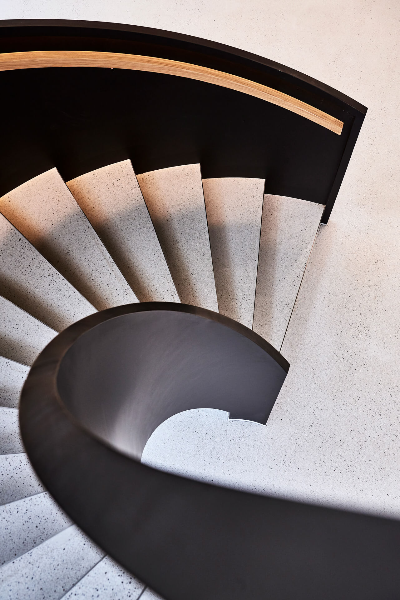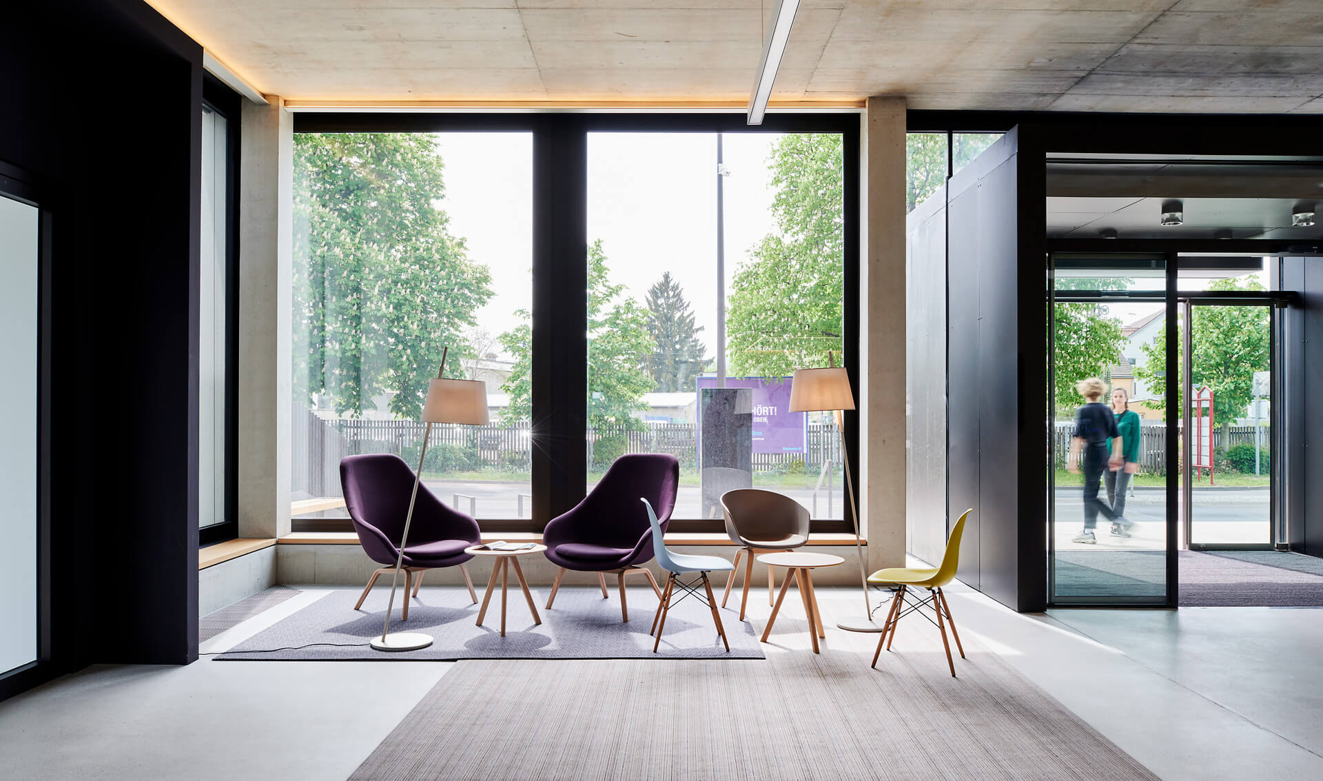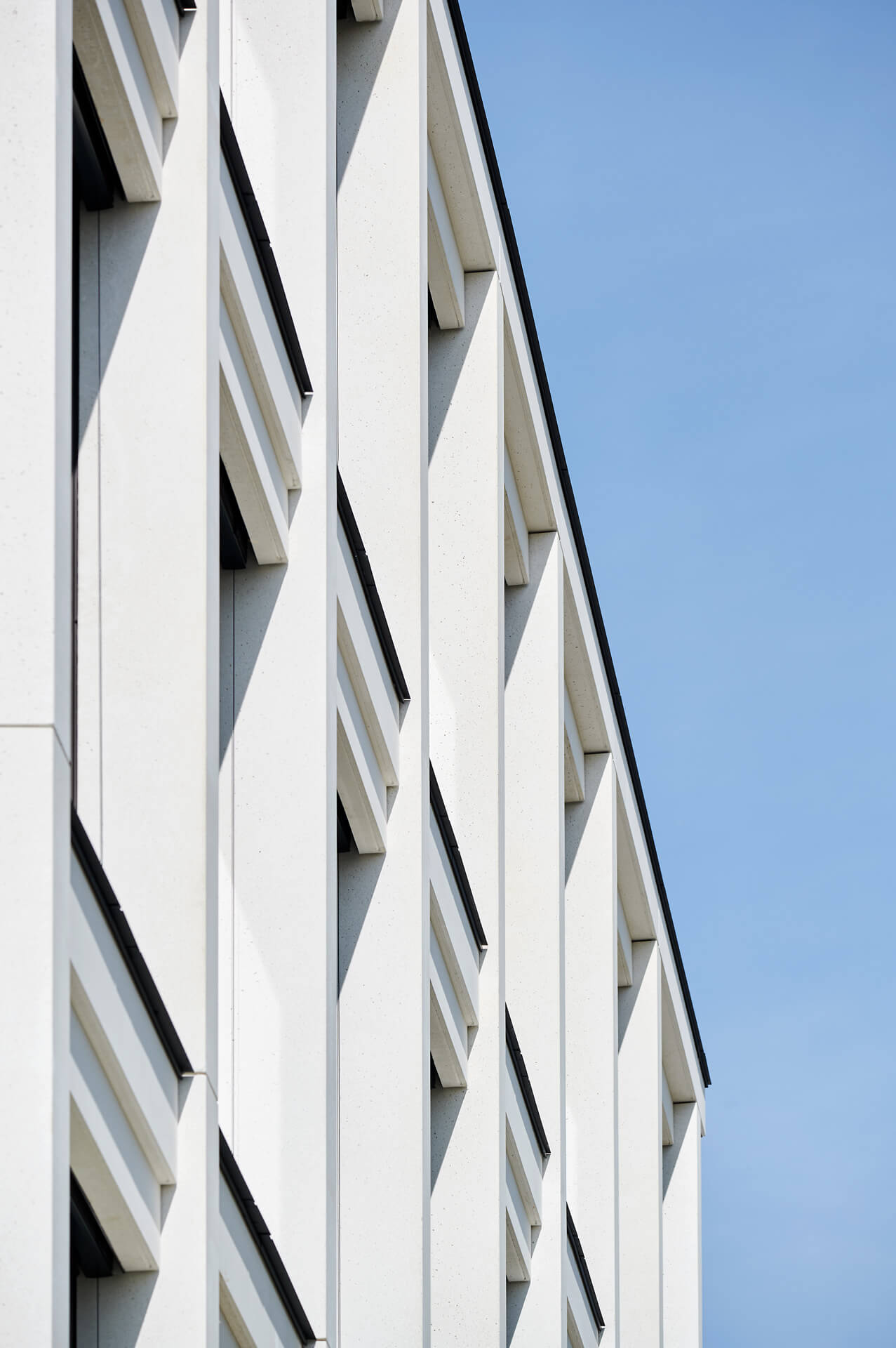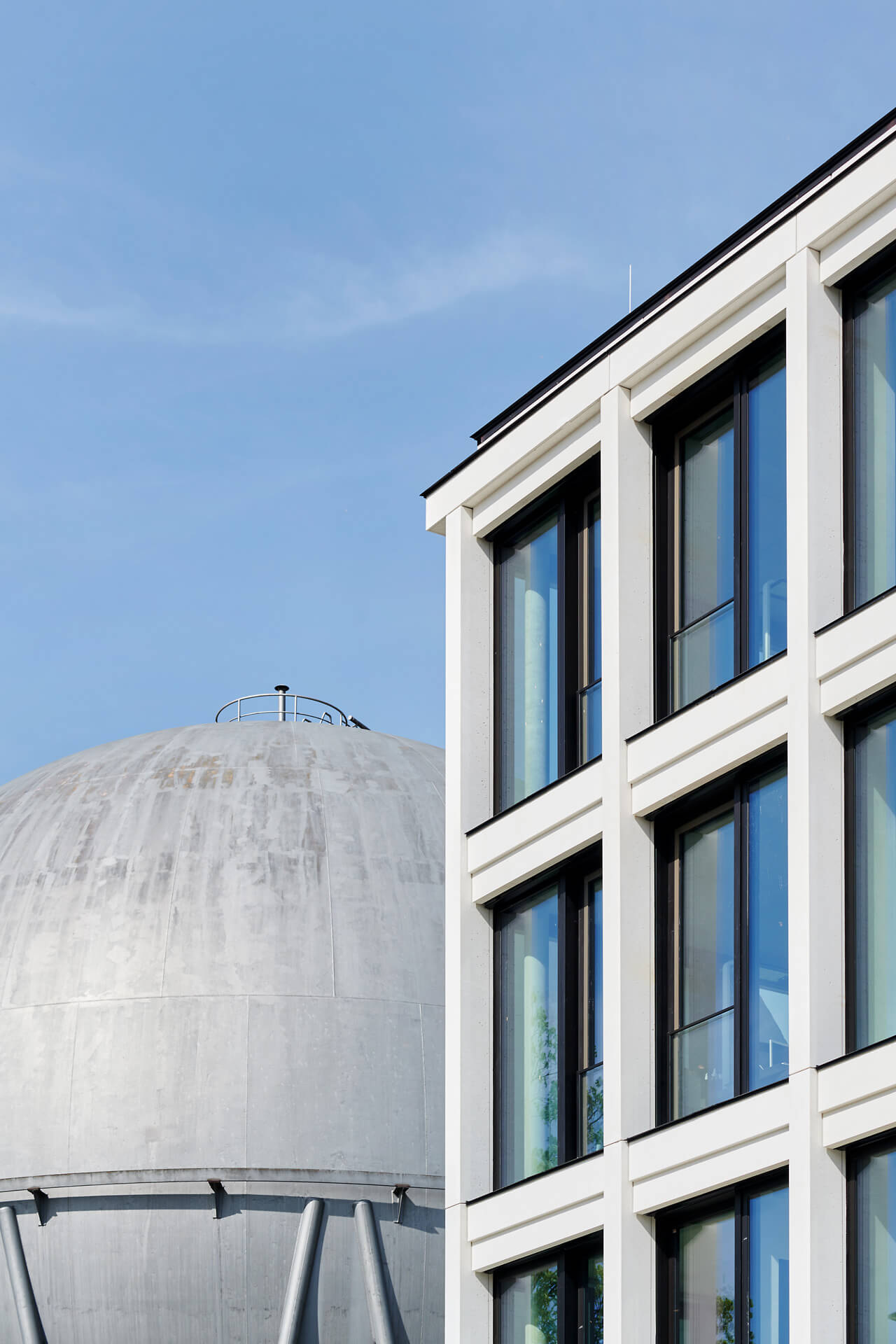 Der freistehende Solitär in Stahlbetonbauweise und einer raumhohen Elementfassade positioniert sich als prominenter Auftakt der zeilenartigen EVF-Häuser entlang der Großeislinger Straße. Den bodenständigen Charakter der EVF widerspiegelnd, charakterisiert eine kompakte, klare Struktur das Gebäude. Die Architektursprache ergibt sich dabei durch ein Spiel mit Dualitäten: Die klare, kubische Struktur des Gebäudes und von Sichtbeton geprägte Flächen im Innern stehen im Kontrast zu weichen Formen wie runden Sitznischen und Countern sowie der Wärme, die sich durch den punktuellen Einsatz von Holz ergibt.