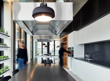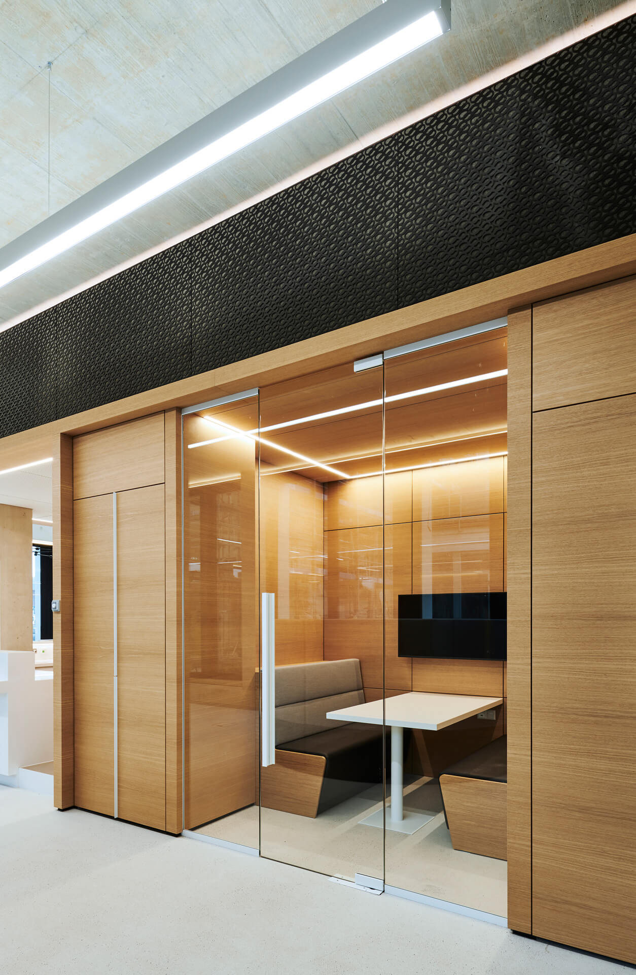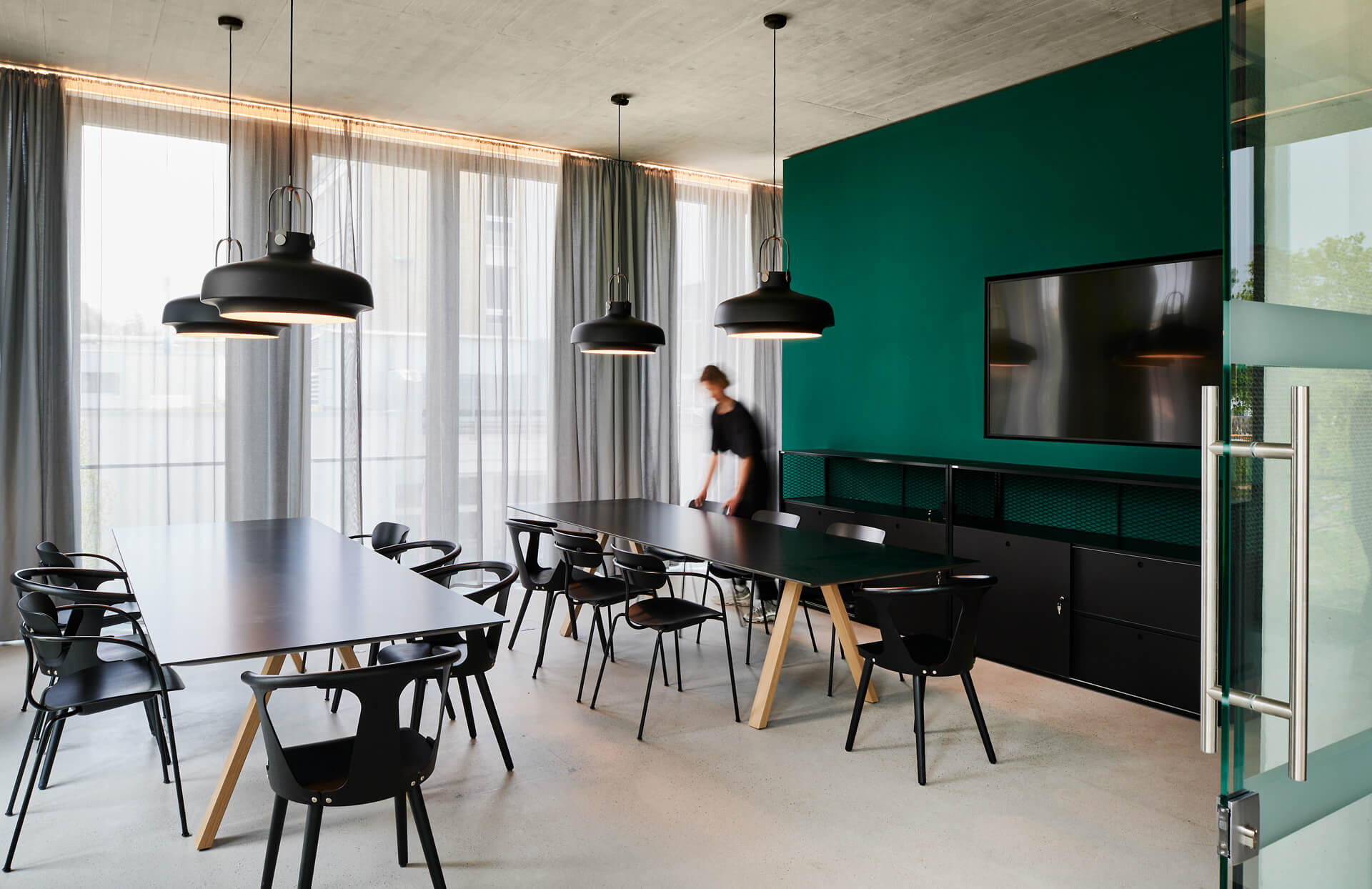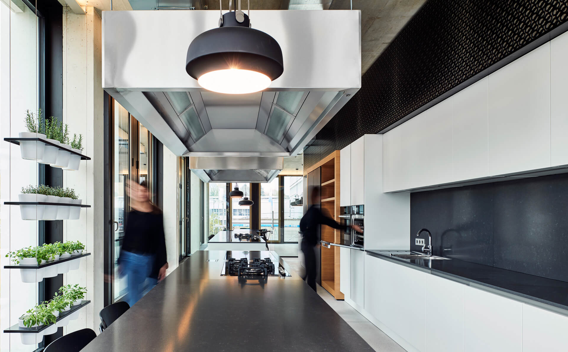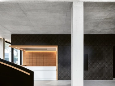Das offen gestaltete Erdgeschoss ist als Angebot an die Kunden zu verstehen, die EVF nicht nur als Dienstleister, sondern auch als Gastgeber wahrzunehmen. Neben den Countern finden sich deshalb Rückzugsräume, in denen durch Farb- und Formgebung der Materialien und Möbel eine vertrauliche Form geschaffen wurde. Eine weitere Einladung an die Kunden stellt die Showküche im ersten Stockwerk dar. Die dort regelmäßig stattfindenden Kochkurse unterstreichen die Nahbarkeit des Unternehmens und bieten ein konkretes Anwendungsfeld des Energieversorgers, der Strom und Gas als Lebensqualität versteht.